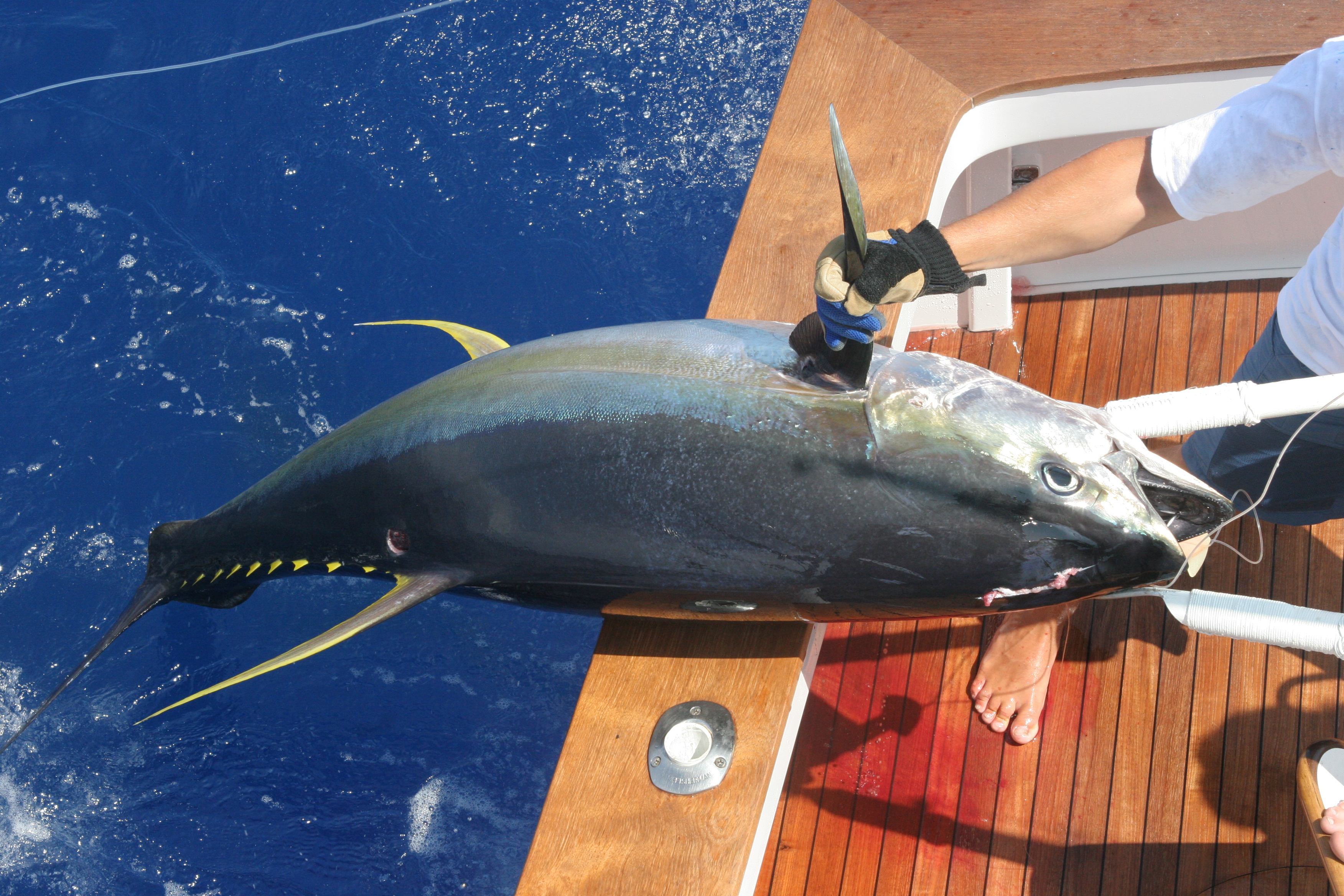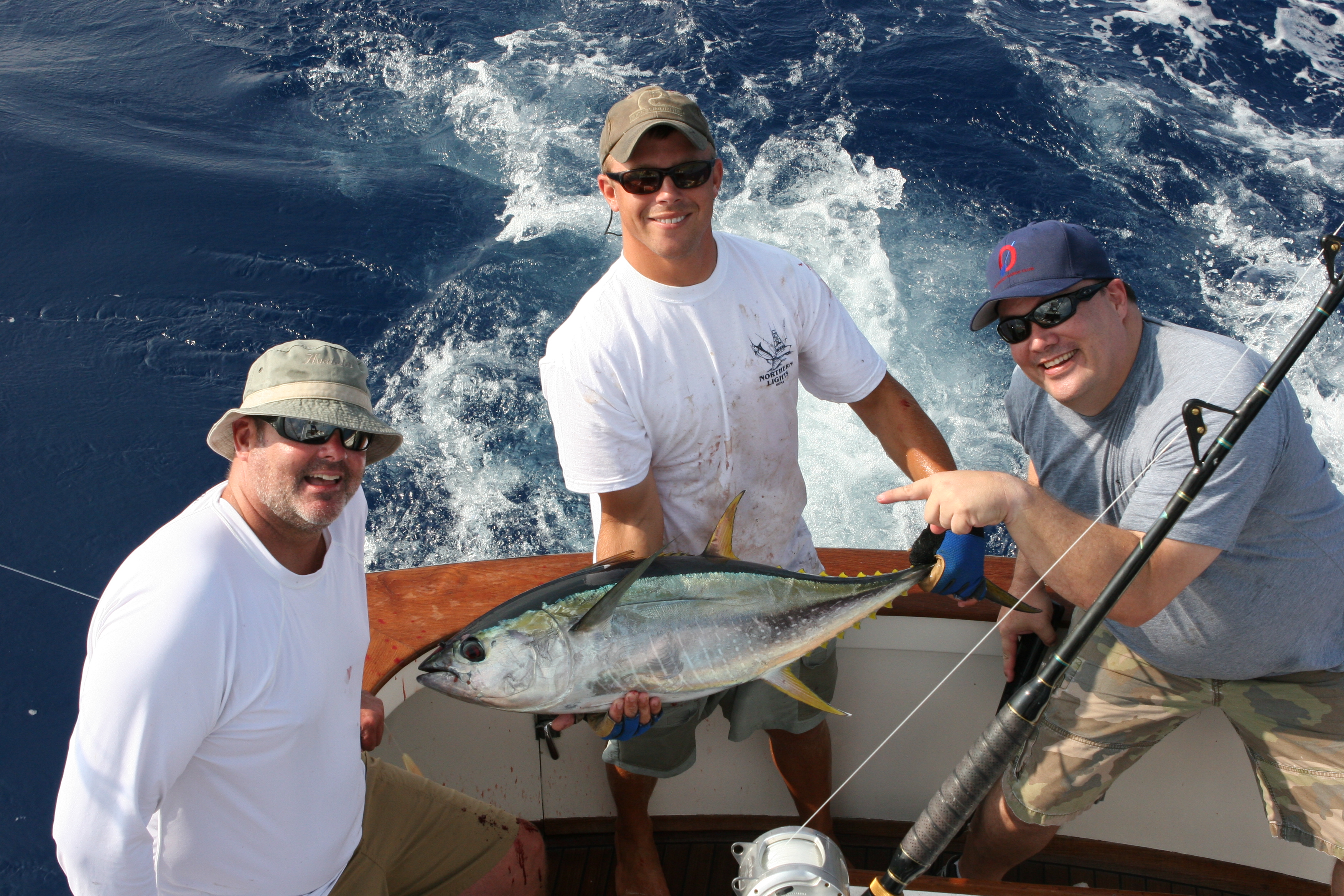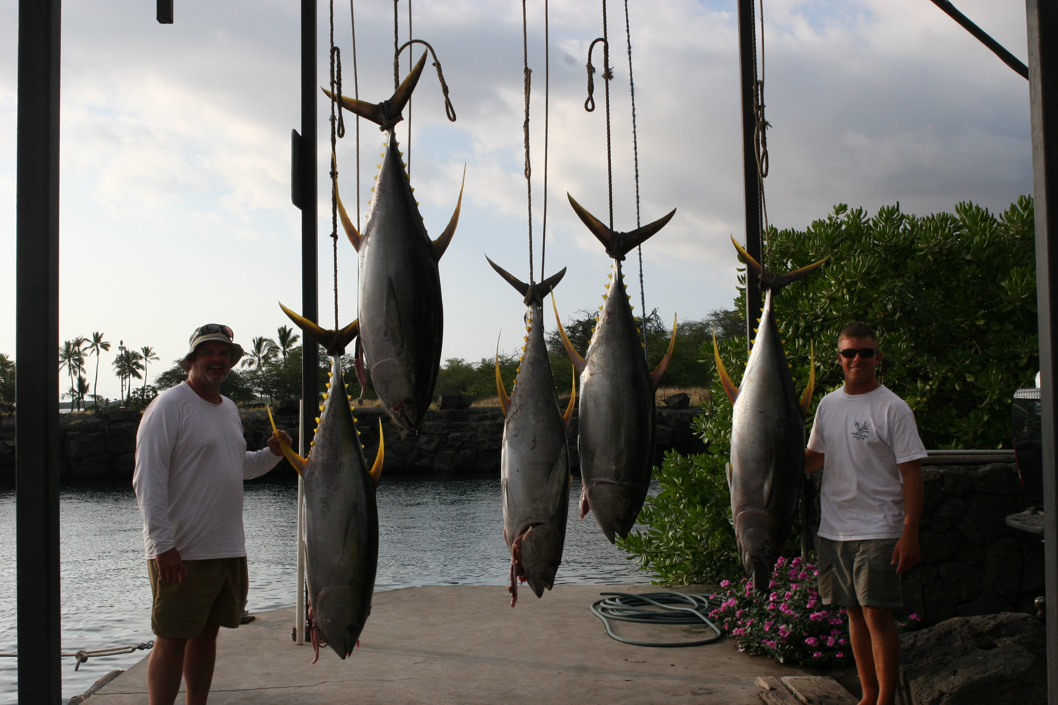 When I feel the fishing is good is when I can be consistent and catch fish every day. This year has been one of those years where they all seem to come on one day. Today was one of those days. My desire to spread my catches out has not been the norm this year. Today we took old friend Harland Cadinha and his friend Neil”Dutch” Kuyper looking way offshore due to a really fast current inside to look for life offshore. This time of year the life comes from the outside and the frigate birds and bait is often just outside of our range of the normal day. We went bird pile to bird pile and found good signs of life catching shibis when I saw a splash to the outside. It turned out to be the far dolphin pod that we always dream about finding. We made our first pass and got a single and missed it. Seconds later we got a double and landed both of them. Mat got 2 lures in the water and we went for our second pass. Mat and I were busy and Harland said” Guys there is a Marlin Back there” We looked up in time to see the 650 plus pound fish eat the jet we had short. Neil fought the fish for 35 minutes and we had her close. We put the drag up and up trying to get her before she died. It felt like it was foul hooked by the way she pulled and acted. Mat almost got the leader twice and each time she dove out of reach. The second dive she didn’t go far before we rolled her over and she started coming easy. Neil wound up the line that came, I bumped it ahead to get some angle and Mat got ready to get the leader when the darn hook pulled. It was seconds from the tag but didn’t get caught this time. Neil did a great job on the fish and it was really fun to chase that fish around. In hind sight I should have taken more time. We ran back to the school where we landed 3 more nice tuna before we had to run back to get Harland to the airport. The strikes and fish we missed to get the five was incredible. The fish were so aggressive they were totally missing the lures. The ones we caught we saw line up on the lures like a marlin and bite. Awesome! One of the tuna had a partner following it up while we had the leader. Today was a great day of fishing and will go down in my book as one of the best days of the year.