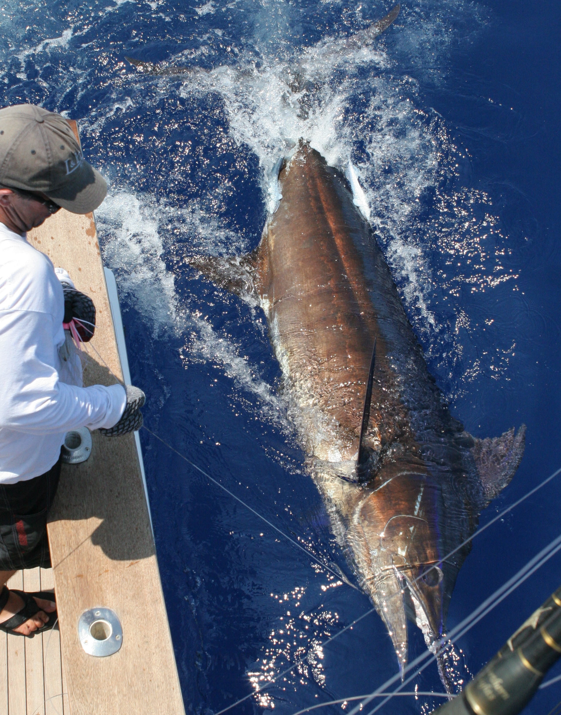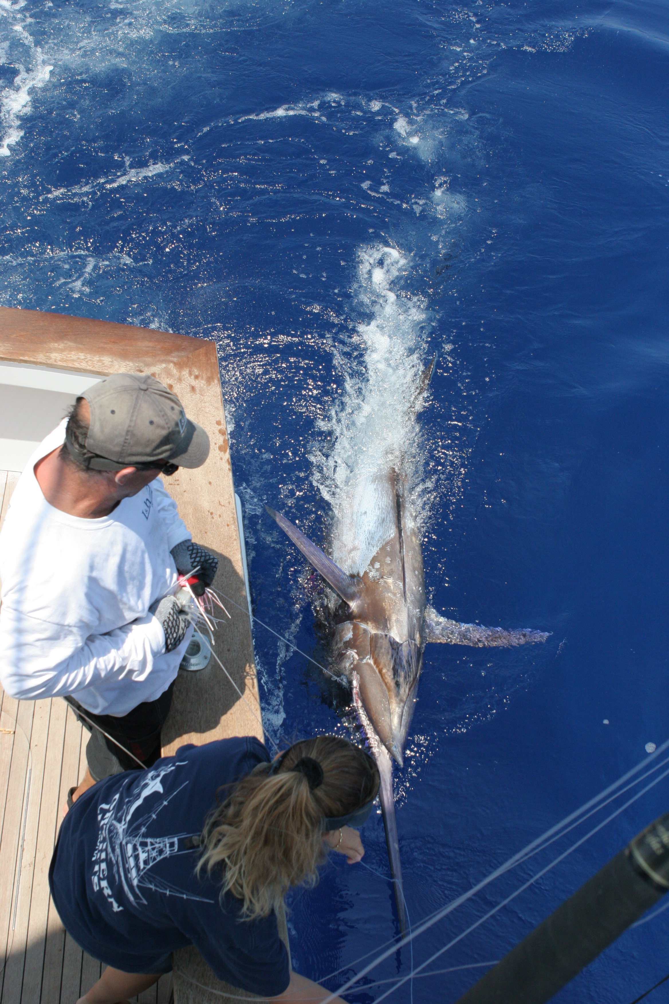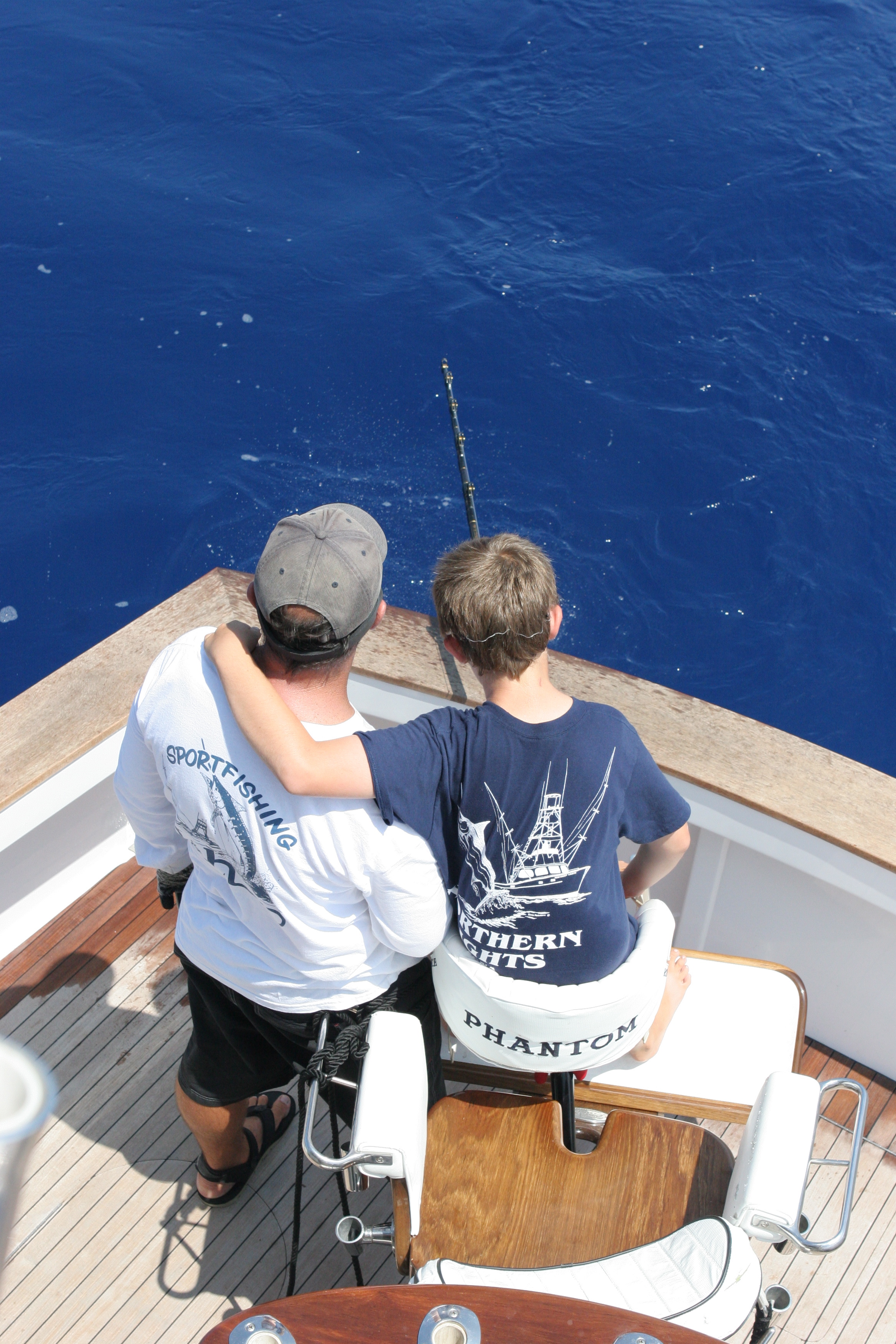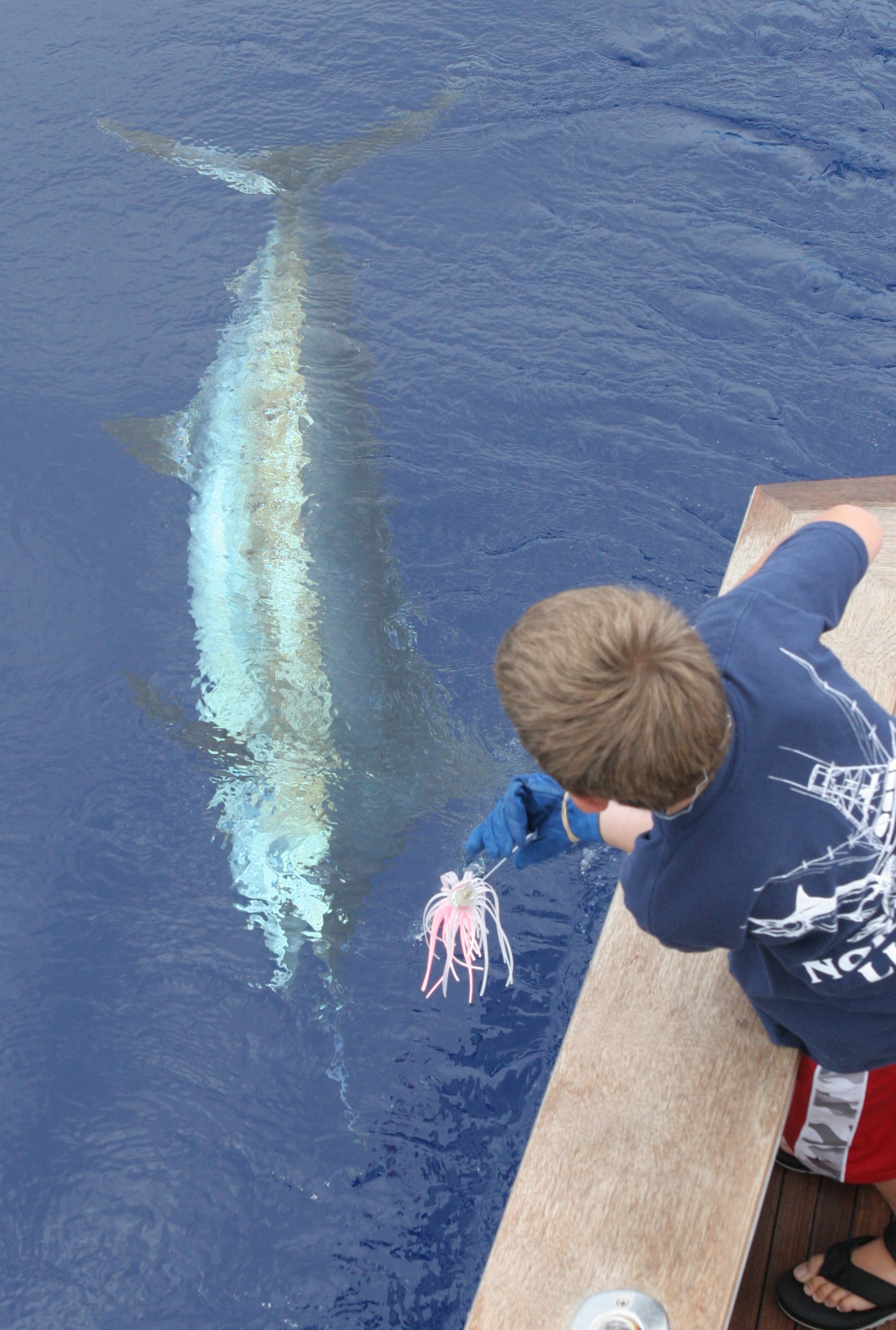 The David family has has had a great trip and it was going to be their last day of fishing before Jimmy went back to run his charter boat the Land H and the kids James and Laurel would start school. As we ate dinner we agreed that it had been a great trip and whatever we could do today would be great. Their last day would be great weather we caught anything or not and we were in the great position ofnot really needing to nail ‘e to save the trip on the last day. Mat had the 37 out with another guest and the Davids and I took the 40. Jimmy would wire and the family would help do the rest. We found a nest of fish to the south that turned out to be one of the best trolling bites of the summer. We hooked a big fish right away and James had the first shot in the chair. The fish was a nice fish but didn’t get a great look at the fish. It pulled hard and James had the drag up to 40 pounds before we knew it. We got the fish close in a half and hour and it pulled so hard Jimmy began to help James hold the pressure when I would make the fish pull to wear it down. Jimmy got the leader finally and we had a satalite tag ready to tag the fish with.I had been waiting for a big fish to use the tag on to see where the big ones go. Perfect here it was right there. The fish had fought so hard it rolled on to its back and we could revive it. She had died. We sslid the fish in the door and James would be able to get a weight on his bioggest blue and the fish would get to be eaten. We set the line out and saw a fish feeding next to the boat and 20 minutes later Debi caught a 120 pounder. We worked the area and found more fish on the surface anf on the sounder. We found Debbi in the chair again and I looked down and James had his gloves on. It looked like Jimmy was going to let James wire his first blue. He had practiced the whole trip with Mat with the teaser line and the bucket. We came up with a saftey plan and as the fish came to the boat we saw that it was in control and would be perfect for James. He did a great job and all the practice paid off. I was worried about what would happen when Jimmy put the satalite tag in it but when the tag when in the fish surged forward and James leaned back and held the fish under control. It was safely released and we had the 3rd one of the day. I was a great way to finish up our victory lap.