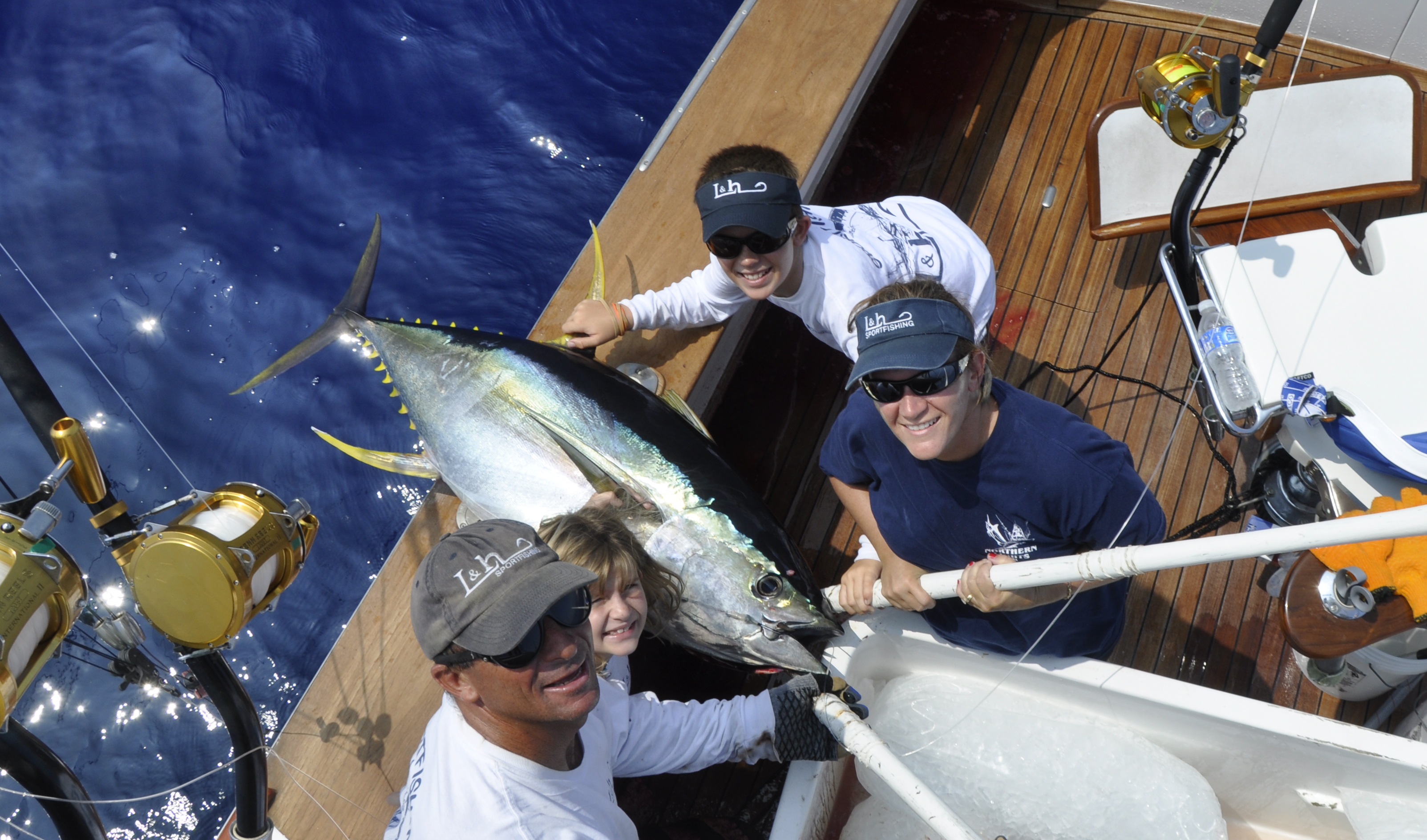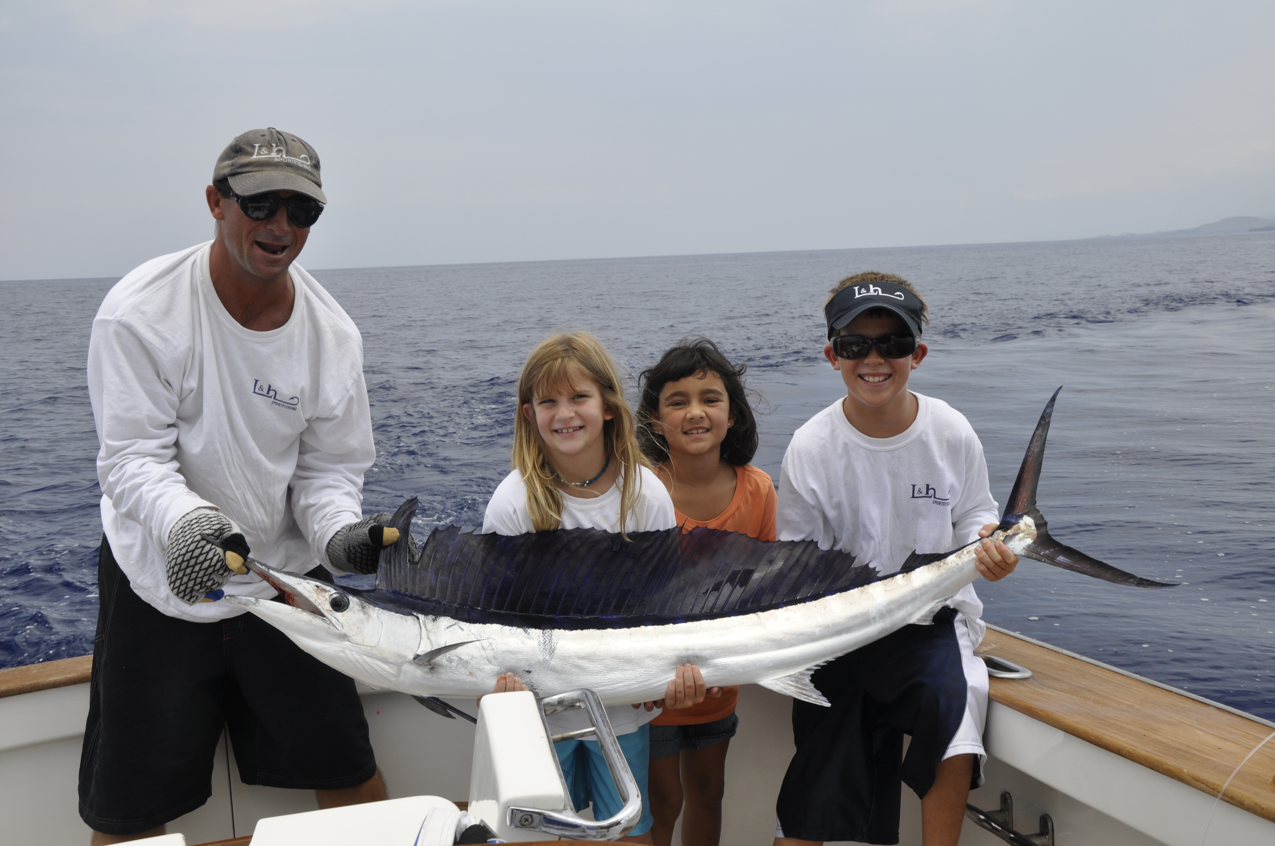To refresh your memory last year the David Family was here last year and caught 8 blues and 6 ahi last year this time on the best Kona fishing day in history. It was one of those days where everything went right for us and the fish kept biting until dark. With the fishing so good and our luck rolling we kept fishing and they kept biting. They had been here awhile riding along until their fishing dates started. james doing a great job for us in the HIBT las week.Mat got them out on the 37 Merritt today because I had a charter on the 40. With the fishing good the Davids booked the 37 to get a early start on the their trip. Mat fished them down south where they trolled down at Honaunau and missed a tuna on the stinger. What was strange was a spearfish came upon the same lure a minute later and Laurel (8 years old ) caught her first spearfish about 35 pounds. They worked the area the rest of the day and missed another tuna and caught a 115 pound tuna for Debbi.