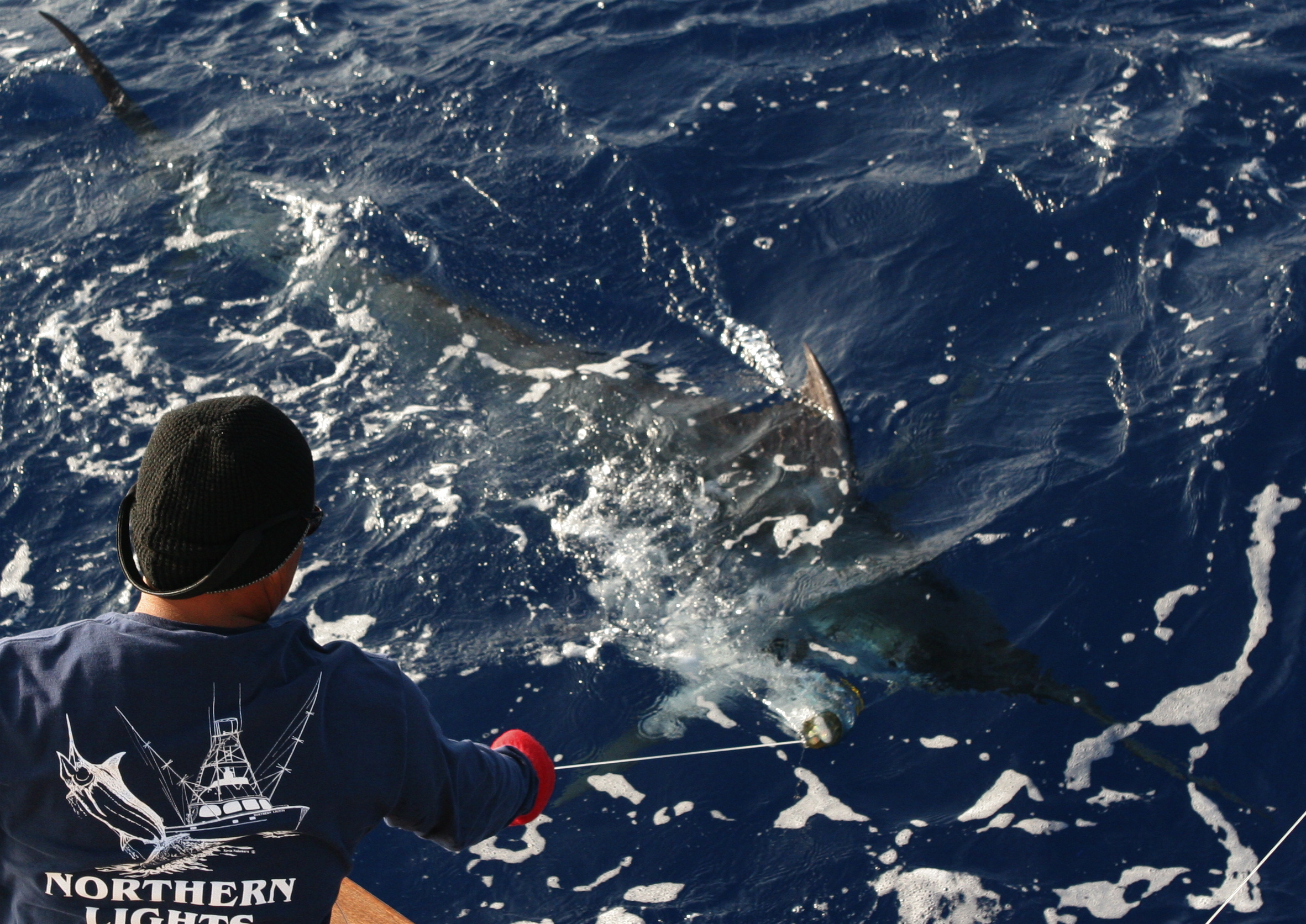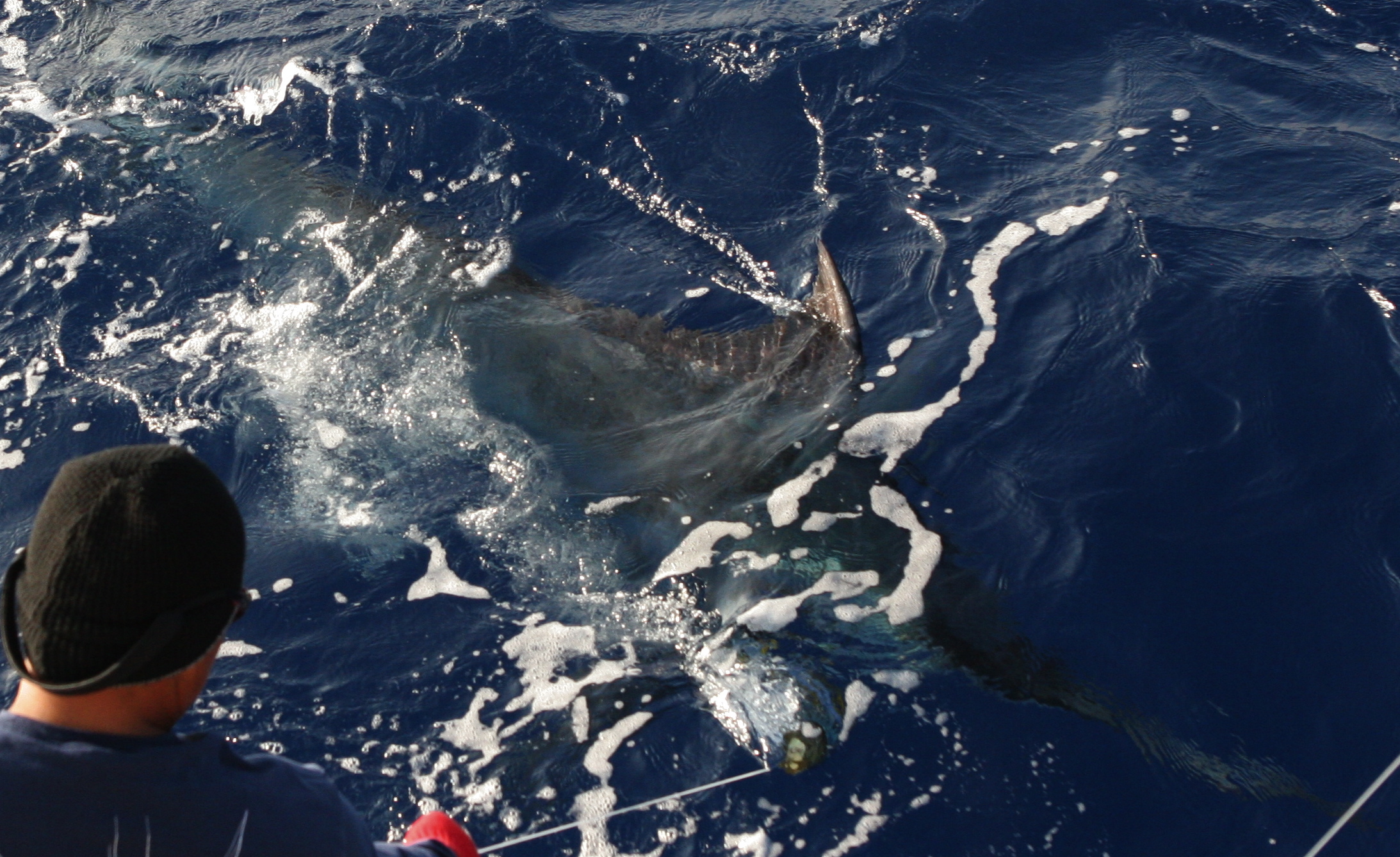 Today my friend Brian balencio fished with us because Mat had the 37 Merritt out with the David Family. The ribbing from Jay started right away to see if Brian could keep the streak going. The second session of teasing came when the short bait disappeared in a hole the size of the cockpit. Jay turned around to see the hole the fish left. We caught the 400 pound