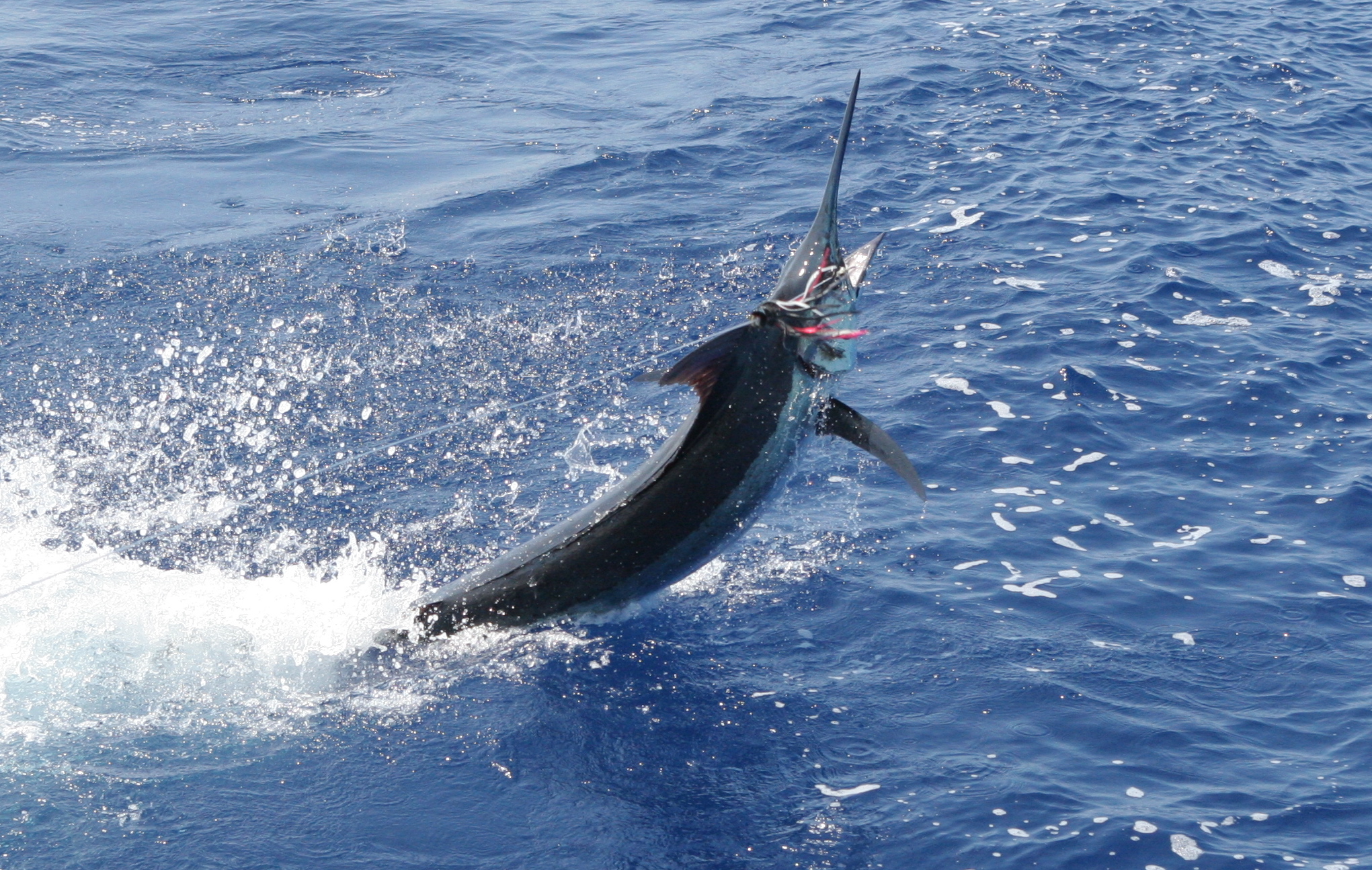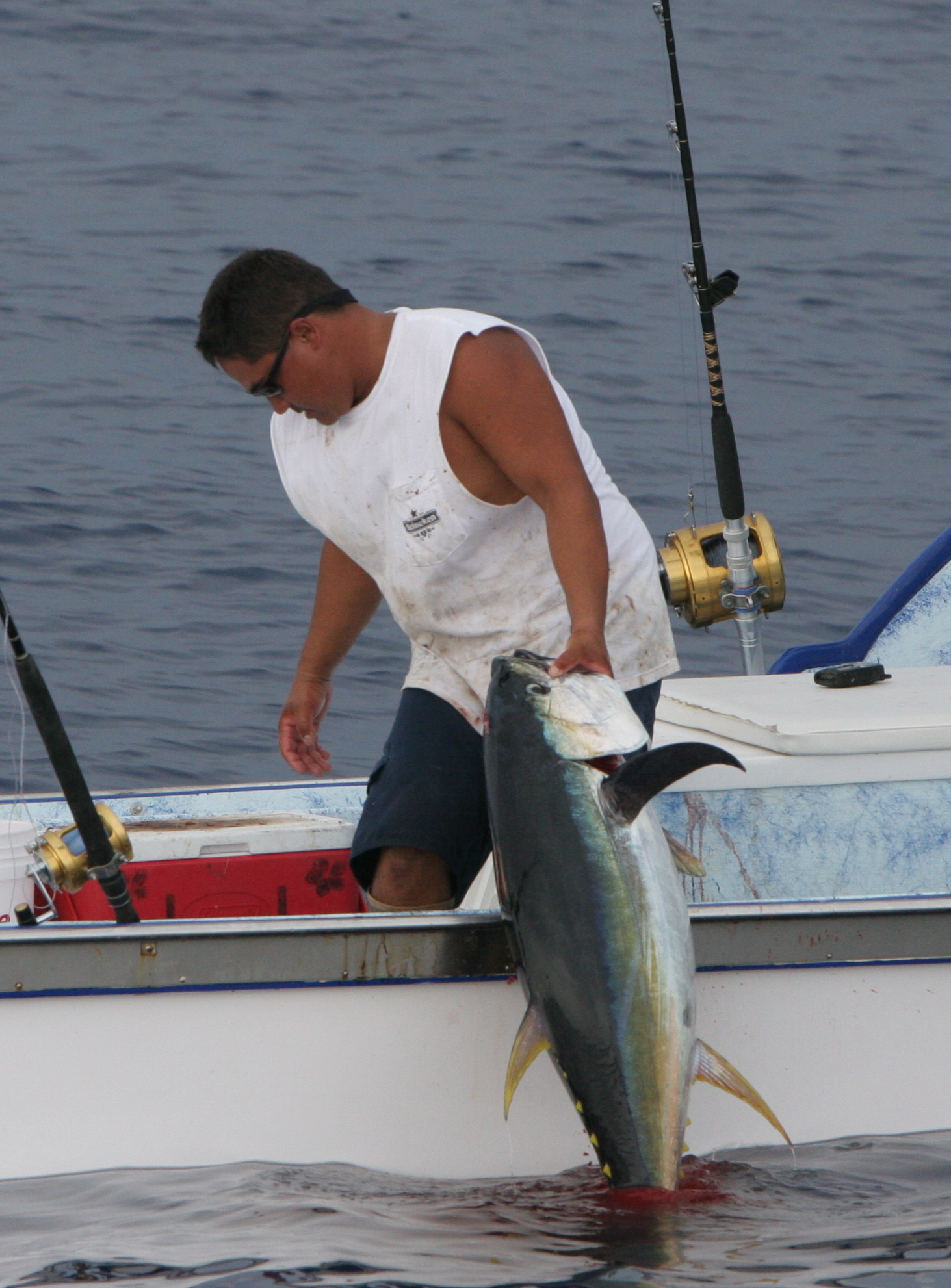 The fishing has been good to the sotuh so we planned a overnight trip. When the fishing is good at Milolii it is so nice to stay on the action for more time in the bite zone. We provisioned up for the 2 day trip and headed south. Mat and Bruce rigged up the lures of the day from all the lures Bruce brought when a 350 blue blew up the long corner. It went off jumping and we pulled the hook. We got going again and they put out a Bomboy Scarface on the long rigger. It was running so good it had to get bit. A fish about 140 came up on it 5 minutes after they set it out and we tagged the fish in about 5 minutes. We fished the TT buoy for a few hours and had a few tuna bites and missed them. Here you see my friend Brian who you have seen wiring fish with us with a tuna he caught. The bite for marlin was slow there so we trolled all afternoon with no bites. We set up for our drift for the night and caught a bunch of squid after dinner. We slept off of the flows to get a early morning shot at the buoy.