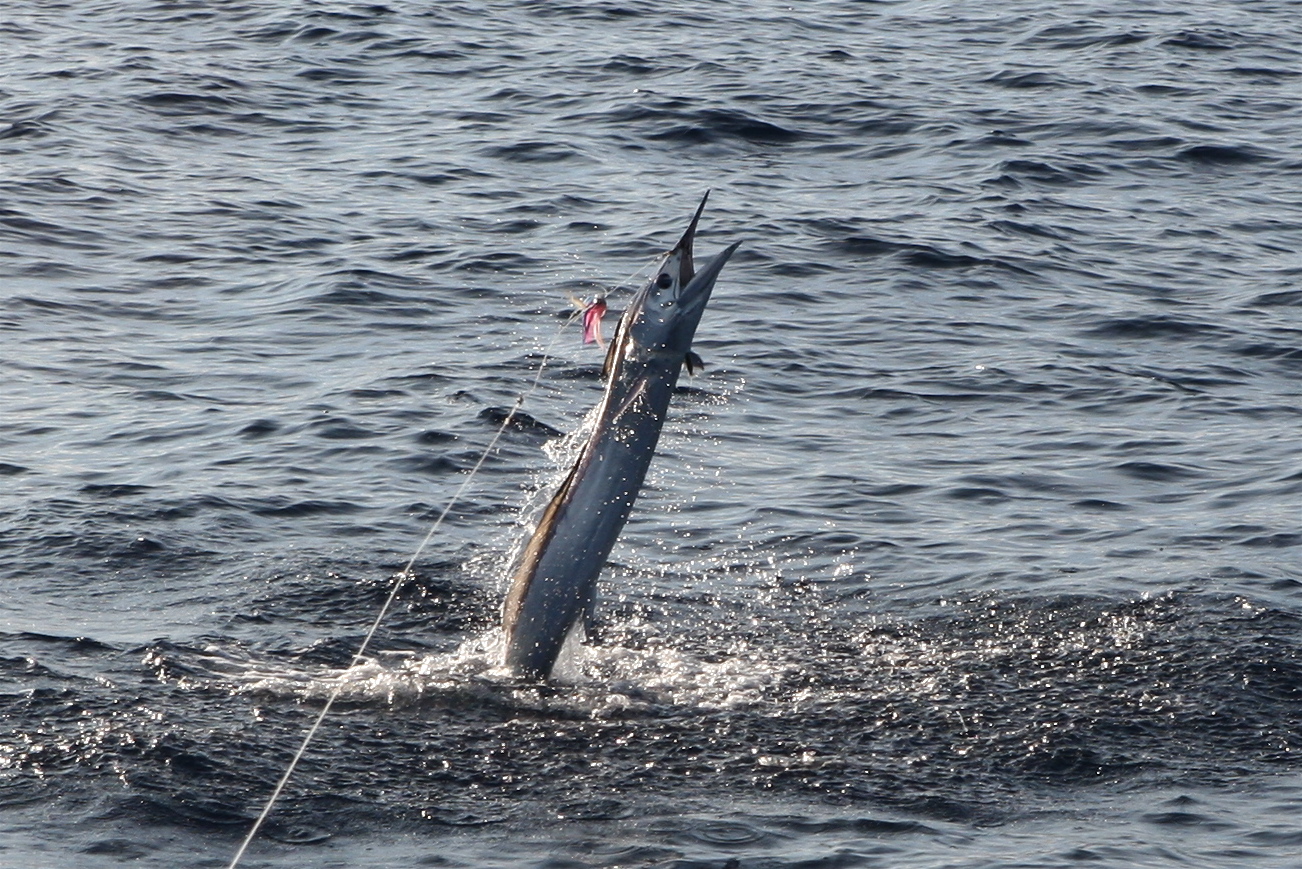 Today Mat had Hal Westbrook out with his daughter Teal and friends and saw a National Geographic moment. They saw a spearfish coming for the stinger. It loped along behind the lure as they often do. They saw the spearfish and were waiting for the spear to grab the stinger and it disappeared into a giant hole that a big marlin left as it ate the spearfish in one bite. What a show but that was all the action they had for the day. It proved that there is a line up in the food chain and the big marlin are at the top of it.