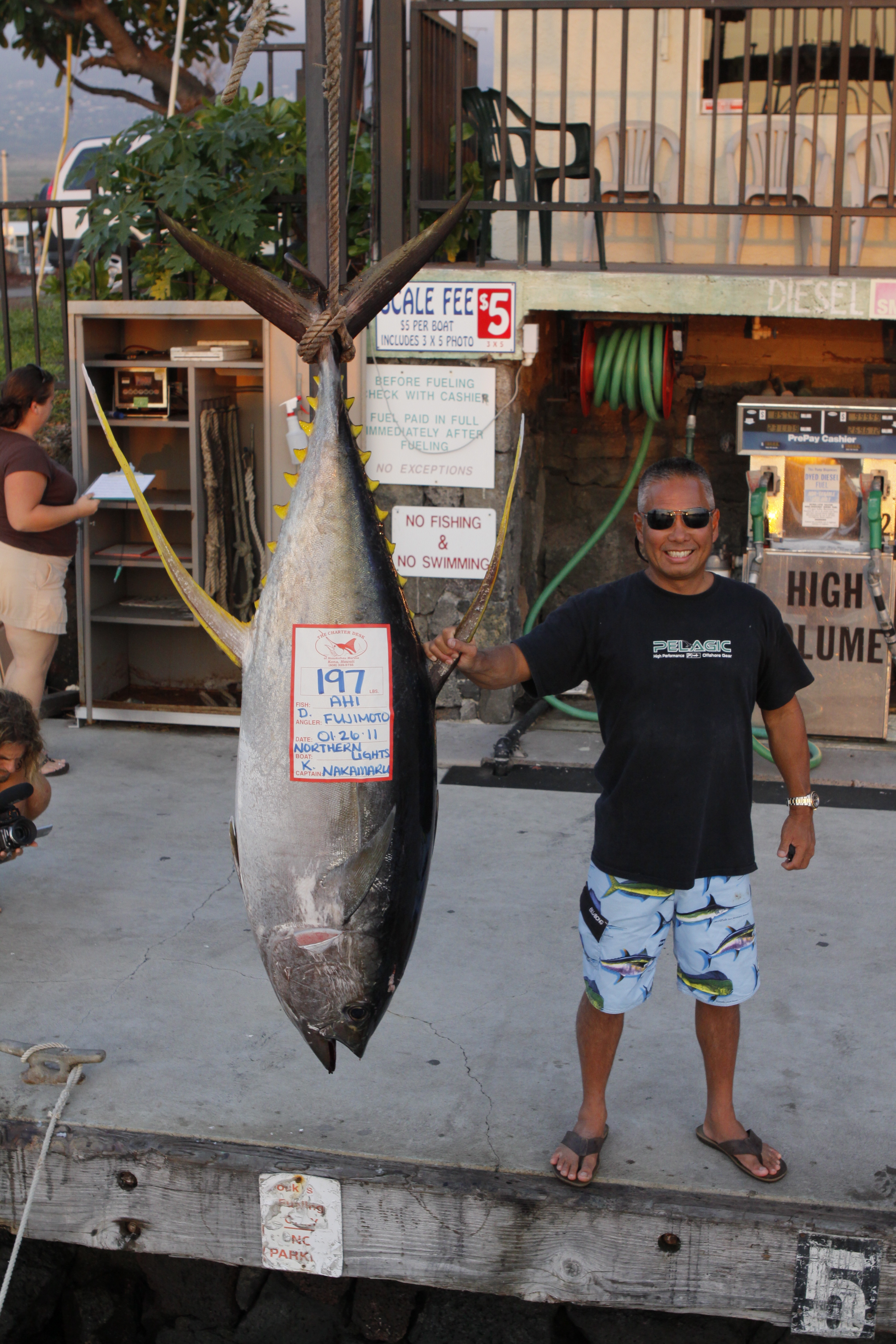 Today Geza and Paul and I took out our friend Daryl Fujimoto out fishing and did well on the ahi. We found one pod of dolphins that we got a double in and caught 91 pounder.Unfortunately we missed the second one of the double.Late in the afternoon got into another pod friend called us to. We stayed in them until sunset and caught the biggest ahi to date 197. Paul dove with the ahi today and got some great video of the fish.