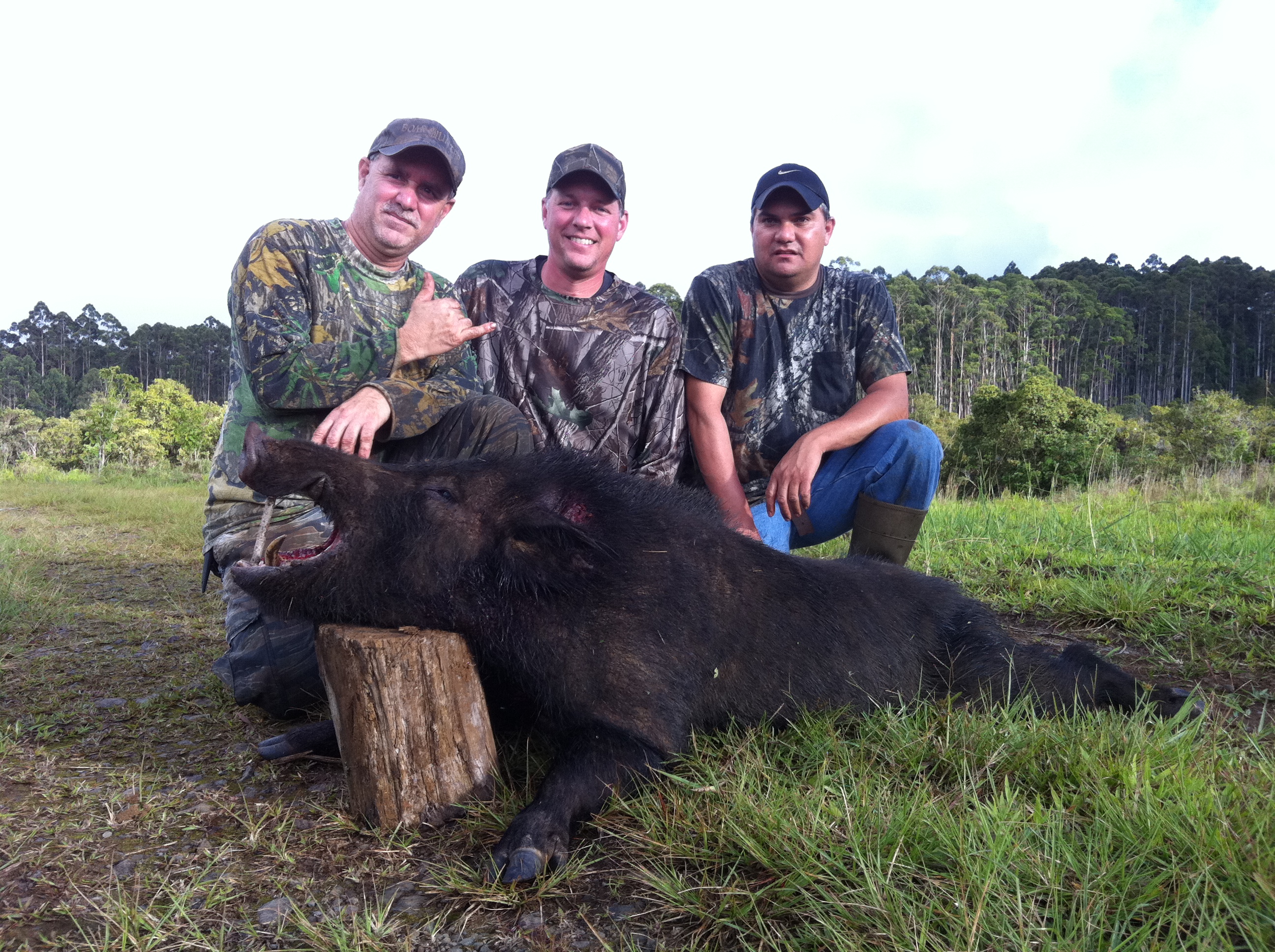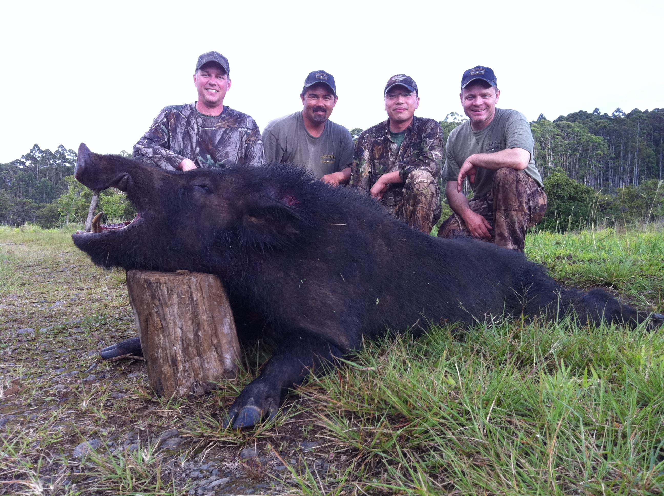Tim Mahoney and his friends Vin and Dinny hunted for Boars with our friend Neil in Lapohoehoe. We let the dogs out and right away found this nice boar right away. Denny made a nice sot and we started our hunt really well. Neil’s dog Peanut did a great job keeping the boar busy while Neil and Dinny got in position. Tim Vin and I stayed back out of the way and when we heard the shot we saw this nice boar. We saw a bunch of other hogs that afternoon but ended up with our best luck early. Here you see Neil and Roger with Dinny and then Tim, Vin ,Dinny, and I in the next shot.y