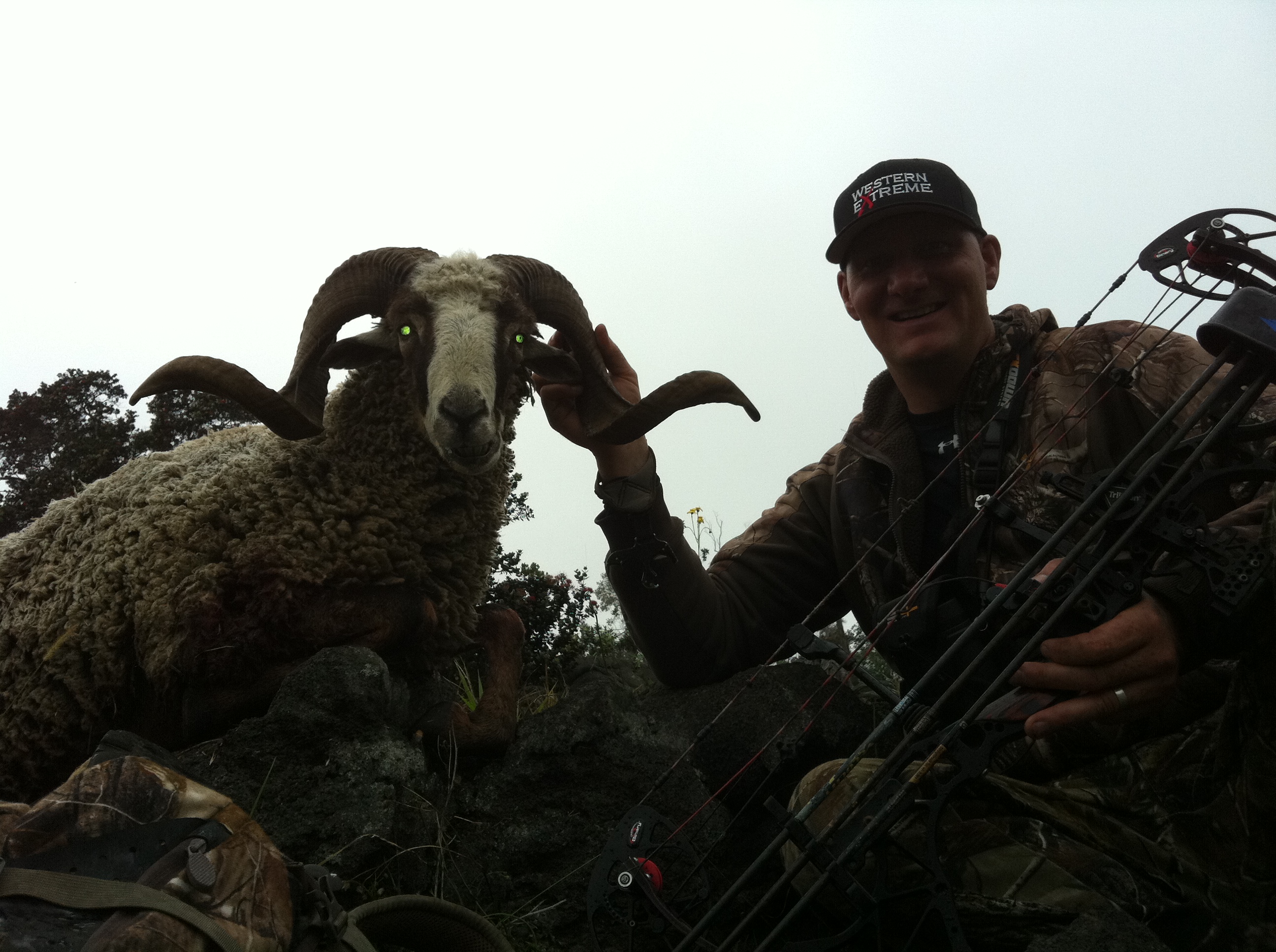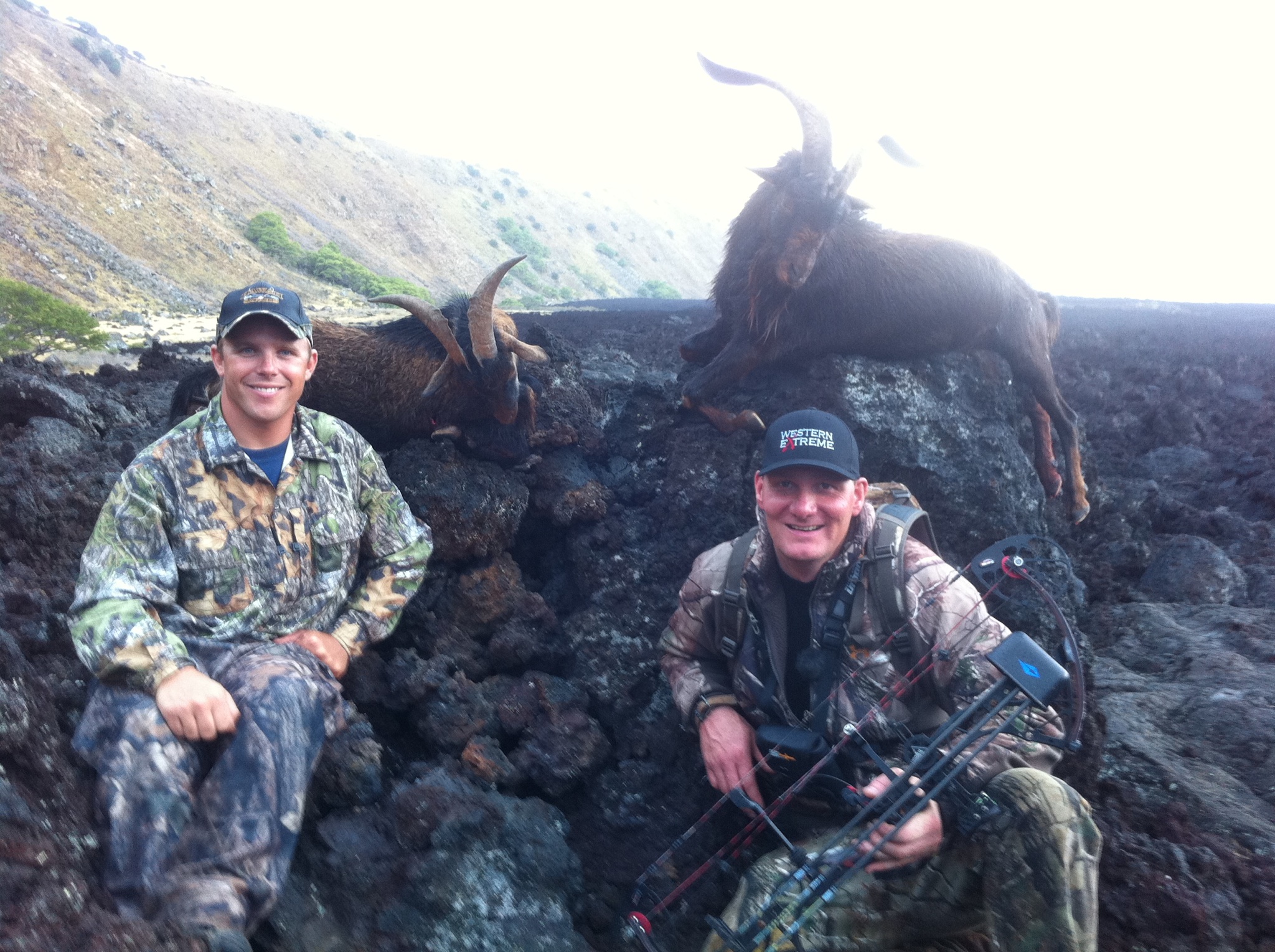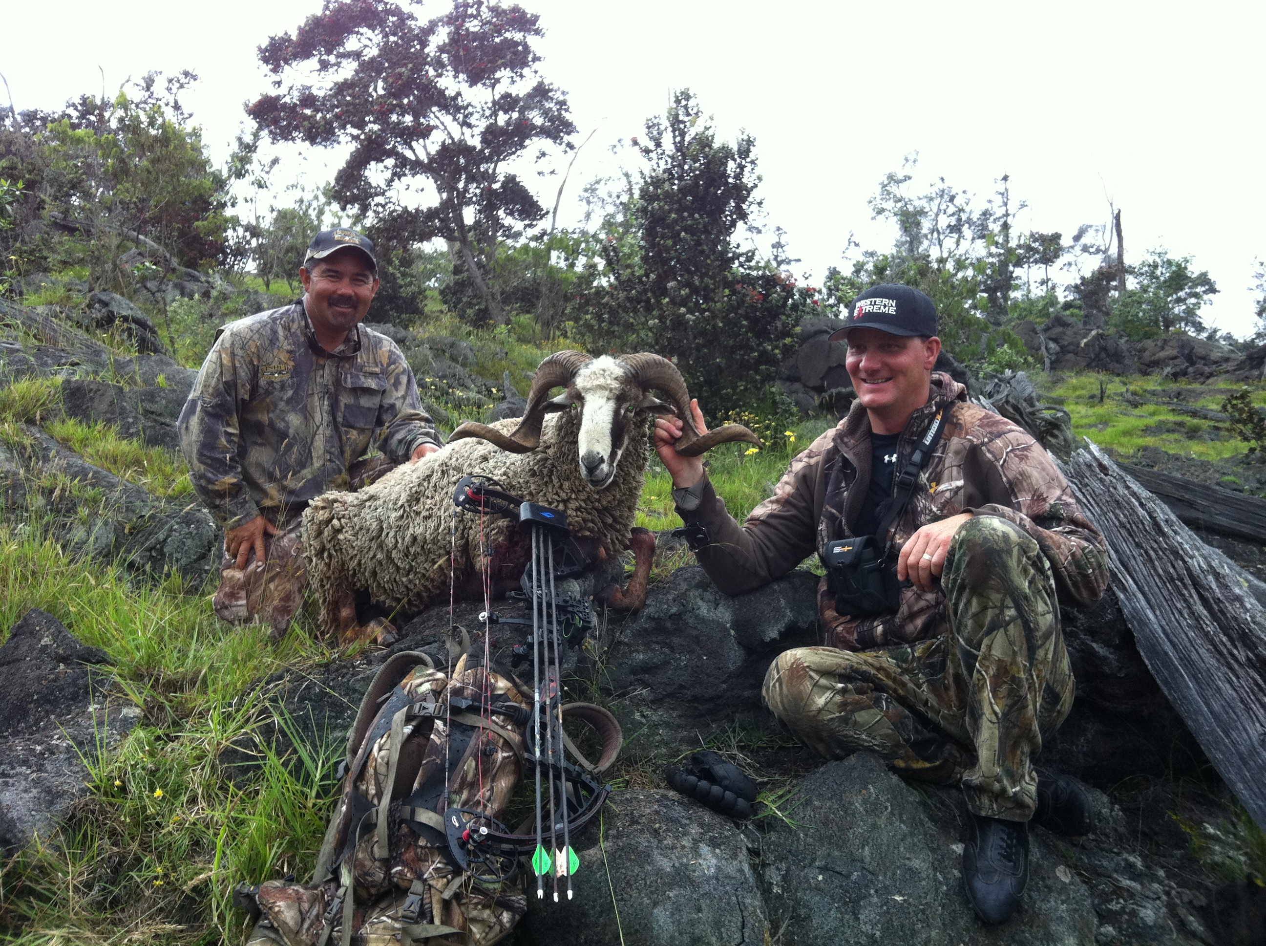 Jim Burnsworth of the show Western Extreme on Outdoor Channel came to Hawaii to hunt and fish with Hawaii Safaris. Jim and his camera men Austin and Josh started their trip with us by hunting sheep. We archery hunted sheep our first day together and had great action. Mat Bowman came with us to help out moving the truck and helping look for game while we hunted. We ended up having great stalks and saw a bunch of sheep. We got a good representative sheep and then got this nice sheep he shot at 65 yards. It was amazing for Mat and I to watch Jim shoot. It was nice to see him practicing shots on our target at 100 yards right away. It was nice for me because I was able to extend out our range we are used to. He was saying he was comfortable at 80 yards for a shot. It turned out we didn’t need it but it was good to know we had it if we needed it. Jim and his camera men were fun to work with and it was neat to see them work together. In these shots you see the sheep he got that his sons filmed and the goats he got with Mat down South. Jim got great film of him shooting the goats from the top of the cliff. Mat helped pack the goats up the cliff late that evening.