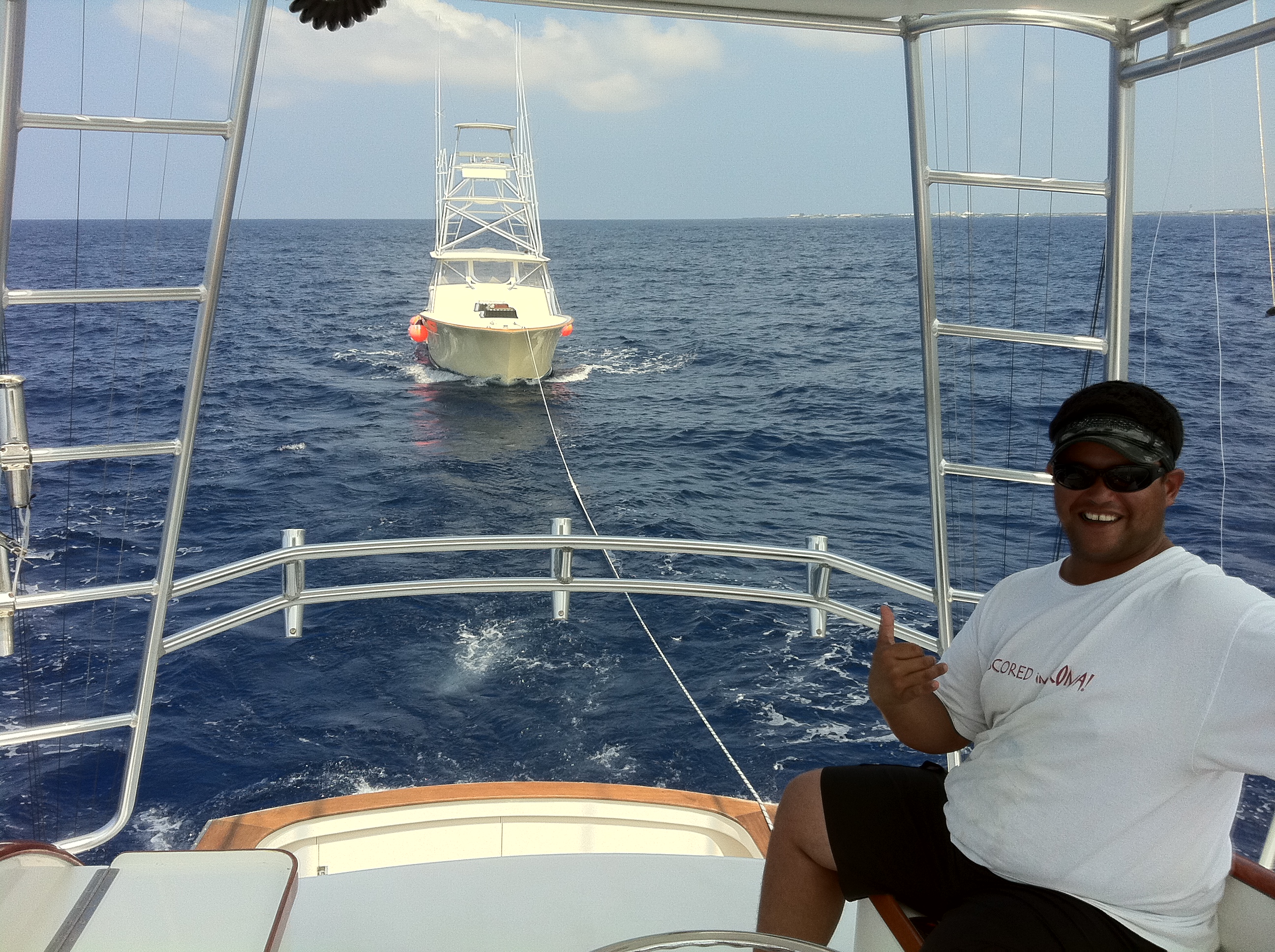 Tsunami Day was actually Tsunami Night. Here you see Travis towing the forty back in in the morning. We found out at 9:30 at night that we had a tsunami headed our way after the action seen in Japan earlier in the day. The fleet here in Kona went to the harbor to get the boats out of the harbor. My problem was that I had 3 boats to move and one of me. Thankfully Travis Ota and Brian Balancio helped me move the boats out. Brian took the forty Gamefisherman and Travis and I took the 37 Merritt and Towed the 40 express Gamefisherman that was not able to be run because of work that was being done to it. We had good calm conditions out in front of the harbor where boats with their lights on turned the ocean into a city at sea. We waited until the the big serge came into the harbor. The harbor water level dropped very low and filled back up full. It came up very high but didn’t take any of the dock boxes with it. Over all we were very lucky The only damage was from boats that were left in the harbor through the serge. after surges really came in and messed up boats that came in right after the first surge. The early boats the tied up were fine. When the other boats around them came in and the surges started it made it a real challenge to get the boats in safe. The fleet really worked together and we came out of it very well. Places in town and down the coast line didn’t fare to well. Our prayers go out to japan and all those who were effected by the Tsunami.
