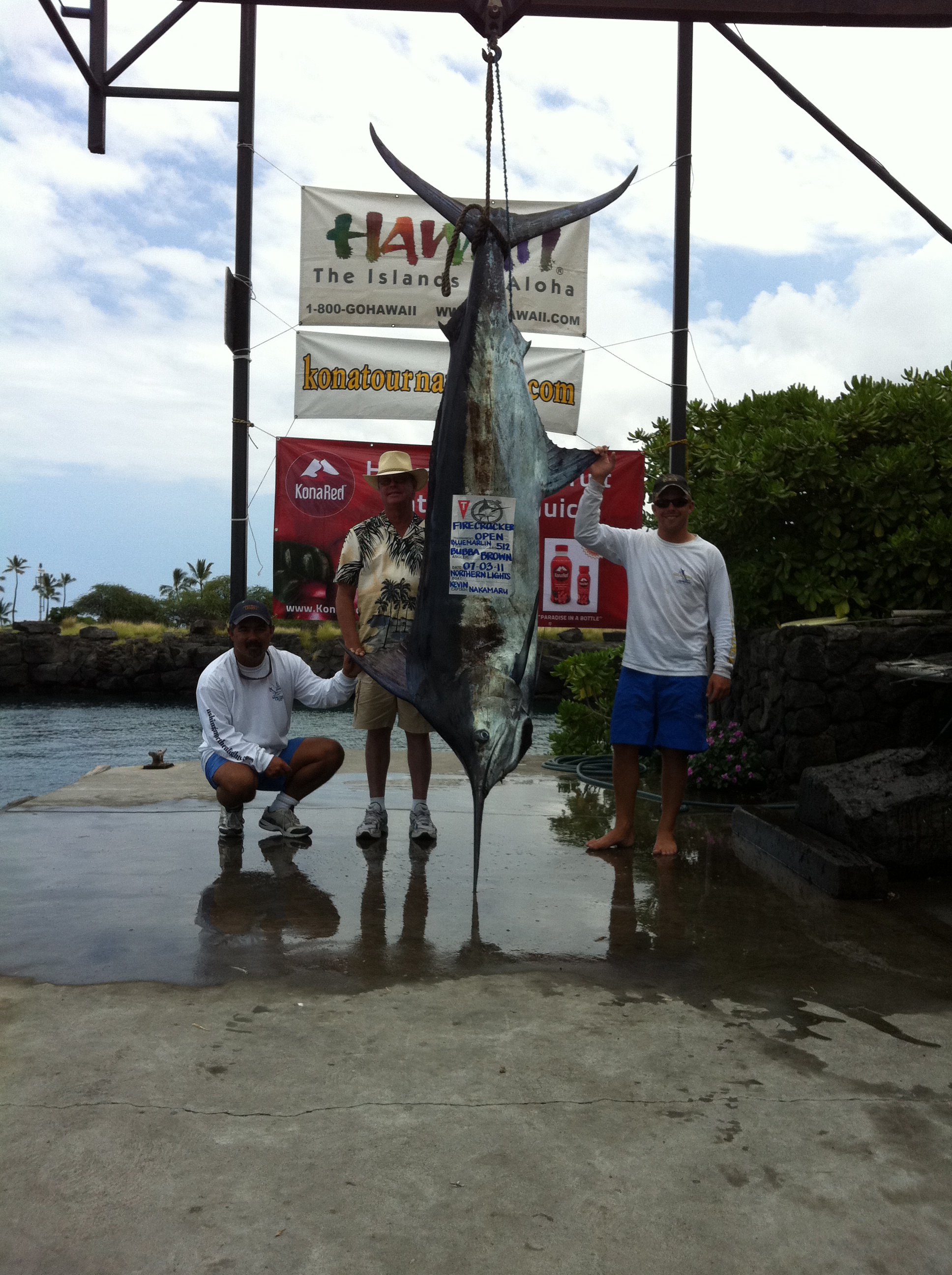 Bubba Brown of Texas won second place in the Firecracker Open in Kona Hawaii on the Northern Lights. On Day one we caught a 200 pound blue that put us in 8th place on time. Going into day 2 we had the entire daily pots open in the big fish. I went north to get out of the pack and have our own water to fish fish. I stayed close to the grounds where a thought a good bite may happen. I trolled there for 2 hours and decided to slide down from the grounds down the 1000 fathom line where I saw that there was no boats. The fish came to my right teaser and when I took the teaser from it it went to the left short and got hooked up. 25 minutes later we had the fish in the boat. it had a 112 short and I thought  it would be around 450. At the scales it weighed 512 pounds. Bubba went into the dailies deep enough to win the majority of the money in the tournament and second place over all.