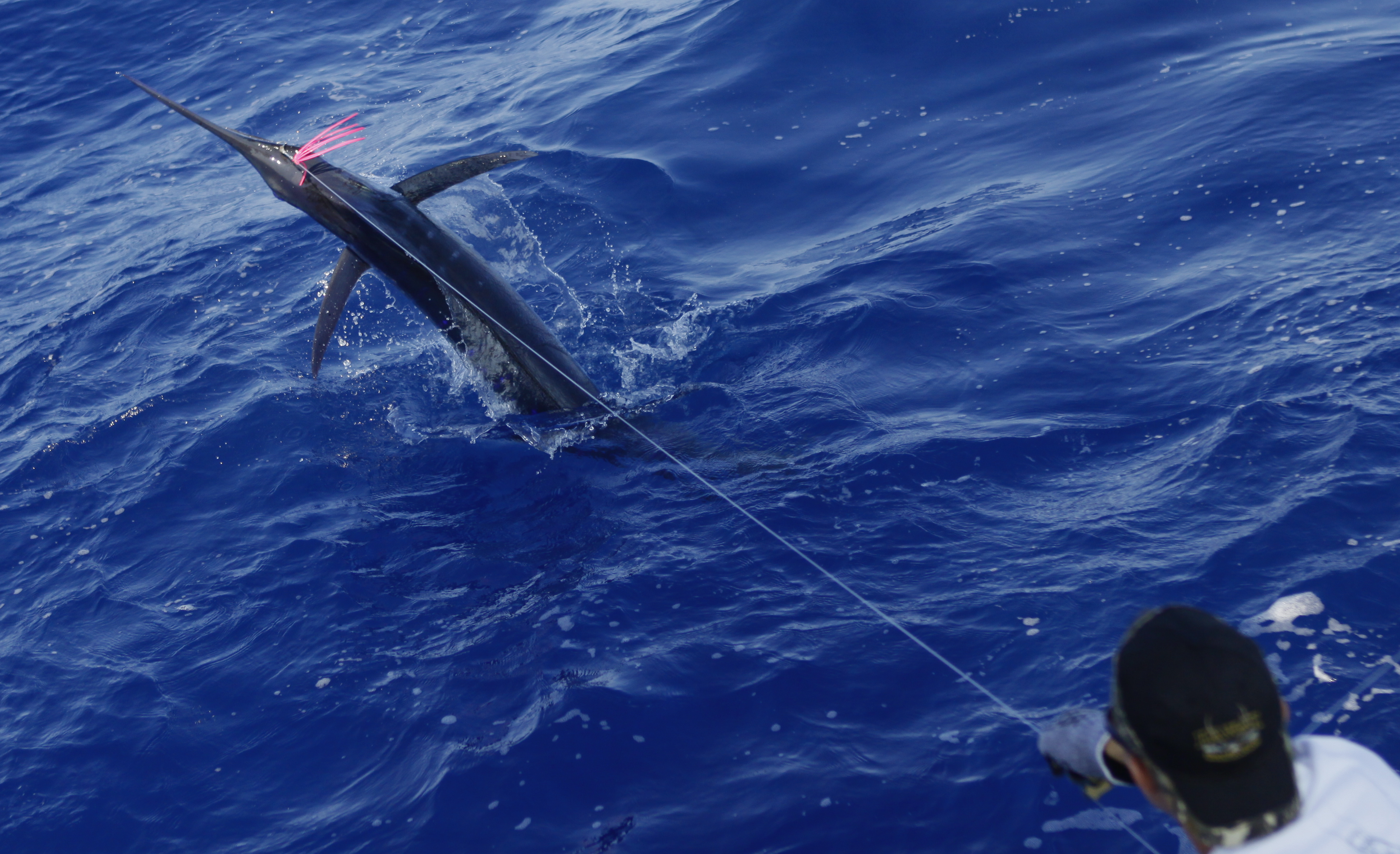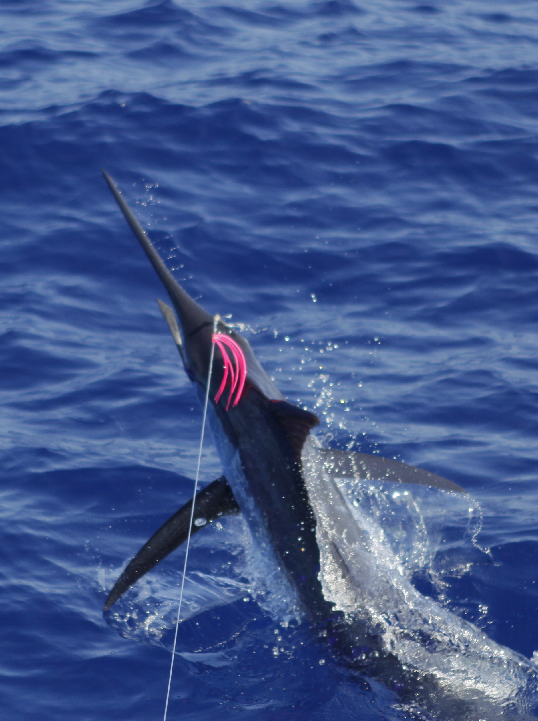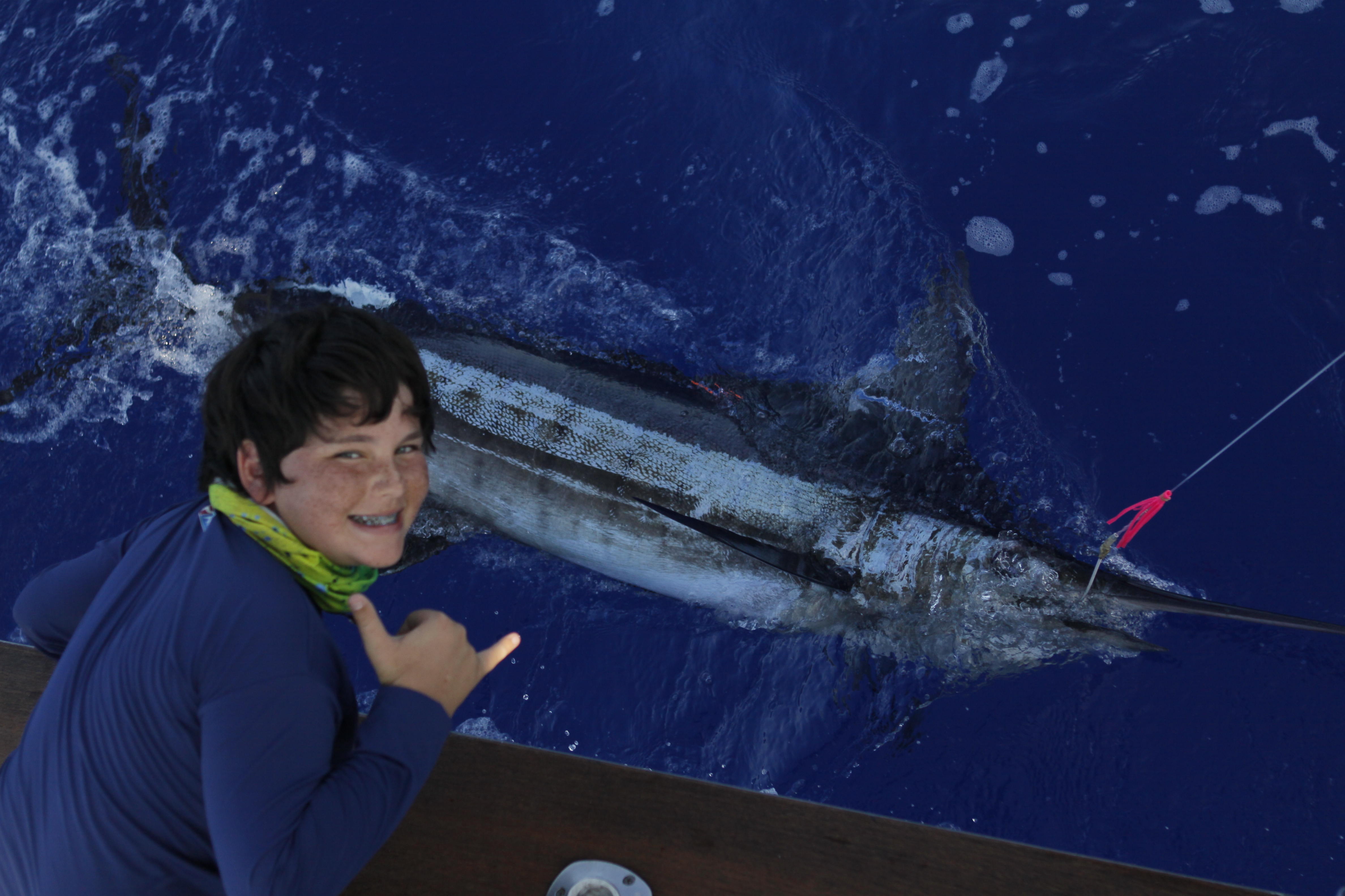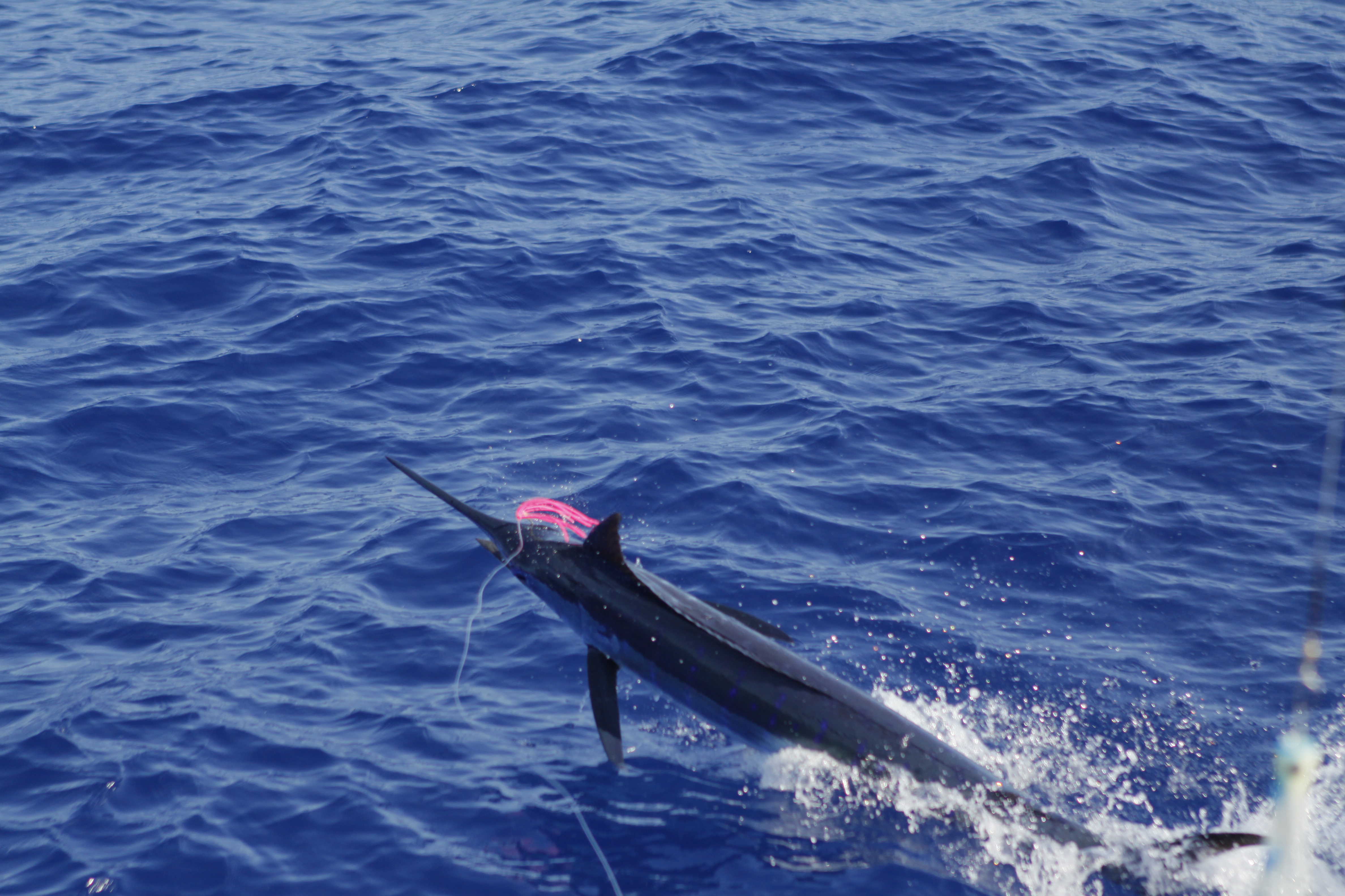 Jake caught this blue early. It put on a good show at the boat. We live baited after lunch and missed a blue. We trolled around the area right away and got it to bite. It jumped off after it took a little line. The bite on the Kona Coast continues. The fleet is catching over 20 blues a day now. The majority of the fish are small ones but everyday big ones have been seen and caught. We hope that the bite will continue through the summer.