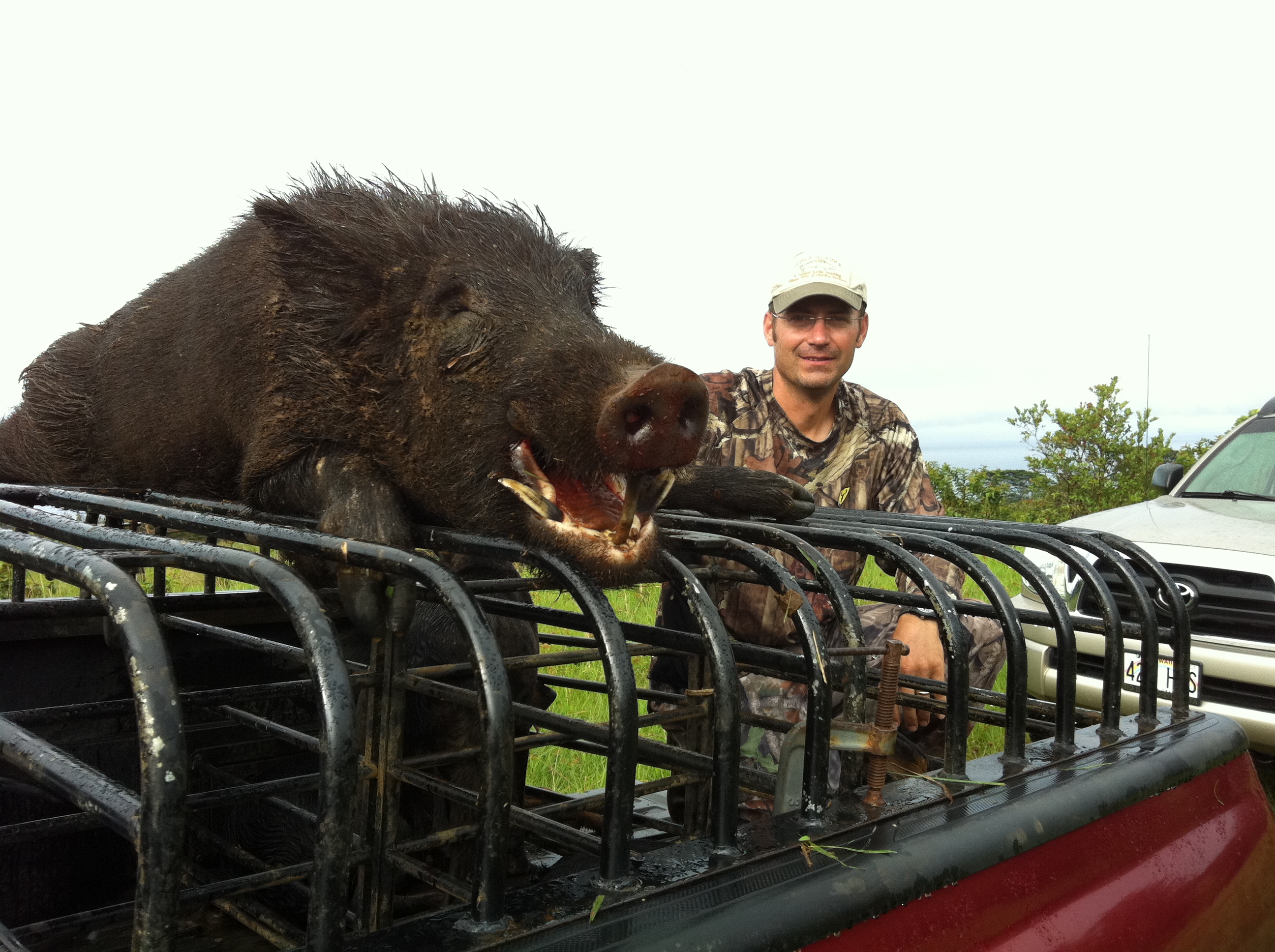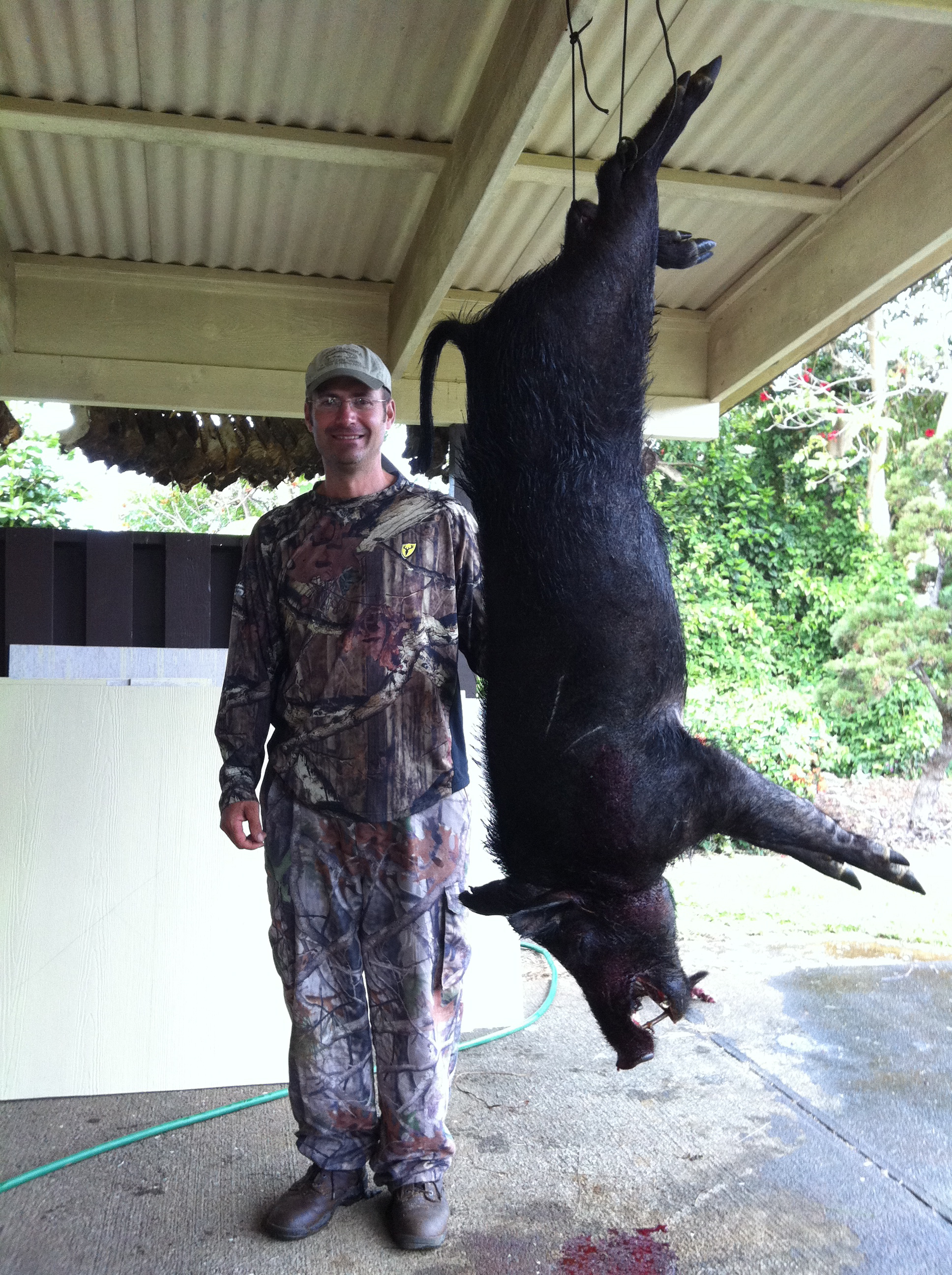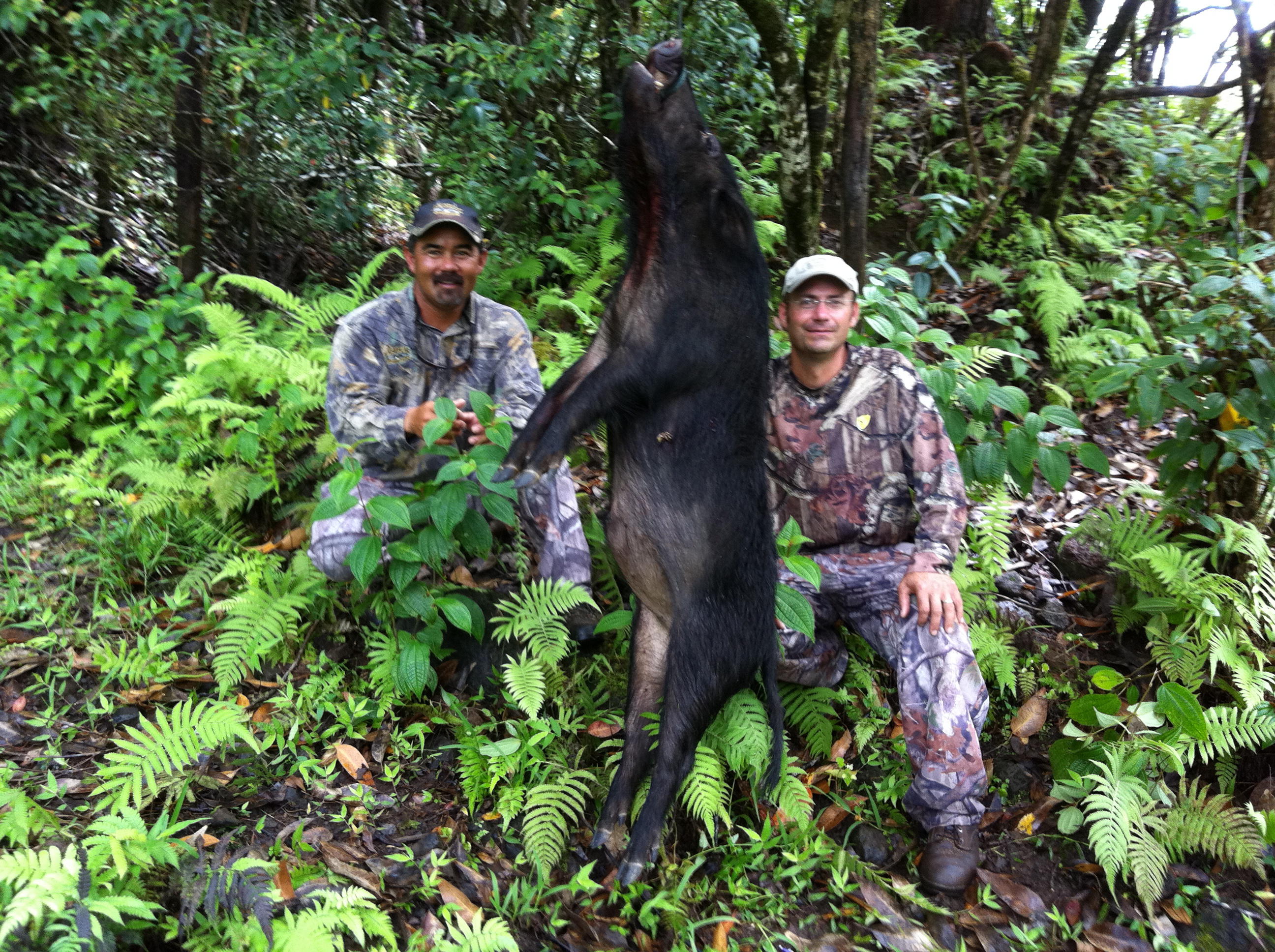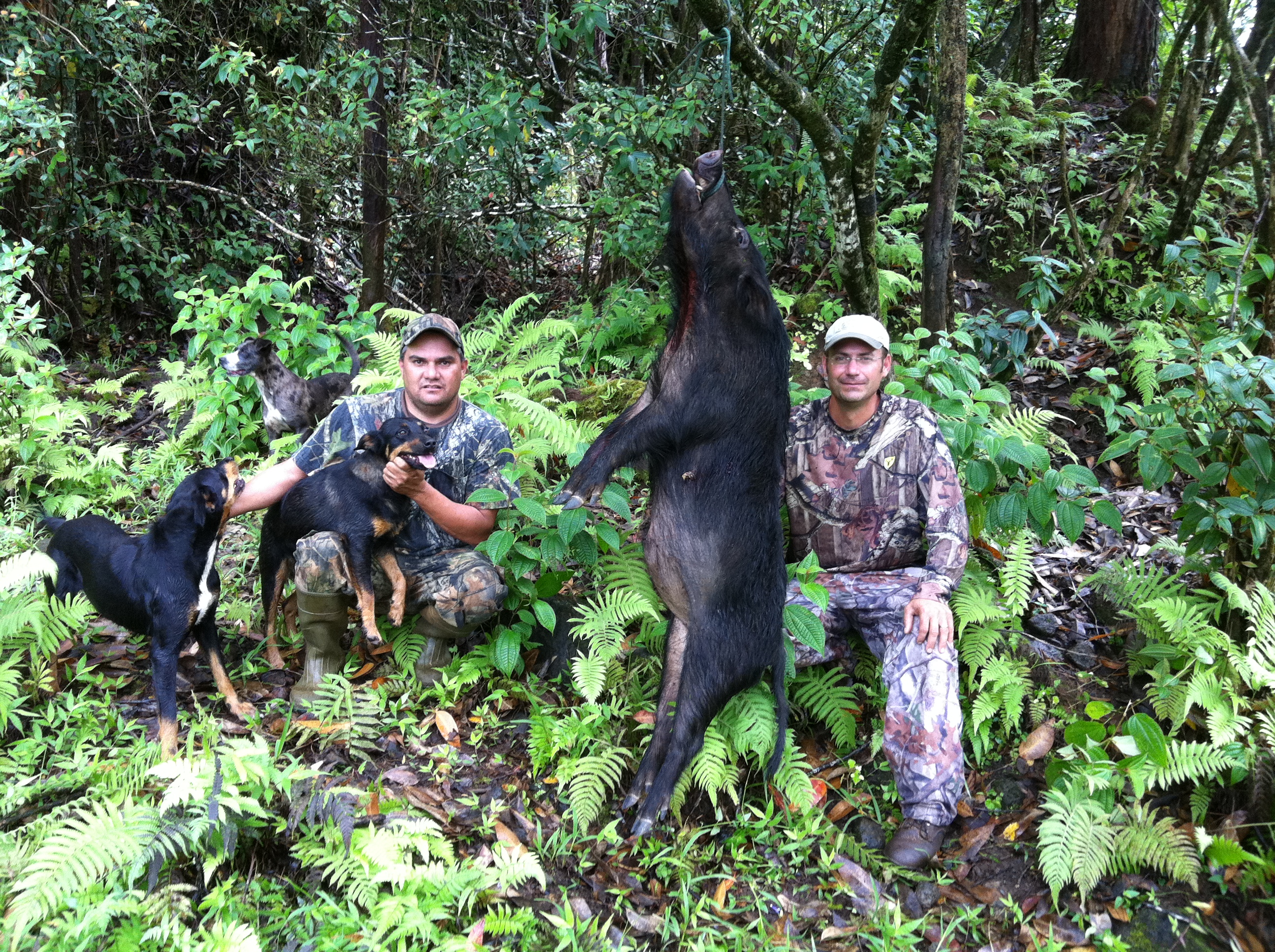 John And I weren’t able to hunt goats in the afternoon due to a schedule change at the ranch so we called our Hawaii Safaris Boar specialist Neil Cabral to see if he could get us out. It happen that he did have time and we met him for a afternoon Boar hunt and it went really well. The weather was perfect and the Boars were on the move. Neil used the dogs to help chase the Pigs out of the thick terrain where John could shoot them. John made some great shots. The big boar was a fast running shot making it tough but he made the shot with our 243. Neil’s passion for the boar hunting is really good to see and feel the energy on his hunts. We had a great time with he and his team August,Rodger and Andrew.