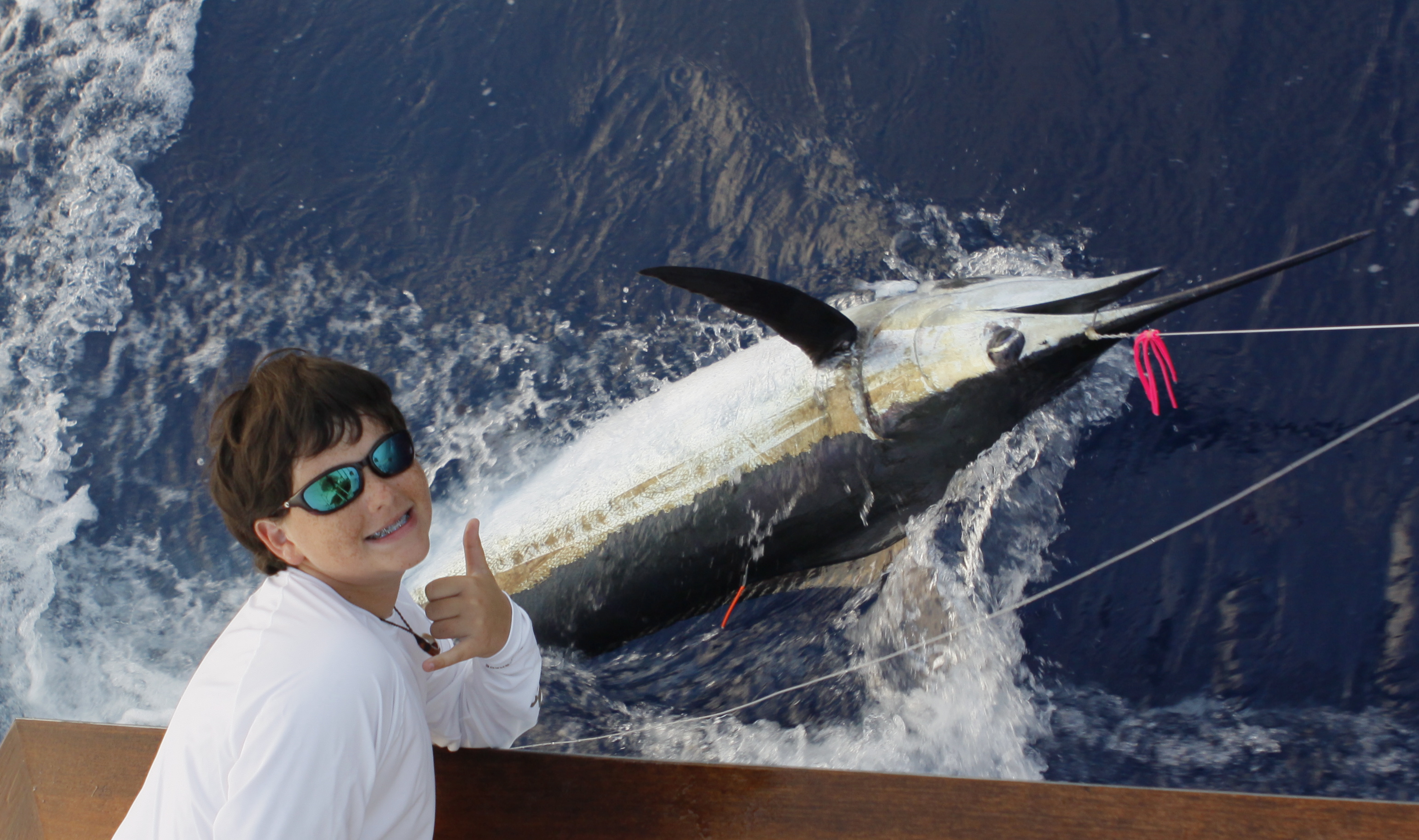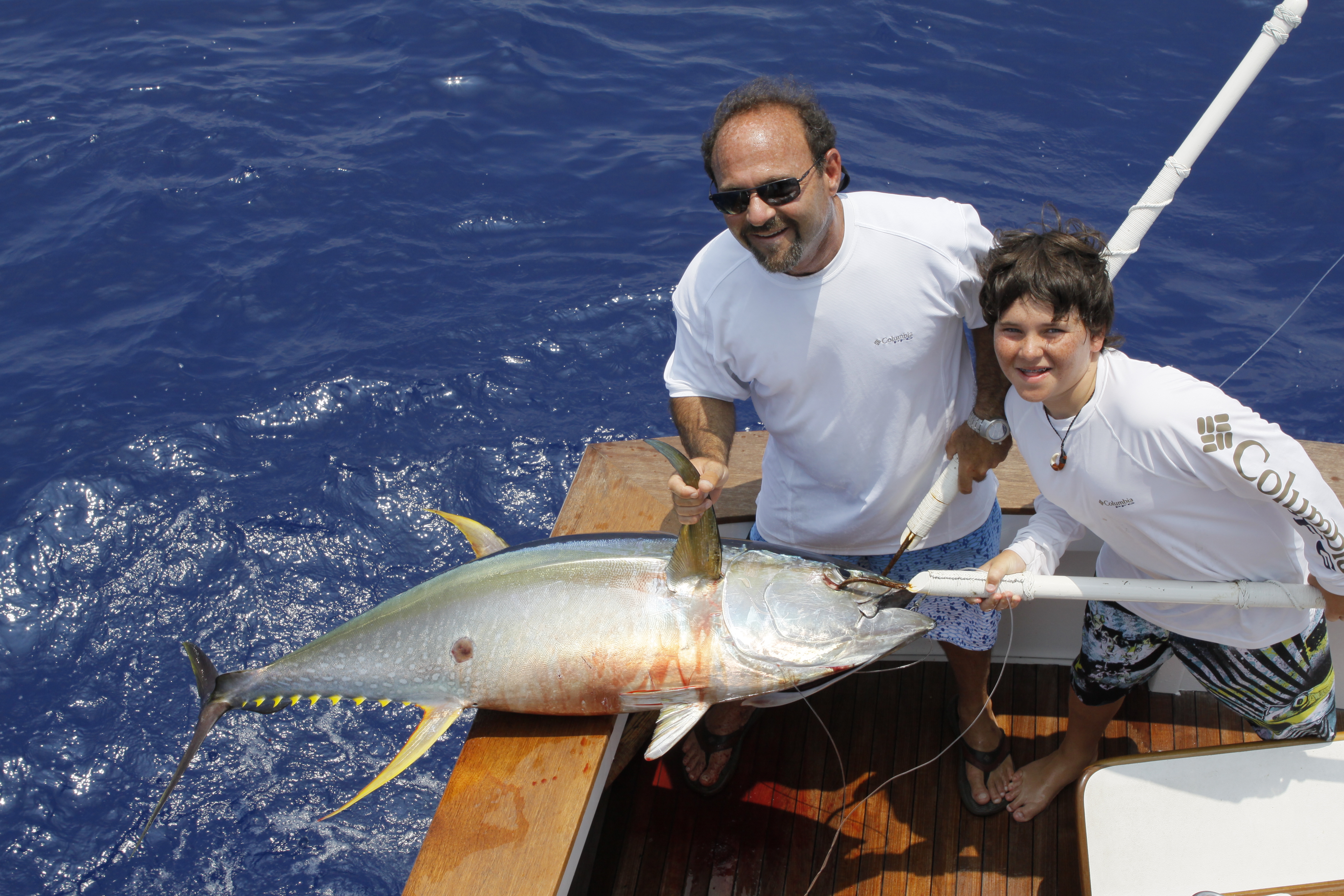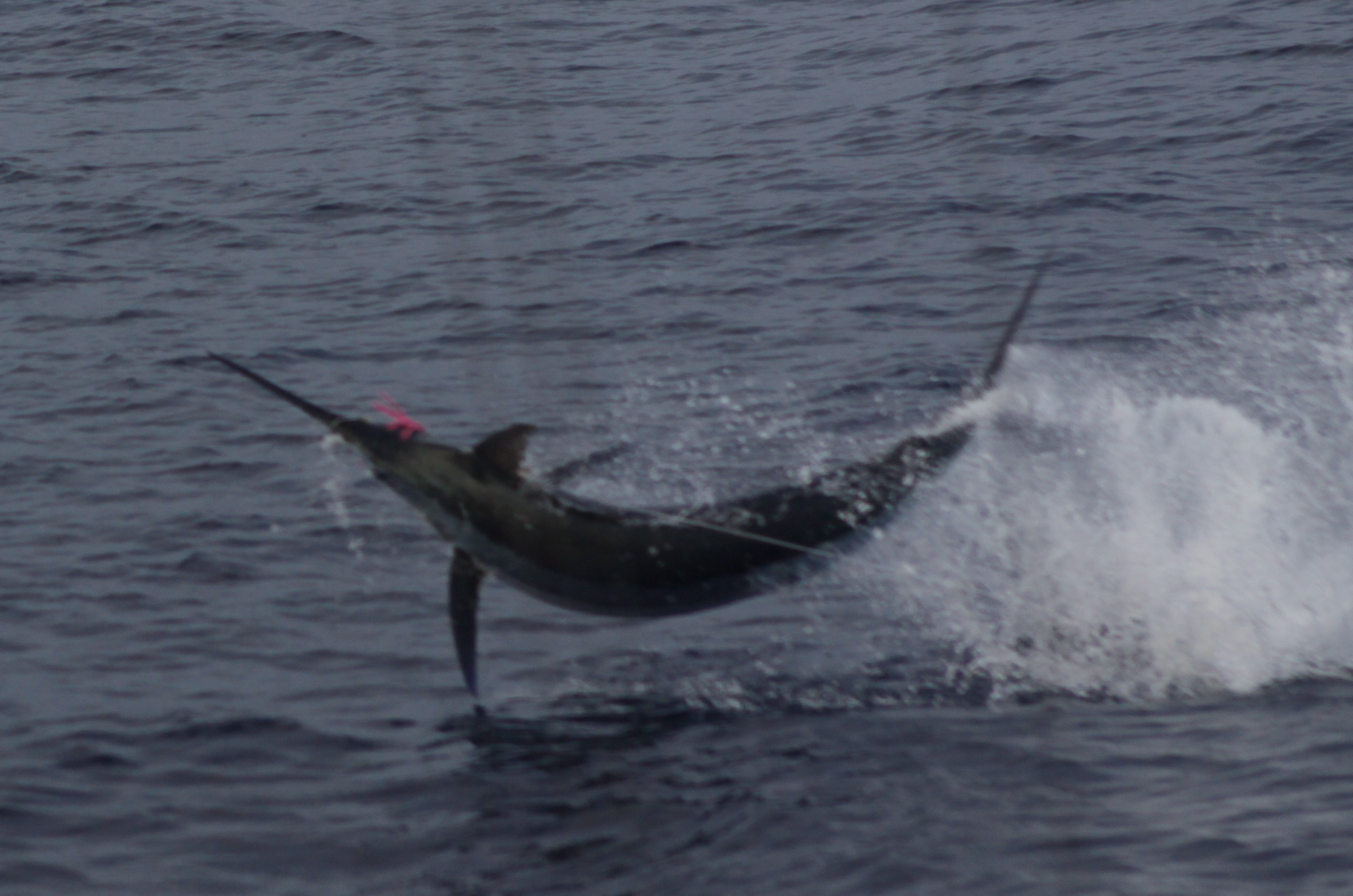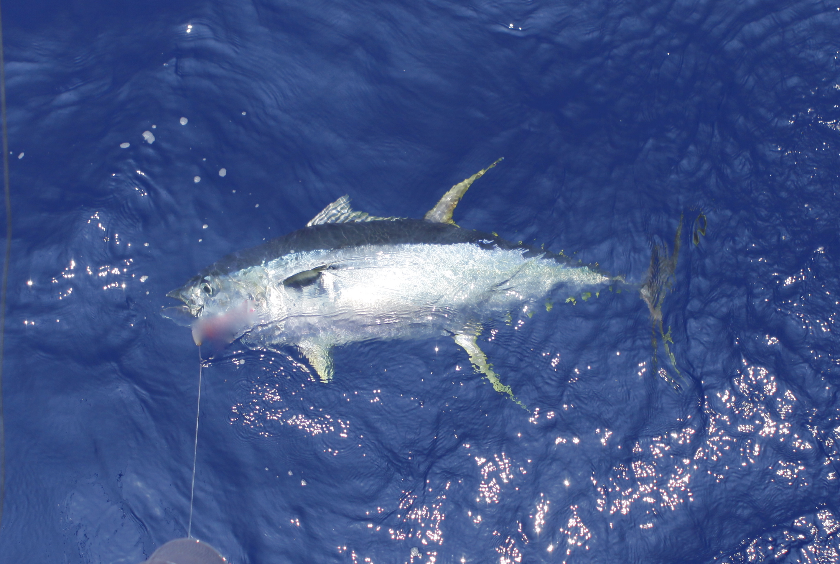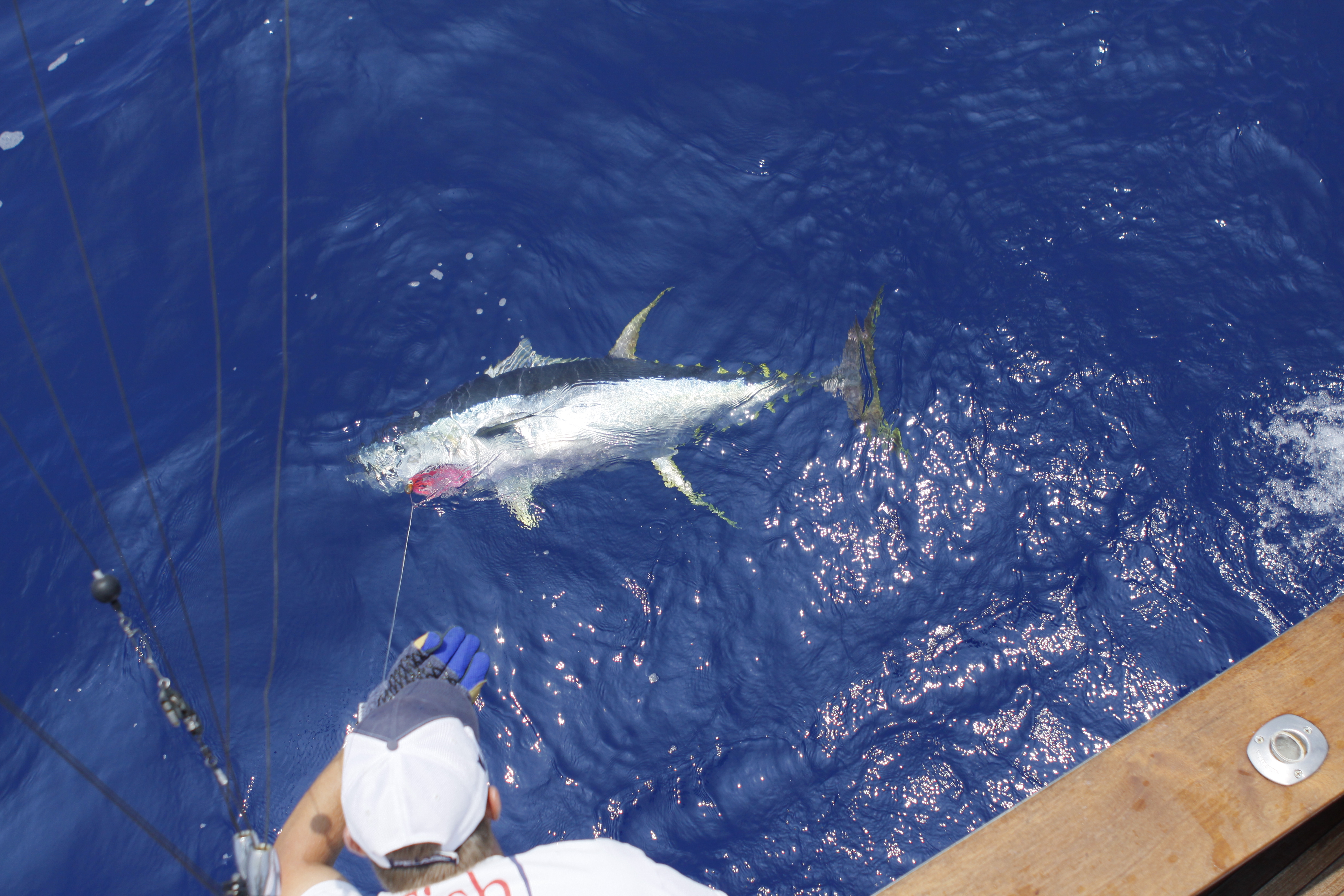Today we headed south and released a fish before 7:00am. It was nice to get one right away. We went to work an area we wanted to fish and it turned out that was where everyone wanted to fish so we kept heading further south than I wanted to. We went 1 for 3 way south and caught this tuna trolling seconds after we missed a marlin. I thought it was the marlin but almost was a double on a ahi and a marlin. We finished the day 2 for 4 on Blues and a tuna.