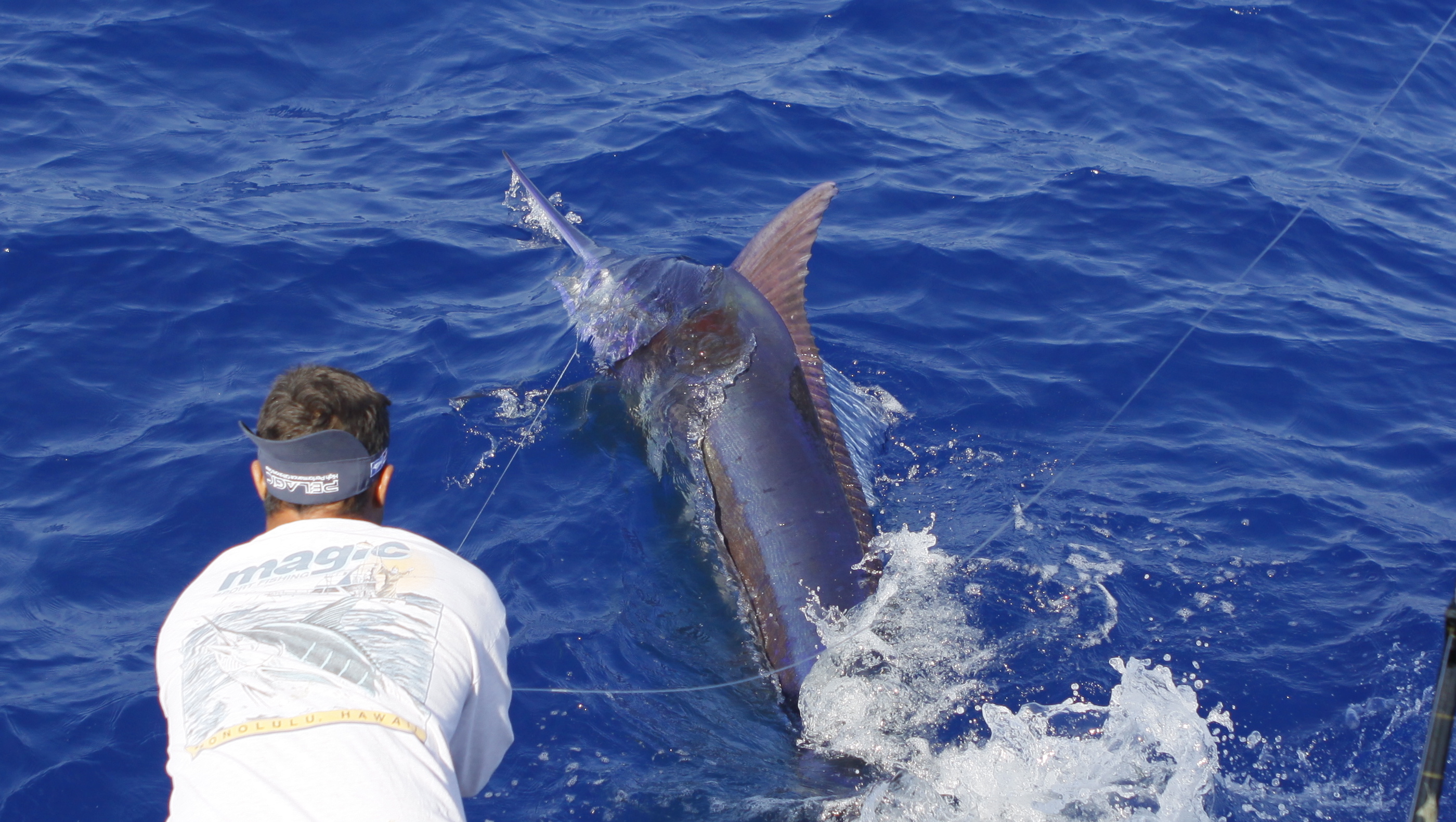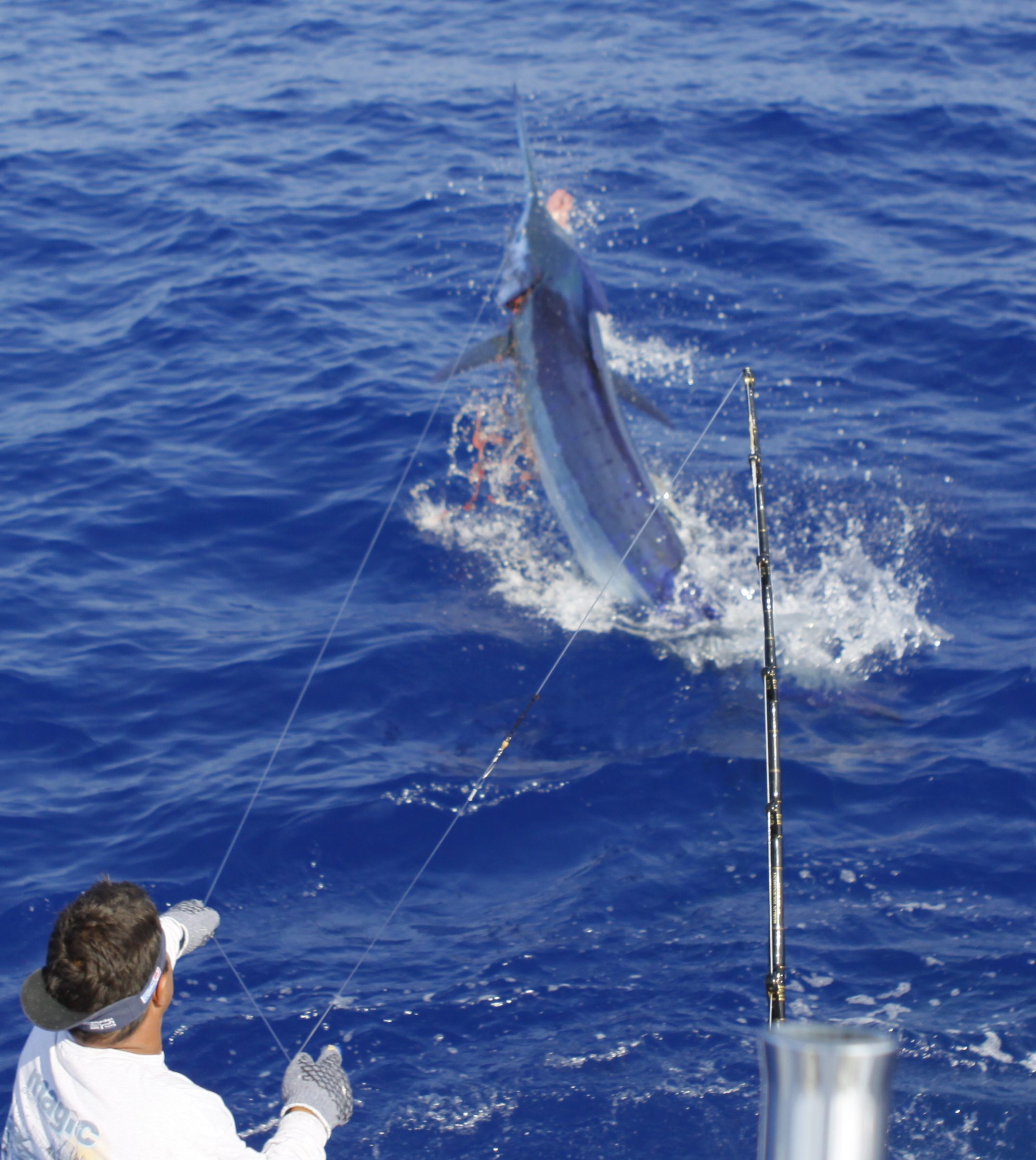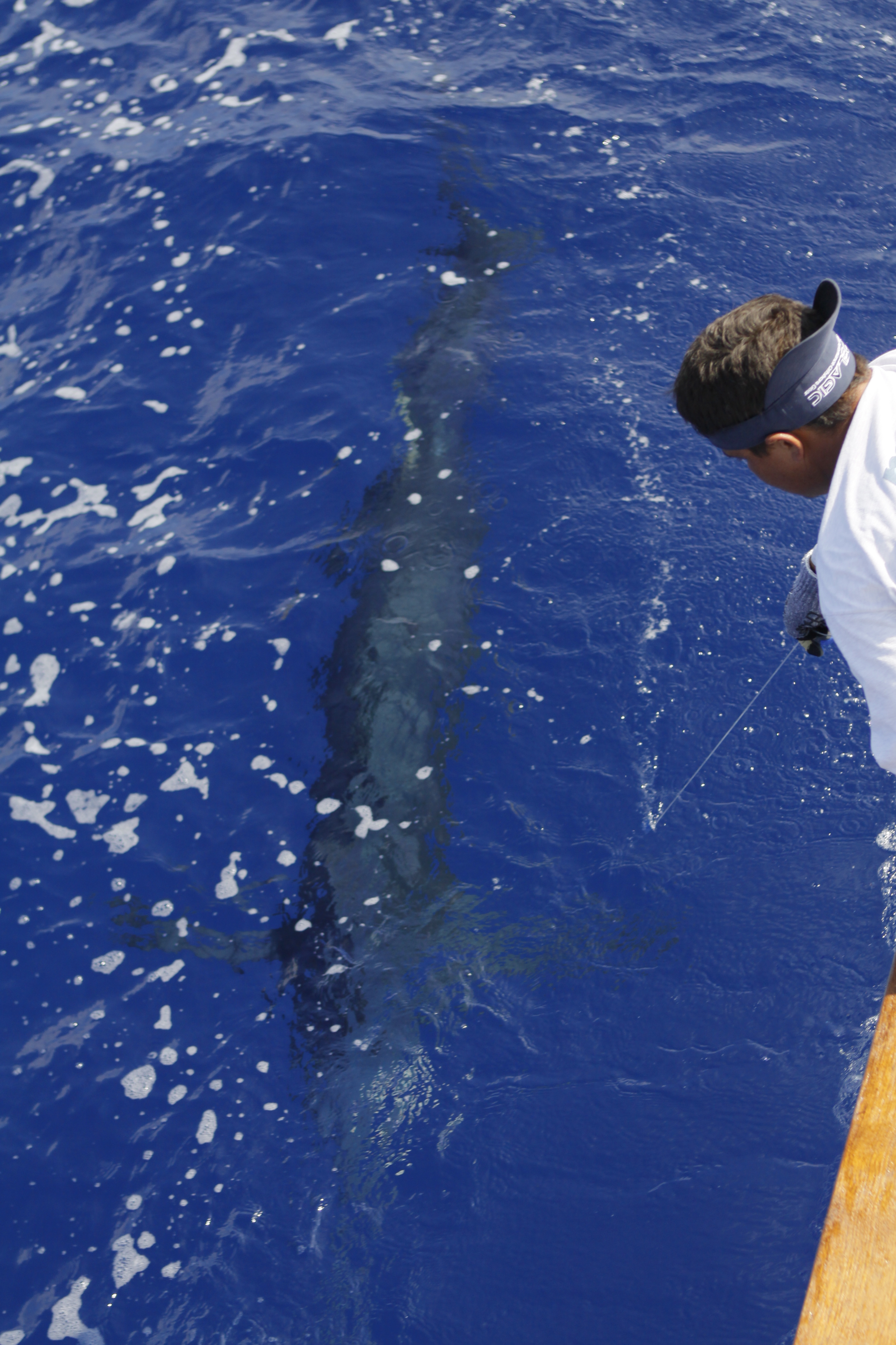 Today we went back the the grounds Mat had a trip on the 37 so Capt.Brian Balencio filled in with us today. We trolled up and didn’t get any bites. We changed over to bait early and caught a nice blue on our first set of baits. We marked a bunch of fish down deep that looked like ahi. We stayed on top of the marks and caught a second big one. The first blue around 500. It had the same short measurement as our fish in the Firecracker Open. 112 inches short. The second was a bunch bigger but was probably just under 600. Jake caught the biggest fish of the trip to cap off a great 5 day charter. 6 blues and 5 tuna.