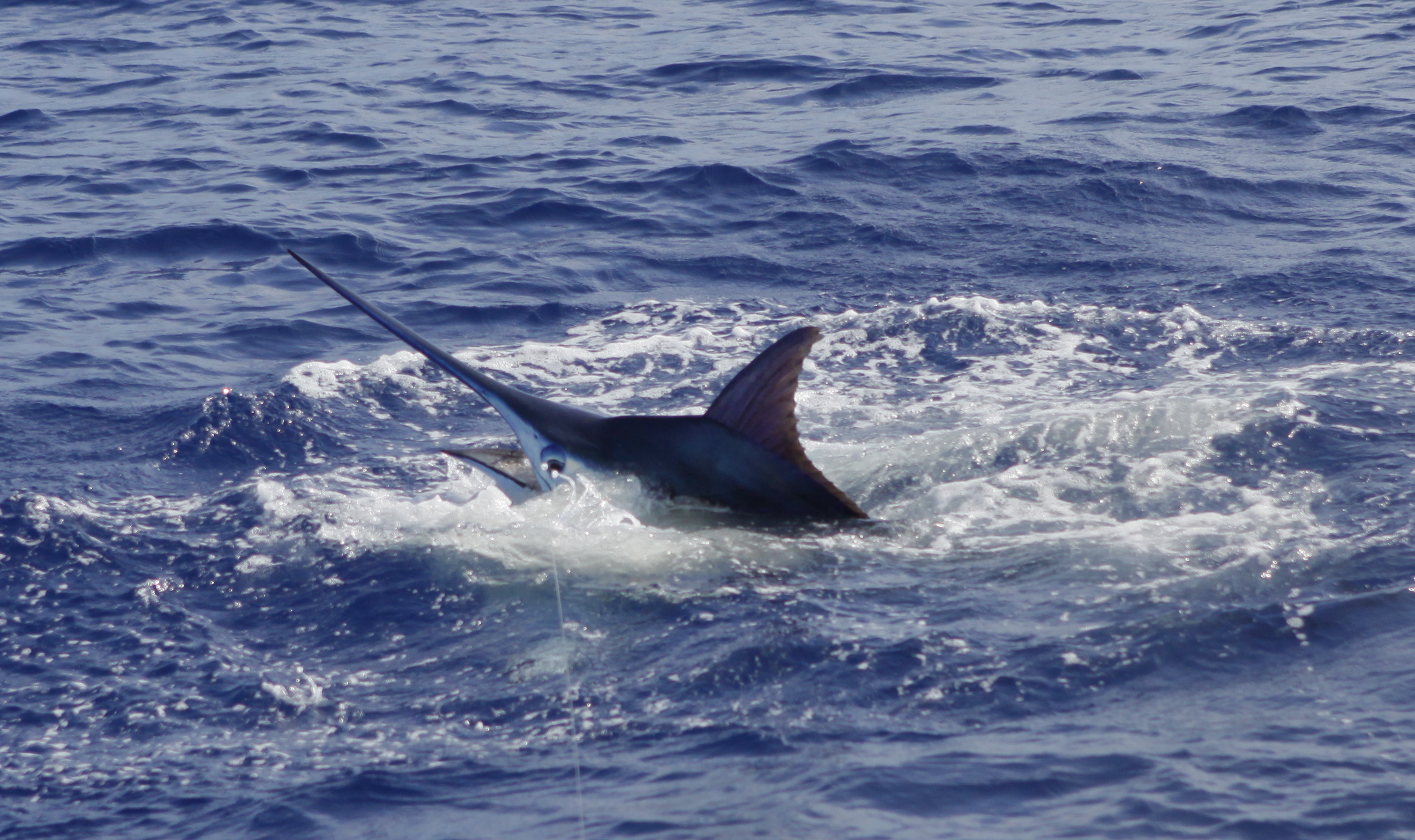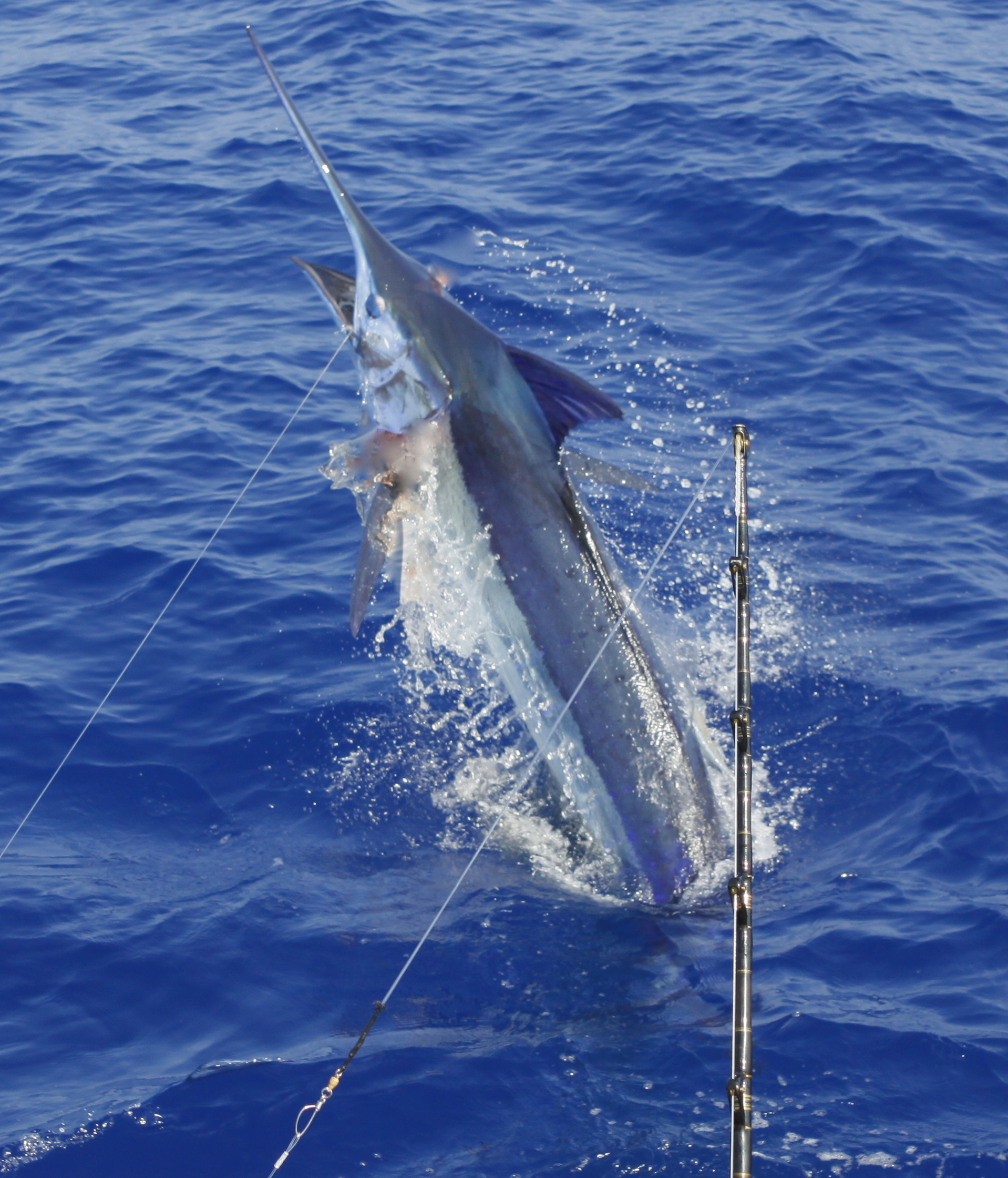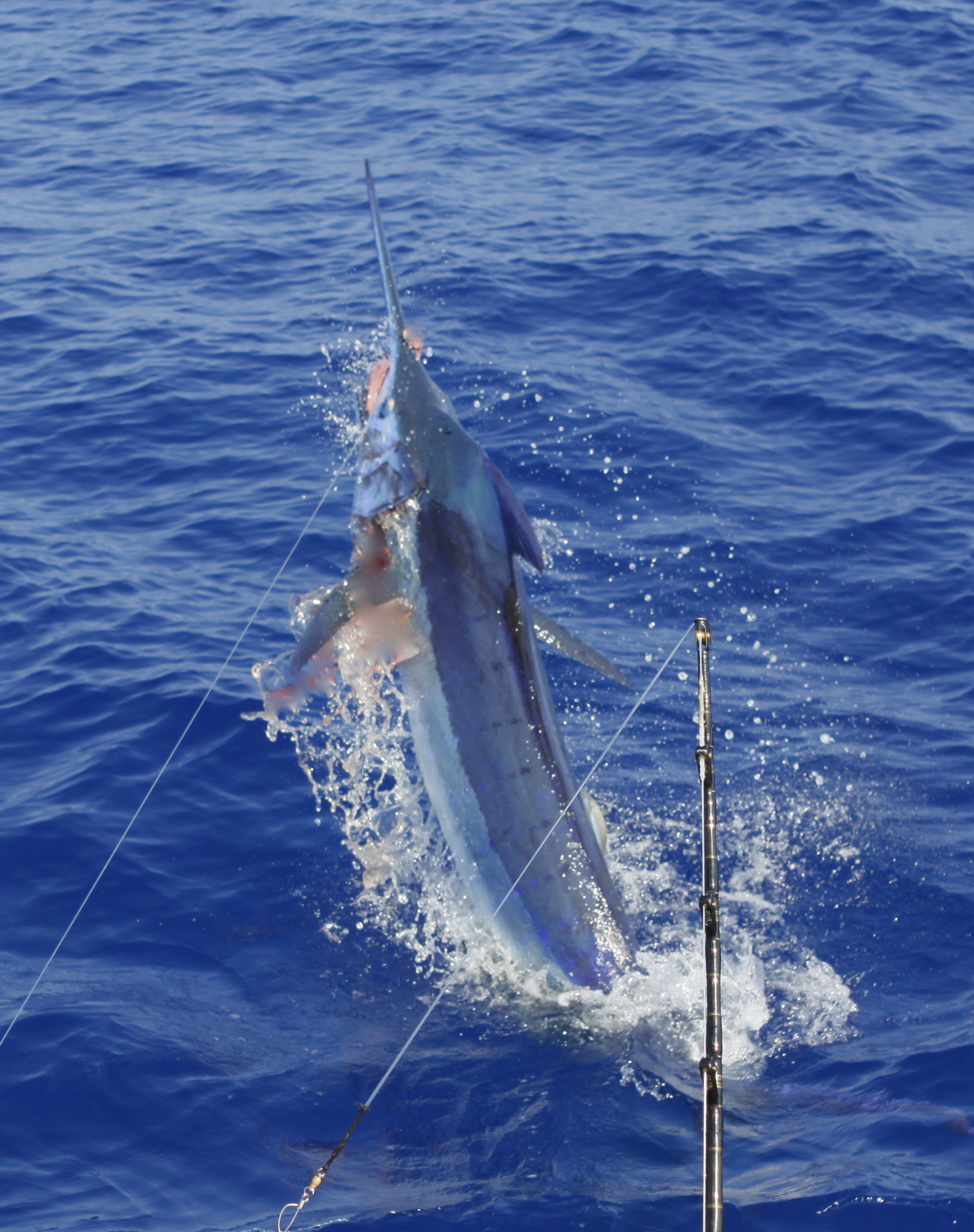 Today we went back the the grounds Mat had a trip on the 37 so Capt.Brian Balencio filled in with us today. We trolled up and didn’t get any bites. We changed over to bait early and caught a nice blue on our first set of baits. We marked a bunch of fish down deep that looked like ahi. We stayed on top of the marks and caught a second big one. The first blue around 500. It had the same short measurement as our fish in the Firecracker Open. 112 inches short. The second was a bunch bigger but was probably just under 600. Jake caught the biggest fish of the trip to cap off a great 5 day charter. 6 blues and 5 tuna.