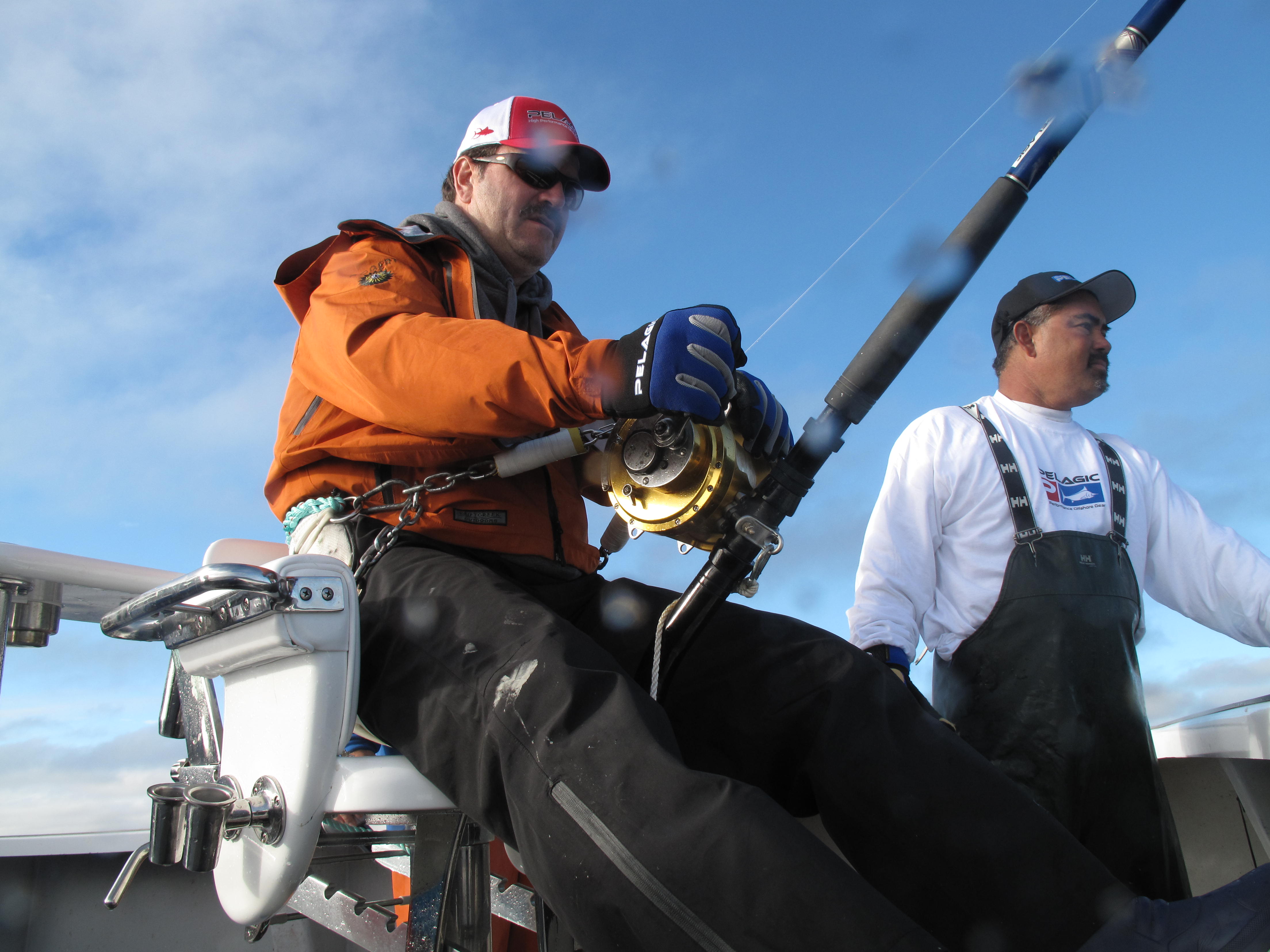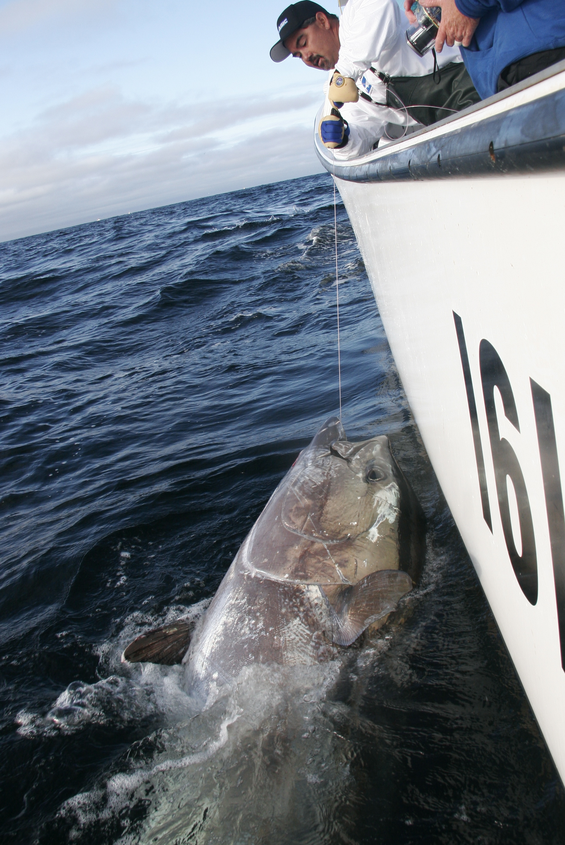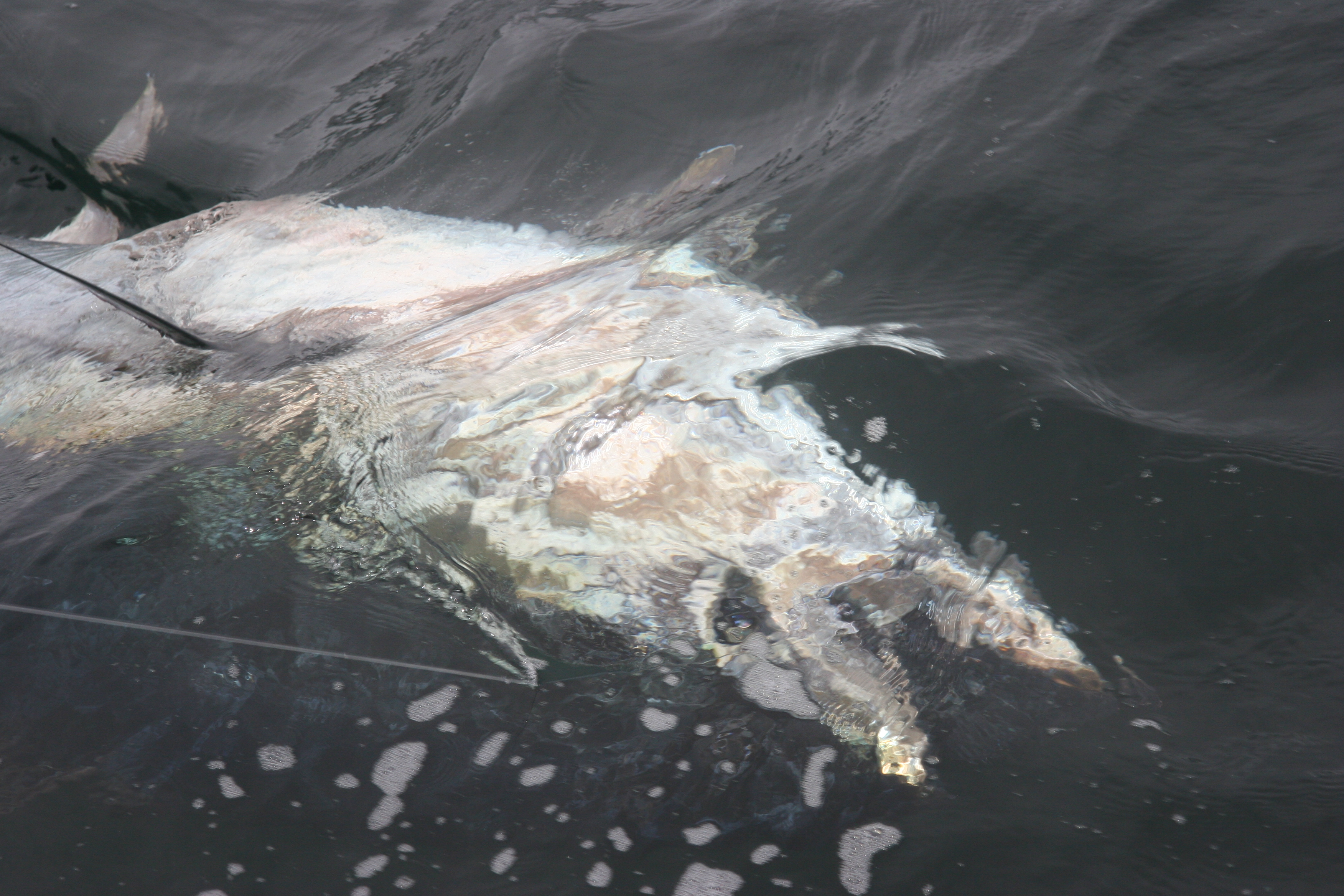 It felt great going back to start chumming again having released a fish so soon. The weather was great and once we started marking the bait we started chumming again. We made a few drifts on The Ridge before tuna came back to the chum. We selectively served baits to the fish trying to give the bait to the big fish in the chum. I pulled it away from a few and once a big one took the bait we let it eat the bait. The fight went smooth and this fish really pulled. AJ chased the fish down and Rob put good pressure on the fish. The fish neared and I got the wire the first time. To add to the drama when I let go of the leader the first time I burned a little glove mark on the leader that we had to watch for 10 more minutes as it went up and down right at the boat. I got the leader the second time and was able to finish the fish off. It made some nice circles on the leader and popped its head out of theater one time about half way up. I really didn’t want that but was able to settled the fish down once it dove back down. We got good measurements of the fish and the consensus was that the fish would be over 900. AJ called the fish 950.With a 10 foot short measurement it was long enough. The pictures we took sure don’t give the fish justice. Fishing on the lobster style boats it is really hard to get good pictures of the fish. They would have looked huge next to our 37 Merritt.When we were face to face with the fish they were so big it was incredible. Peter B Wright and I got one 971 pounds in the Bahamas that looked huge to me when we got it.I remember it was really hard to judge the size of that fish until it went to the scales as it is every time I weigh a fish of that size. The release was awesome the fish