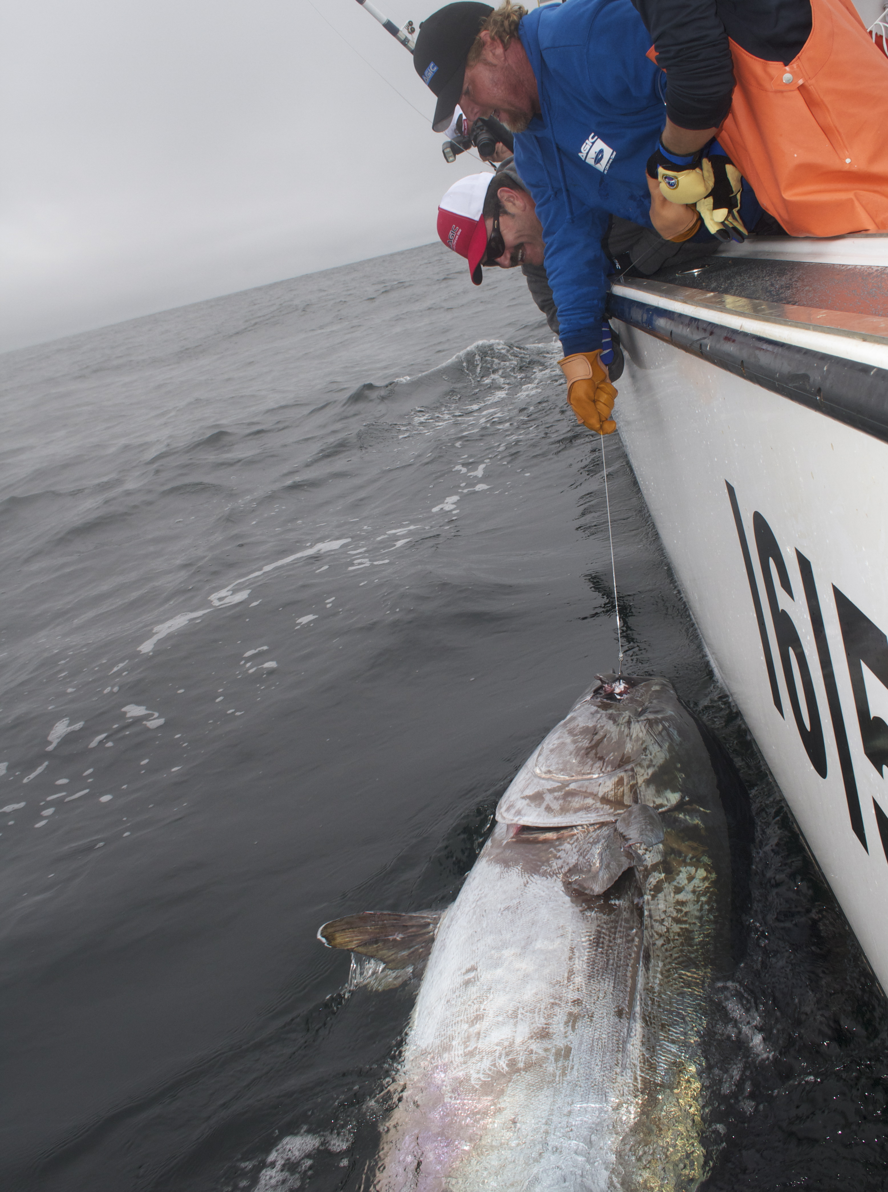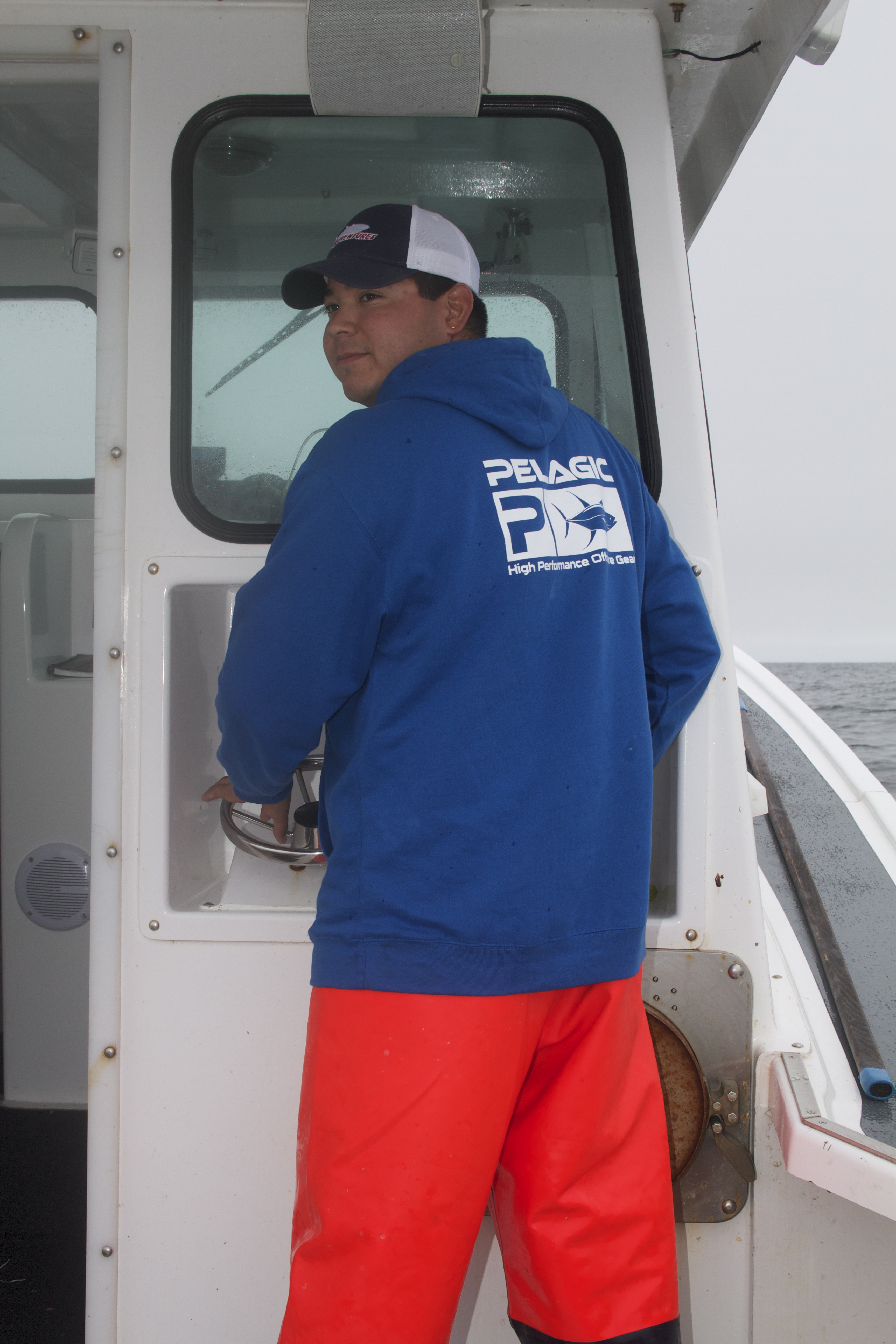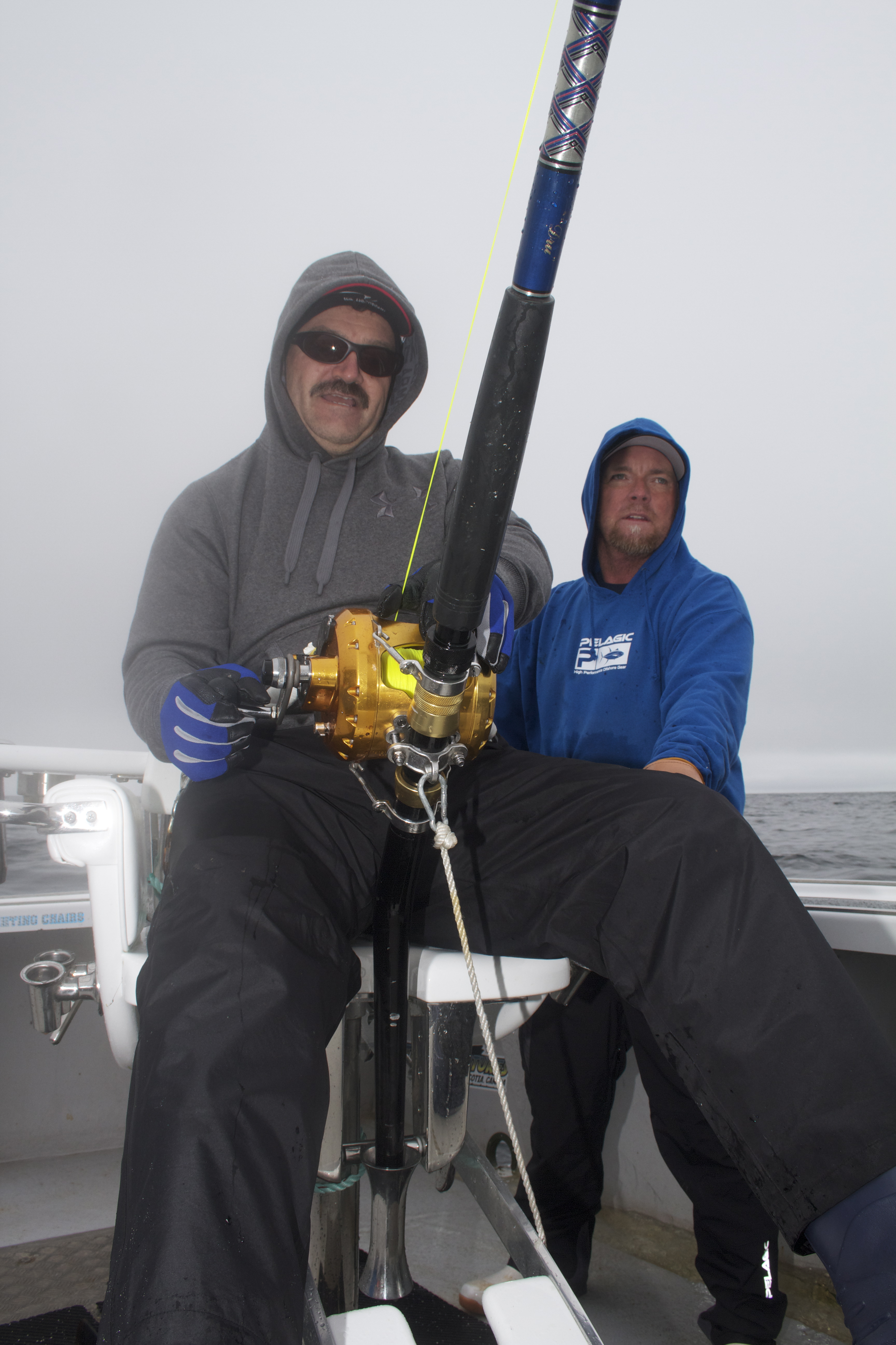 Jeff Mat and I could barely sleep the night before day one. The weather was good and the tuna were biting. Seeing the one at the dock made it real and shook the cob webs out from all the traveling. Rob and his friend Sam met us at the boat and we headed out to catch herring for bait. We had some frozen but caught fresh on the way out for hook baits. We then ran about 20 miles to “The Ridge” where we caught mackerel while we chummed with the frozen herring. We were there for a half an hour and Capt AJ saw fish swimming through the chum. I looked hard but couldn’t see them at first. I finally saw one by seeing the fin lets going through the water. They blended in with the color of the water so well they were hard to see down deep. 1 turned to 2 and 3 turned to 4 until we had them going well enough to get bit on our first tuna. Rob got it to the chair and our first fight was under way. Jeff was up first on the wire and got ready as Rob fought the fish with 35 pounds of drag. after 10 minutes we started to inch the drag up until we got to about 60 pounds of drag in about 45 minutes. Everything went smooth with the fight as Jeff reached for the leader of our first fish. He got good first wraps and did a great job on the wire finishing it off with no trouble. We got good measurements and pictures and let him go. The first hour of fishing and we got one over 800! What a start.