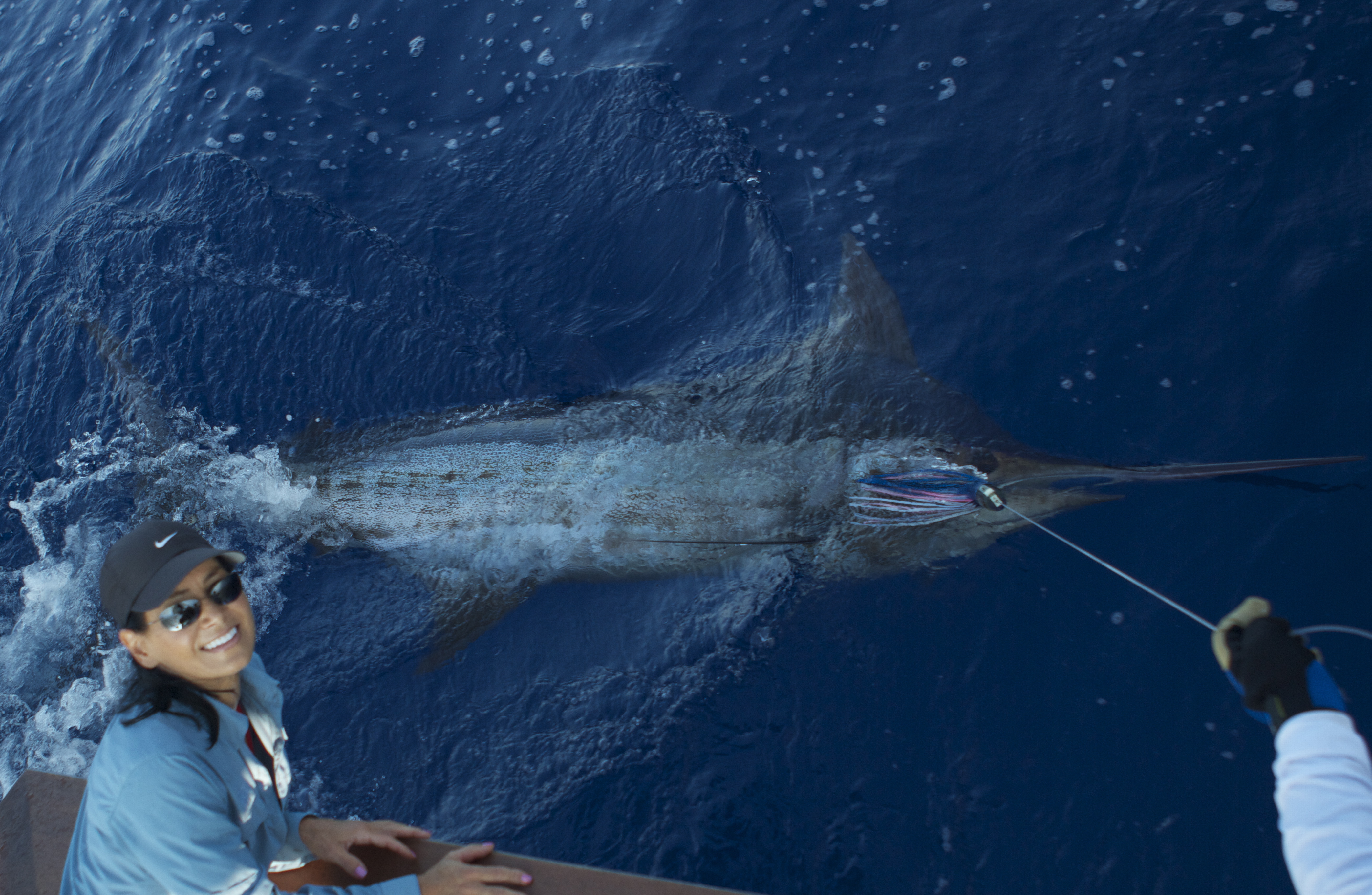 We got called on for what I call now mission impossible. Sandra Hiler in Indiana called to charter the Northern Lights to catch her two of the 9 billfish species she needed to complete her slam of billfish. I assumed we would start the first week of February or so to start trying. I suggested the dates around that time and she said that it was time sensitive and we would need to get a Pacific Blue and a Spearfish by the 27th of Oct. I made sure the odds were clear and we booked a week to try. We started early everyday and gave it all we got. Day 1 and 2 were slow fishing. I stayed outside the 1000 most of the day trying for the spear because I have good luck with them out there. It isn’t my favorite for blues but the spears like it out there so we found no fish at all. We caught a Mahi and could have caught other gamefish but stuck to the plan and hunted spears. On day 3 we caught this nice Blue which got the Pacific Blue out of the way. We went back out to the deep and pounded the 1000 with no luck on spears.
