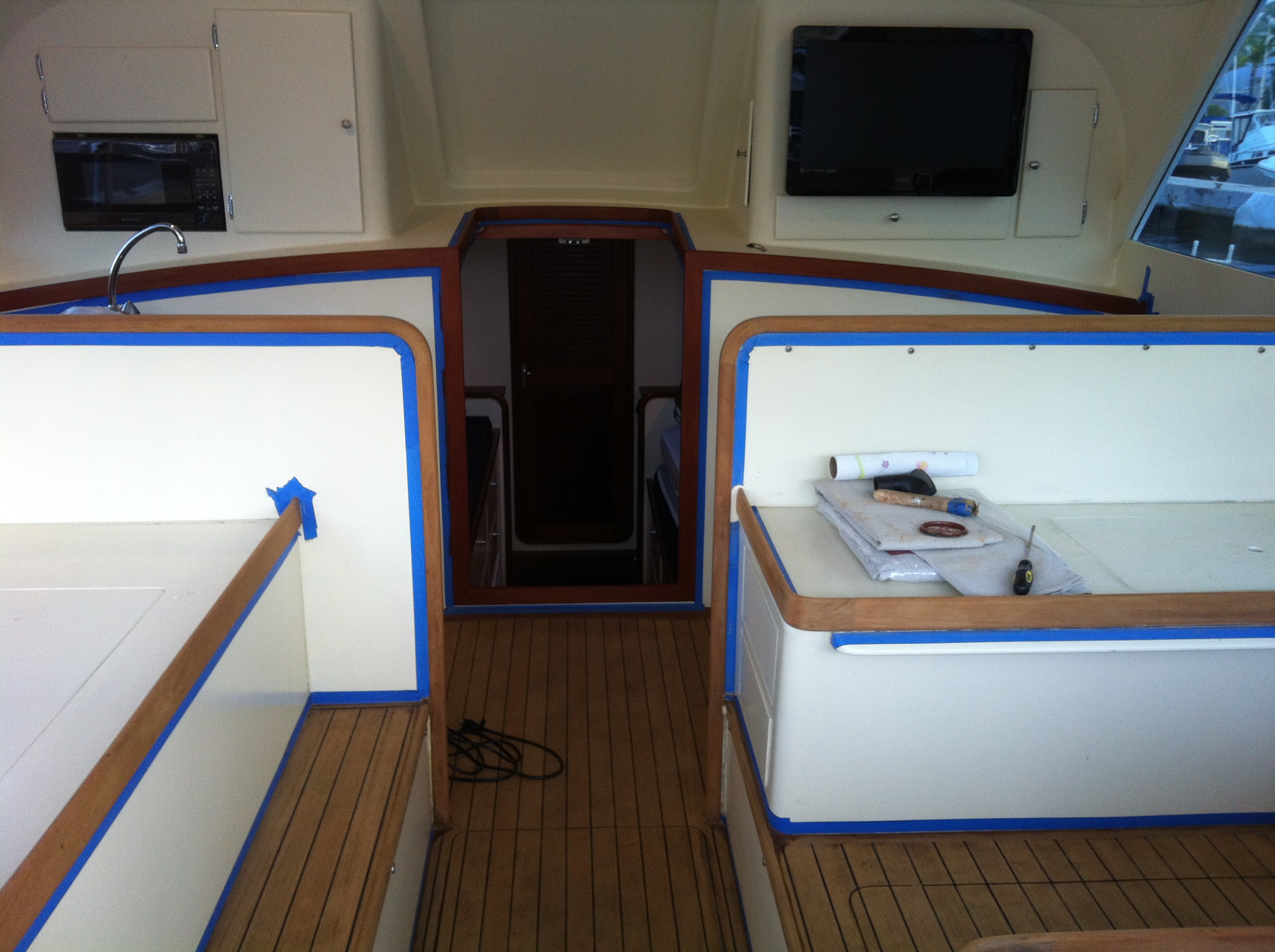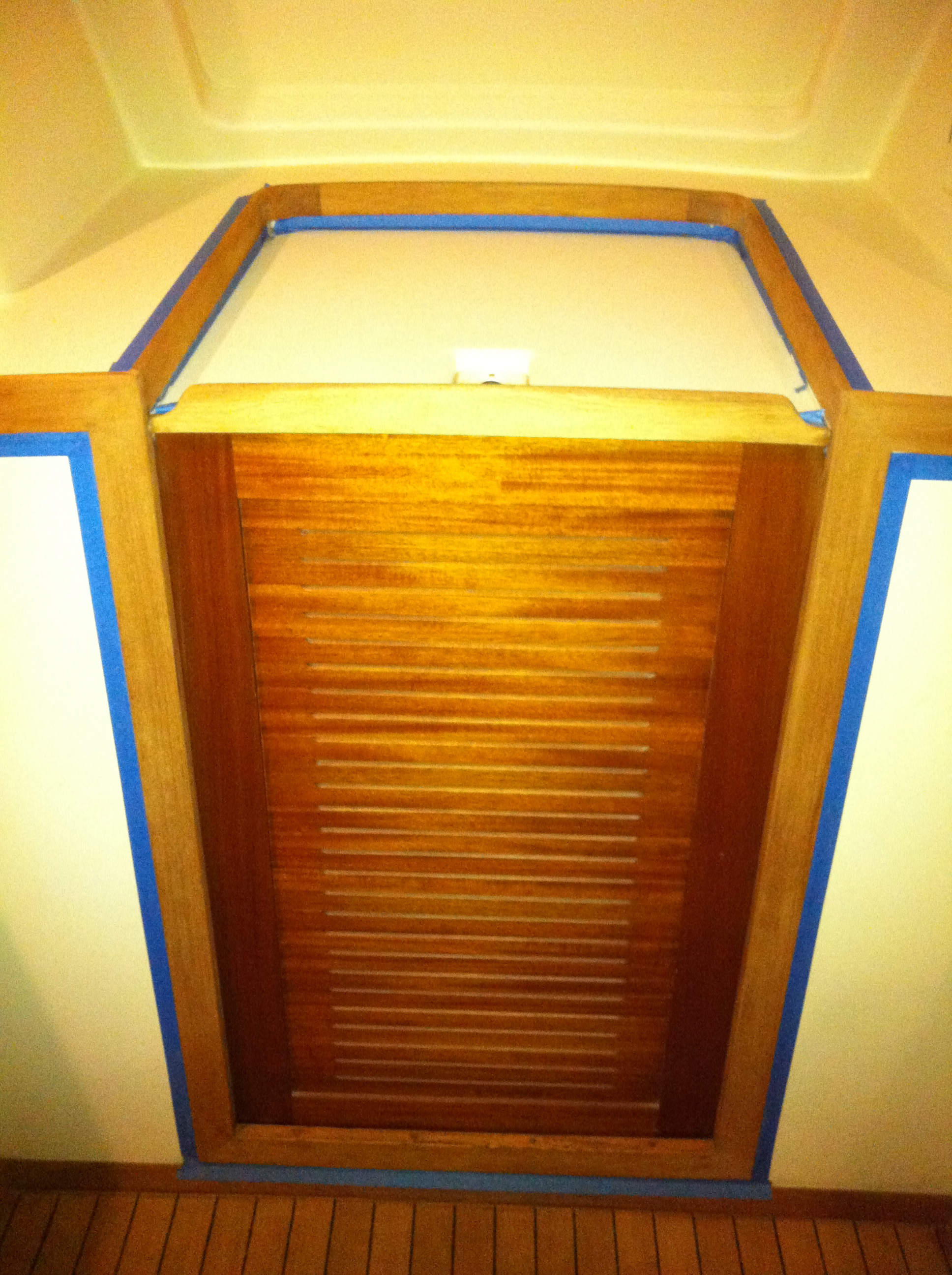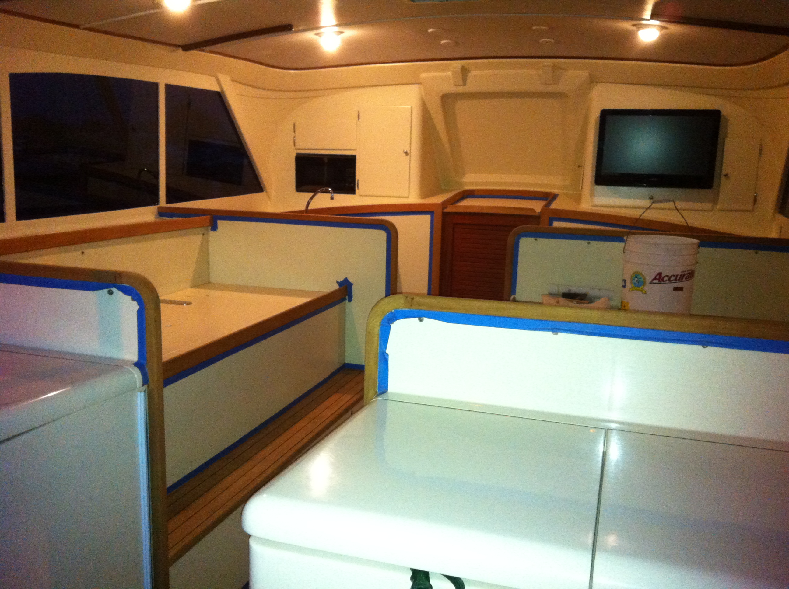 Here you see the wood stripped and some of the stain applied. It felt good to get to this stage. Once the stain goes on it is down hill from here. We use a filler stain that stains the mahogany and helps fill the grain. It is nice to get a good uniform color throughout the boat. I like when the wood matches.It looks newer and richer. When there are different colors throughout the boat due to stripping at different stages it is hard to get the uniform look. I like the mahogany and the stain for that reason. Teak is strong and holds up better to the abuse and raw new teak varnished is so beautiful. The challenge for me with teak is keeping everything uniform as the sun bleaches it blond. To keep the teak looking rich many times you have to sand the blond colored wood off the top to get to the rich wood below. This means taking a bunch of meat off of the wood to get there. The patches are harder on teak and you don’t have the stain to help match color when you have an accident and put a ding in the wood. The oils in the teak and the hard body don’t allow for even staining.One of the tricks that has been painful to learn after all these years of varnishing the boat is to sand down to 400 grit before any stain even goes on the stripped bare wood. It is so tempting late in the day after getting it down to 220grit that you just want to get the stain on. From what I have learned it is better to get the wood so smooth it is almost polished smooth before the stain goes on. The reason is that the coats of varnish to follow are fewer and it saves a ton of work later filling in the grain with varnish. With what we do with the staining if you have some stray sanding marks from stripping this sanding helps get rid of the last ones. At the 400 grit stage the grain is way less and mostly filled in by the stain. Many of my mentors and most captains of today feel the varnish is foolish and a movement towards painting the wood out is becoming the norm. At times I agree when a careless guest puts a big ding in it,but after working hard all week and it is shining in the sun it is beautiful and really makes the boat pop. It represents our commitment to our job.When we fish on custom boats with beautiful wood that is taken care of it just feels good. The custom boats of the vintage age all had varnished toenails and cab arounds at the least, so we like to try to carry on the tradition by keeping our wood varnished. As busy as we get there is time to get it done it just takes hard work to keep up with it. Next we put on the varnish and make it shine.