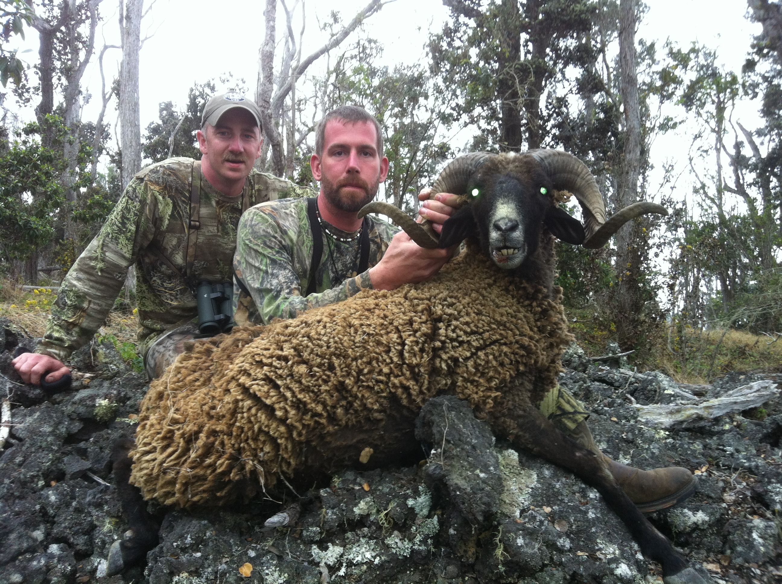 Friends Brian and Noll came to hunt on the Big Island with us. We had a schedule issue to begin with and appreciate the guys patience while we worked it out. We seem to get busy all at once and had a overlap when they got here. We rescheduled their hunt and it turned out to be a good thing. We had good movement all morning into the mid morning and got on a good herds. Brian got a good sheep out of the first bunch we saw and although we saw another ram in that herd Noll waited. I the early afternoon we found a small herd in a remote spot and were able to get on them. Noll made a great shot through the trees and we got this nice ram. The ram had a broad head stuck in its horn. This was upsetting to see because we can see that unauthorized hunting has been going on. Seeing signs like this the security has been bumped up with more cameras and patrol being put in place.