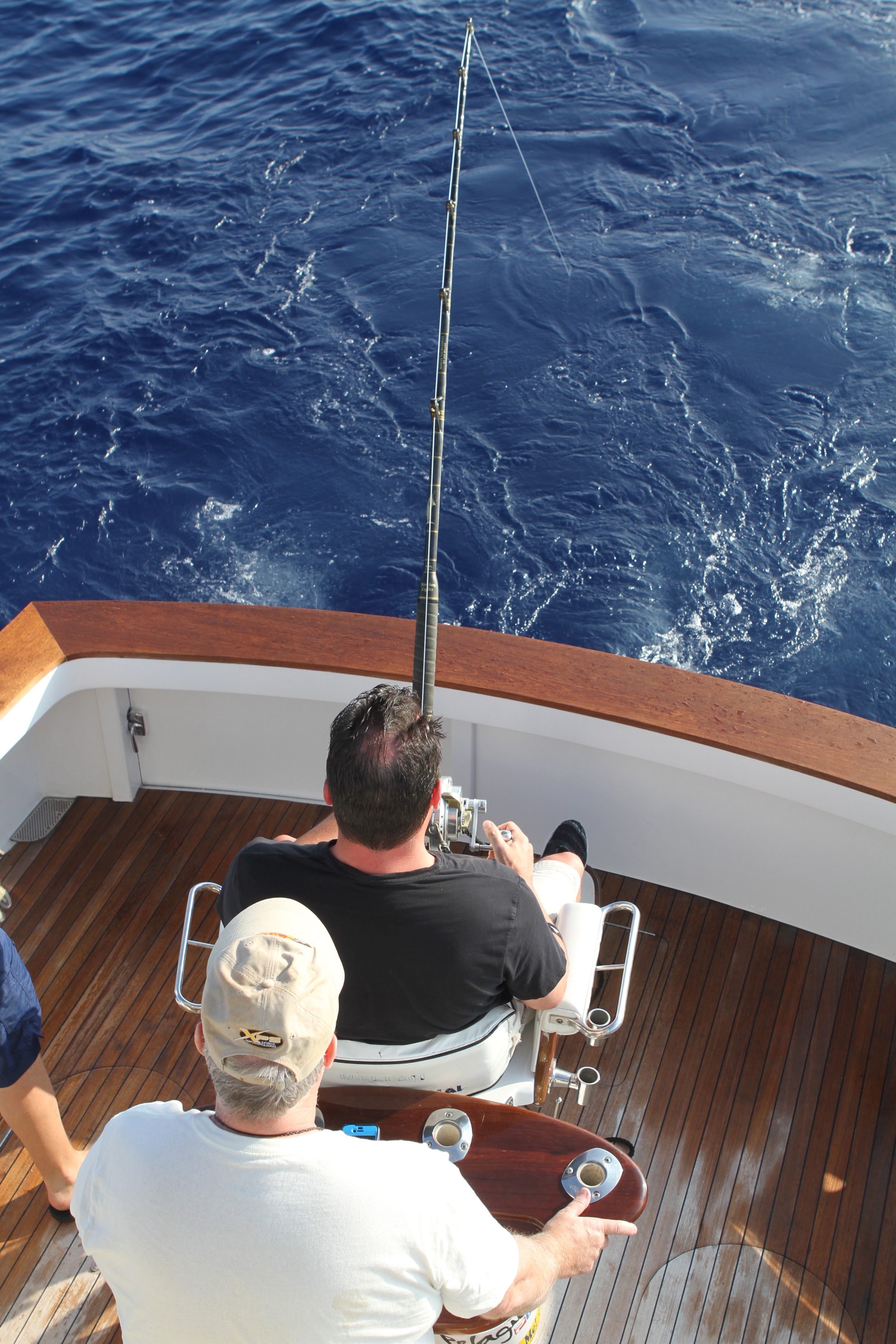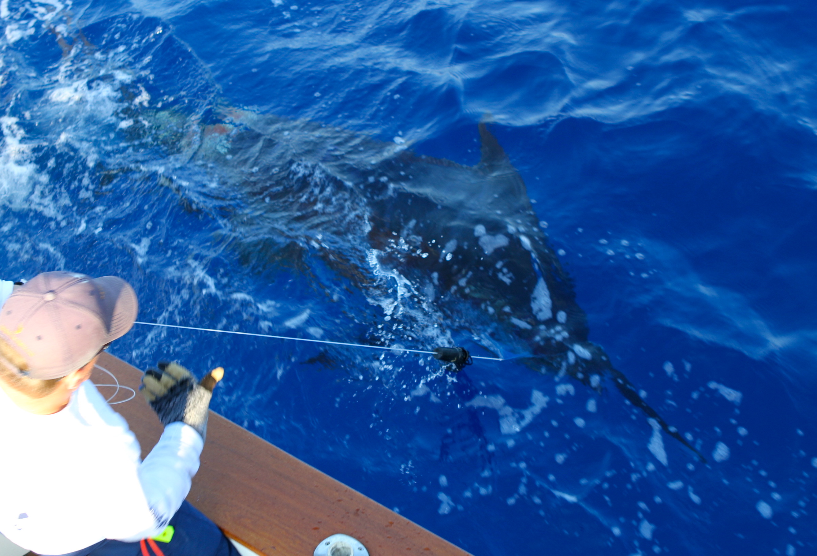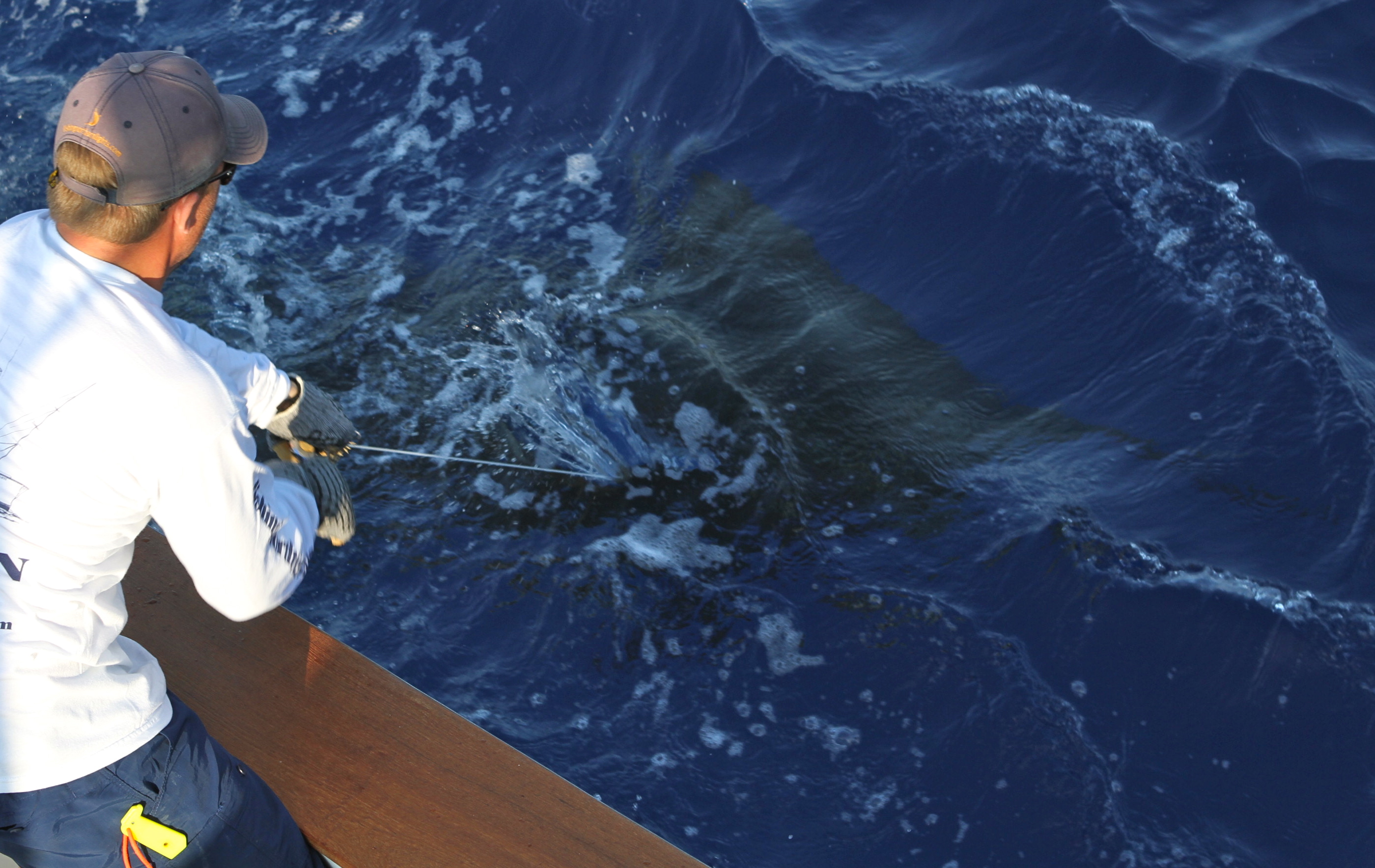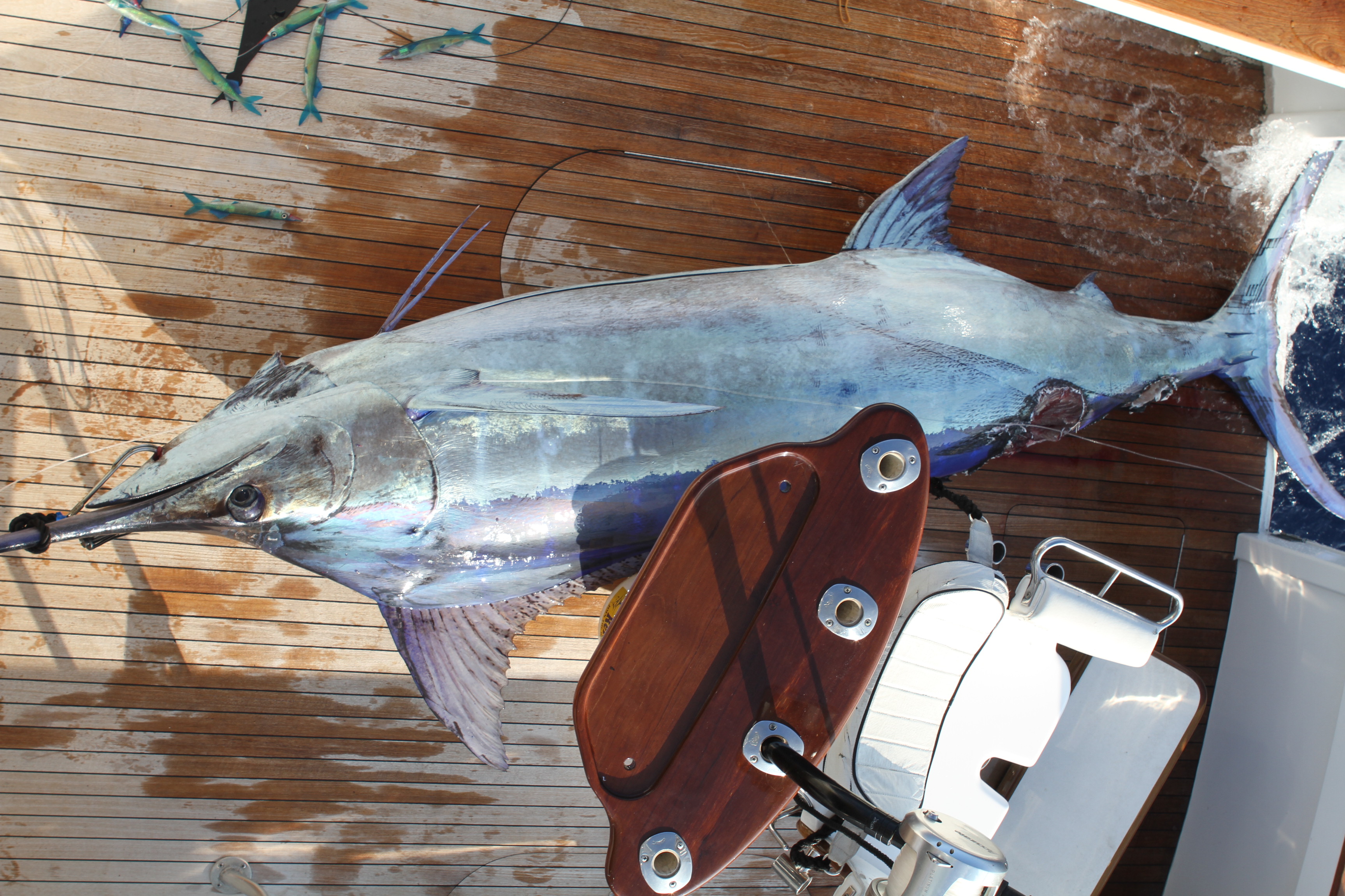 Curtis Wells return customer and his buddy came to fish with us again this year. We got the trip off to a good start by catching this nice blue. We caught bait in the morning and headed off shore. I had heard the bite was deep so we shot for the 1200 fathom line where I turned south. Just after our turn the fish came to the long corner. It was a beautiful bite. Bill out of the water and the dorsal up. She climbed and climbed until she got the lure. Once hooked she took off. I turned and chased on her twice and after the second chase we idled up the slow moving line while it still was on the surface. The fish had settled but we got the easy line while we could. as we idle up to the fish I looked back only minutes after hooking up and a big white tip shark filled the boat right at the transom. It was a the all tackle record for sure. It would have beat the current record by at least a 100 pounds. I spun around on the line now straight up and down. Mat jammed to bait the shark and unfortunately it would bite what we had. We saw that we need to put the drag up and really pull on the fish to get it before the sharks got to it. Mat bumped up the drag and Curtis pulled in low gear. 10 minutes later the fish was to the boat and 3 sharks attacked it. It swam up the side with 3 bites out of the tail. Now it wouldn’t survive the release. If it had not been bit should we have let it go into the mouth of the sharks? The decision was made for us. We had to bring it in and eat it. it was a shame but we got to give the fish to friends when we got in.