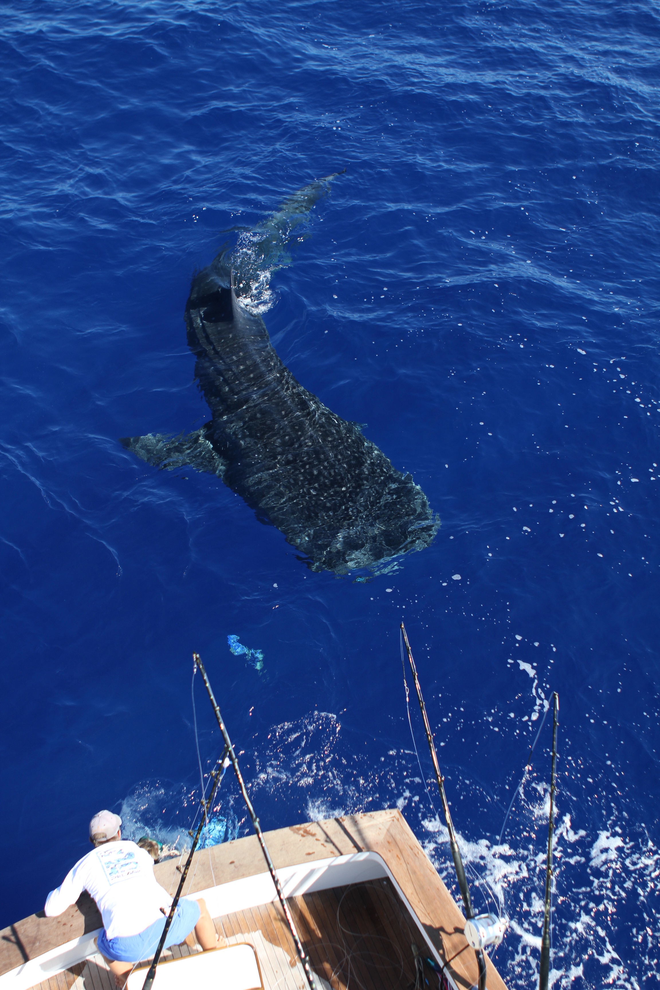 We saw this whale shark out there 1200 fathoms outside the harbor. We had a double spearfish bite not long later. We ended up working the area that the spears were and got bit on the short bait on a fish 400 or so. It jumped all over far away. I missed the good shots with my camera. After 30 jumps and a bunch of line out we got all the line back a little at a time. inside the mark the Marlin pulled free. Nooooooooooo! I couldn’t believe it but that is fishing for you.
