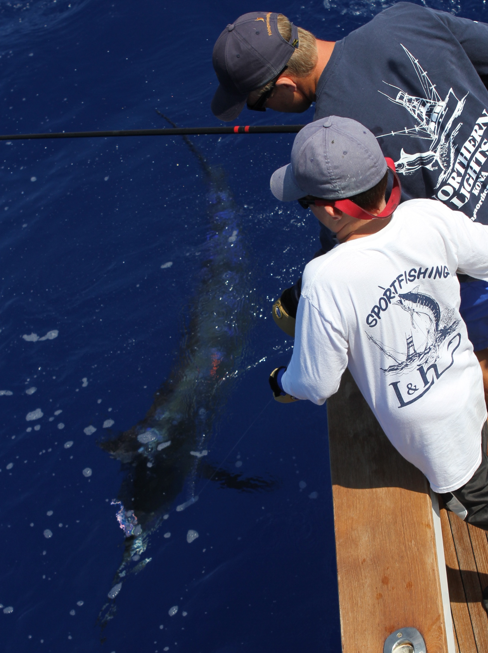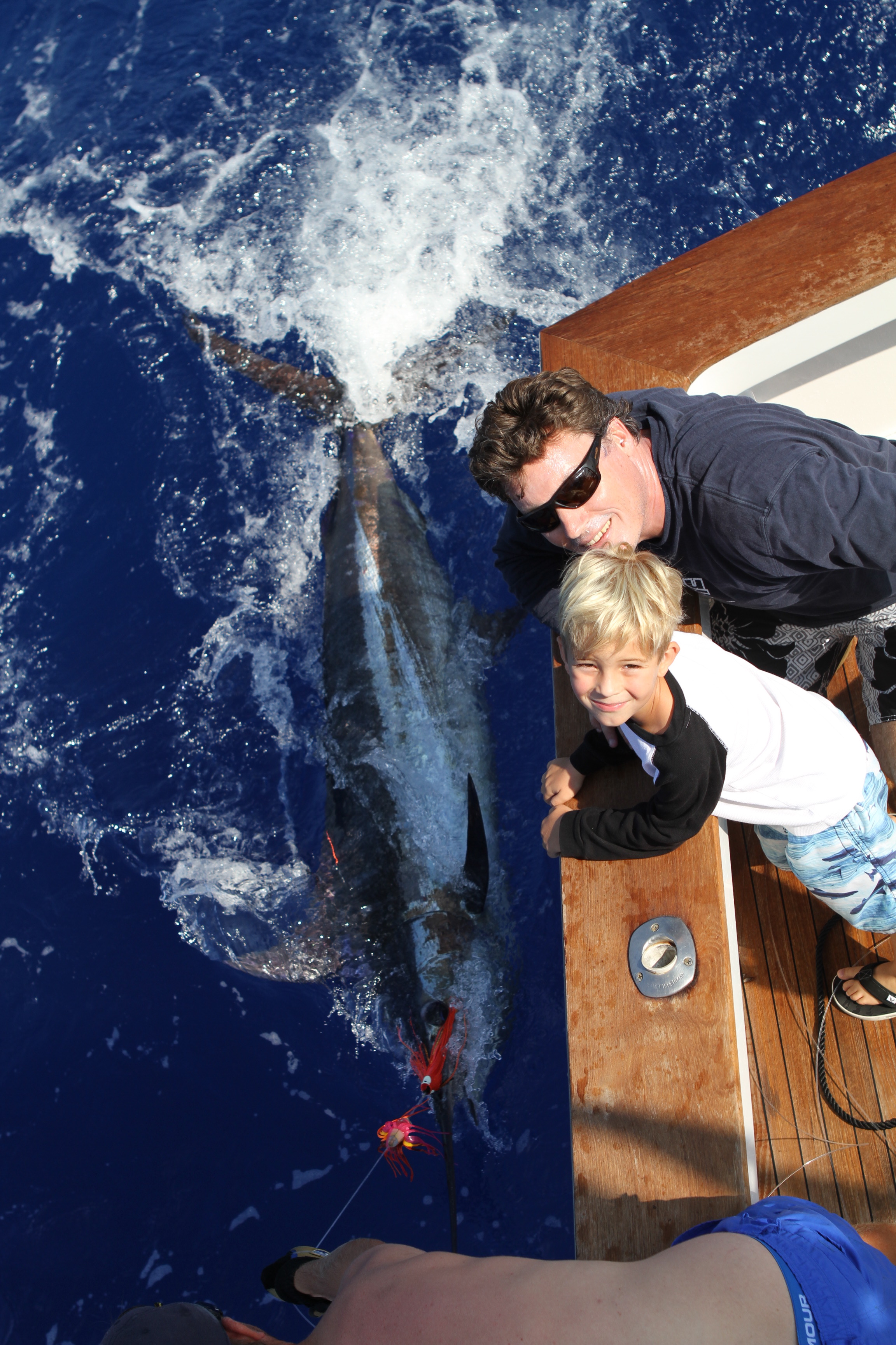 Today we had Jimmy’s brother in law Trey and son Nate “Nate Dog” Miller had a great day to be honest by accident. We caught a spearfish to begin with out in the deep looking for the dolphins. We trolled away from where we caught the spear and minutes later we had a blue bite the long rigger. We got a tag in the fish and I worked the area. I marked a fish at 20 fathoms then one at 40 fathoms so I kept working the area. I gave up and left and went in towards shore. 20 minutes later we raised a small fish on the teaser and teased it in for a bit and it went back and bit the short rigger. We missed him on that and ended up hooked it on the long rigger and jumped him off. I turned to go back out to the spot we were getting bit and got another one stuck on the right rigger.  James did a great job wiring today. At 13 does a great job! Here you see Mat standing guard and talking him through each one. Once we tagged no 2 we tried a pass to the inside and got another one on the inside on the 500 fa line. 3 blues and a spear, nice day.