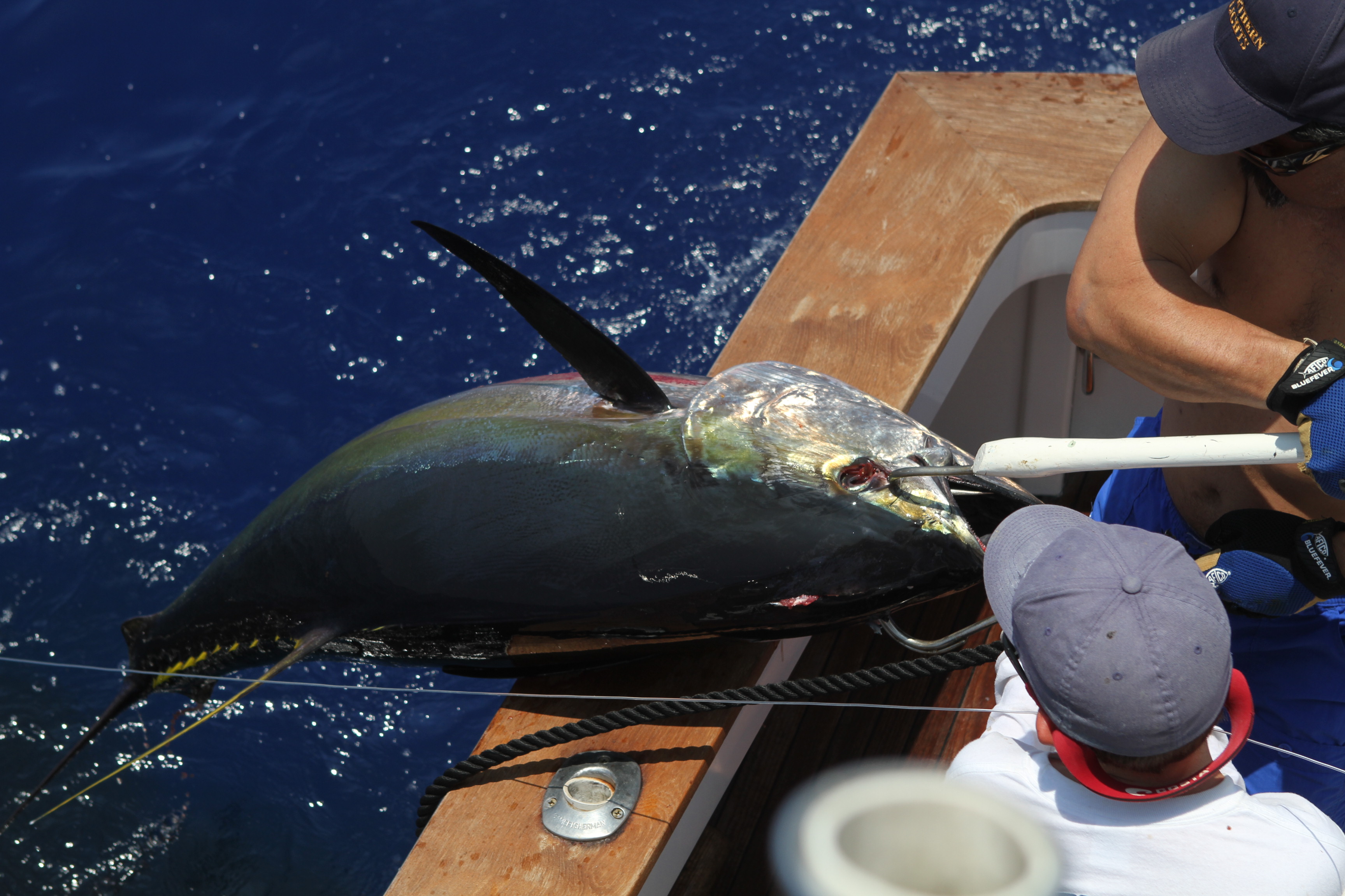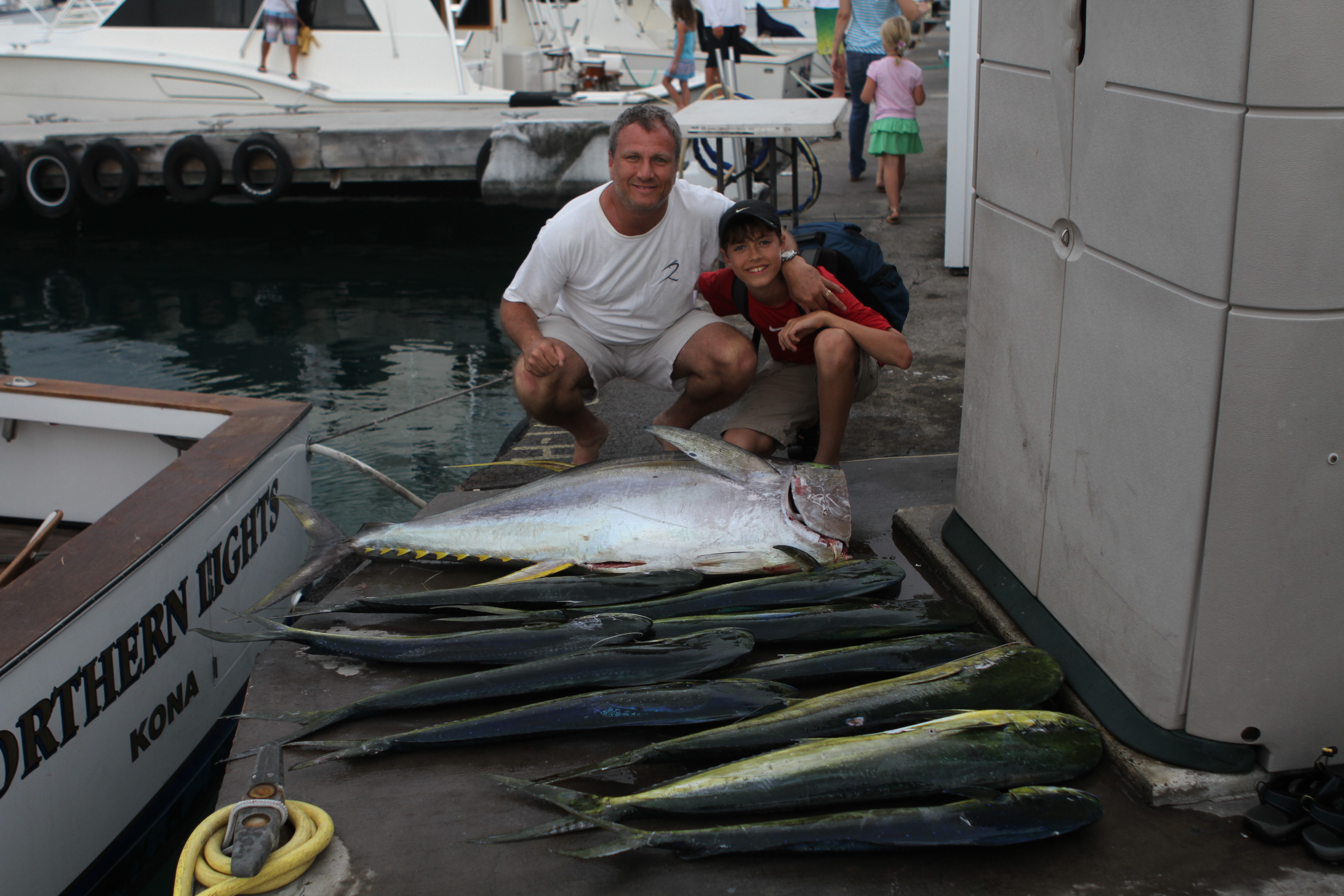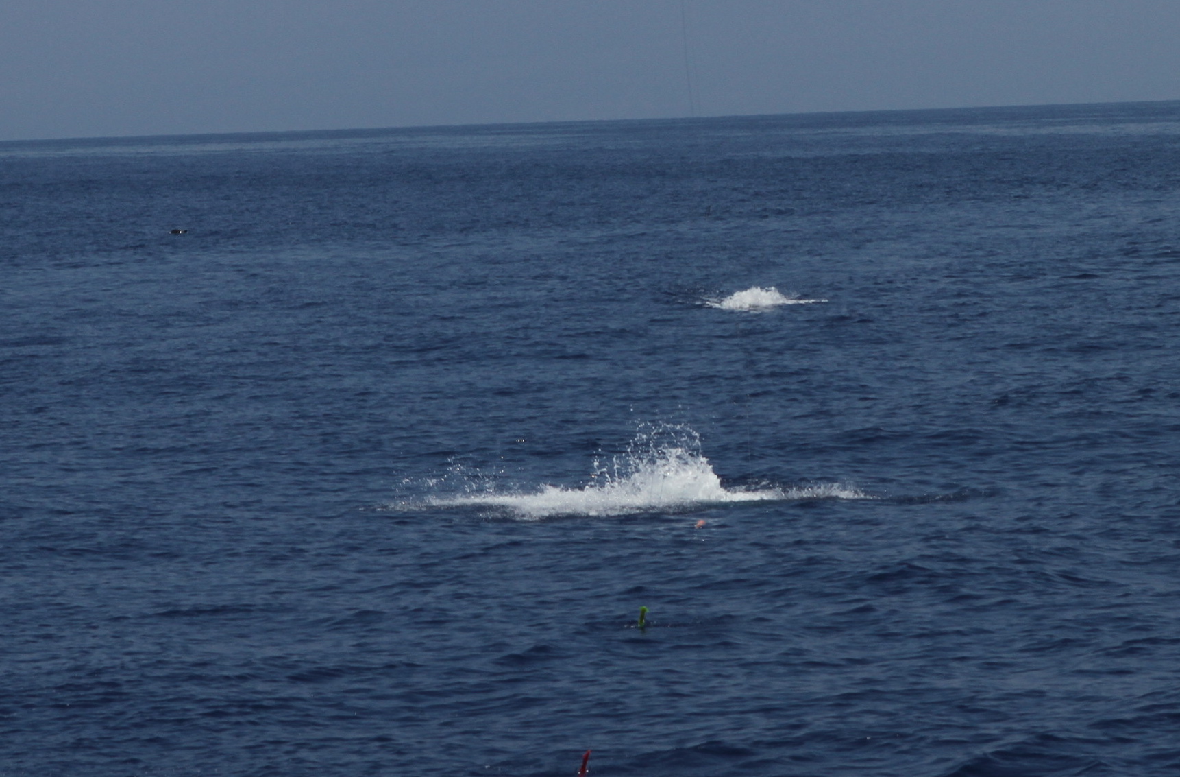Eric and Alex Seidenberg fished on the Northern Lights. We went back to the deep spot where we saw all the fish yesterday and right on the spot we raised another Marlin in the deep. Unfortunately we pulled the hook 3 times. We worked the area and found a floater with a bunch of mahi magi under it. We caught a bunch and then I dove in a filmed the rest of them. I will be posting the video on our u tube channel soon. After we finished with that I looked up and saw perfect porpoise school charging up. We put up the stick and got bit in a epic pass. The ahi were jumping and feeding with the porpoise when we got bit. Here you see the bite on the stick. The bird in the background. Freddie David got the shot for us