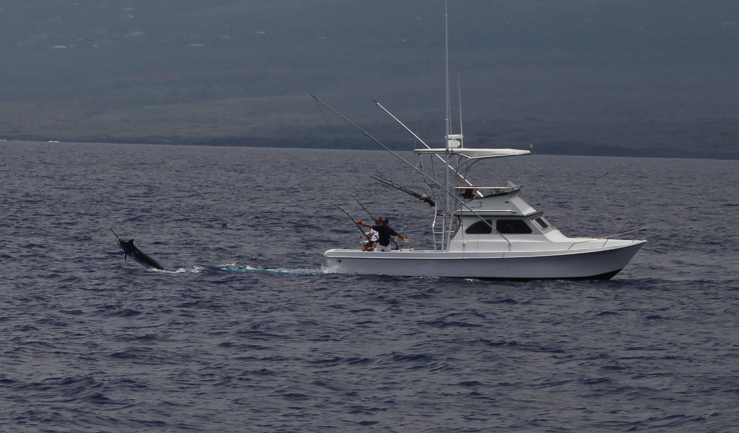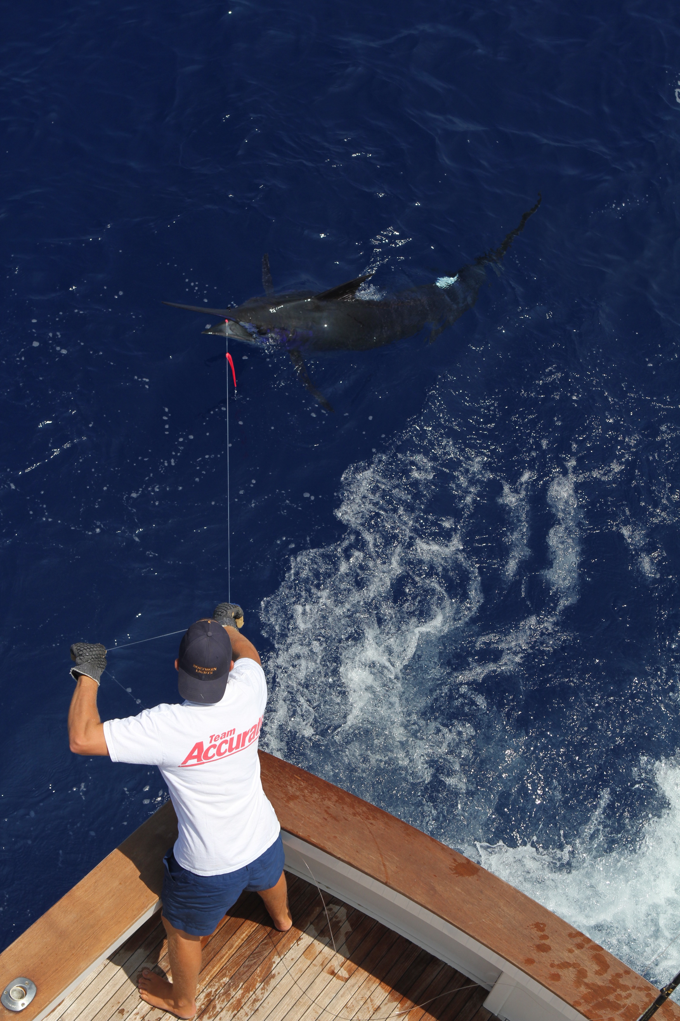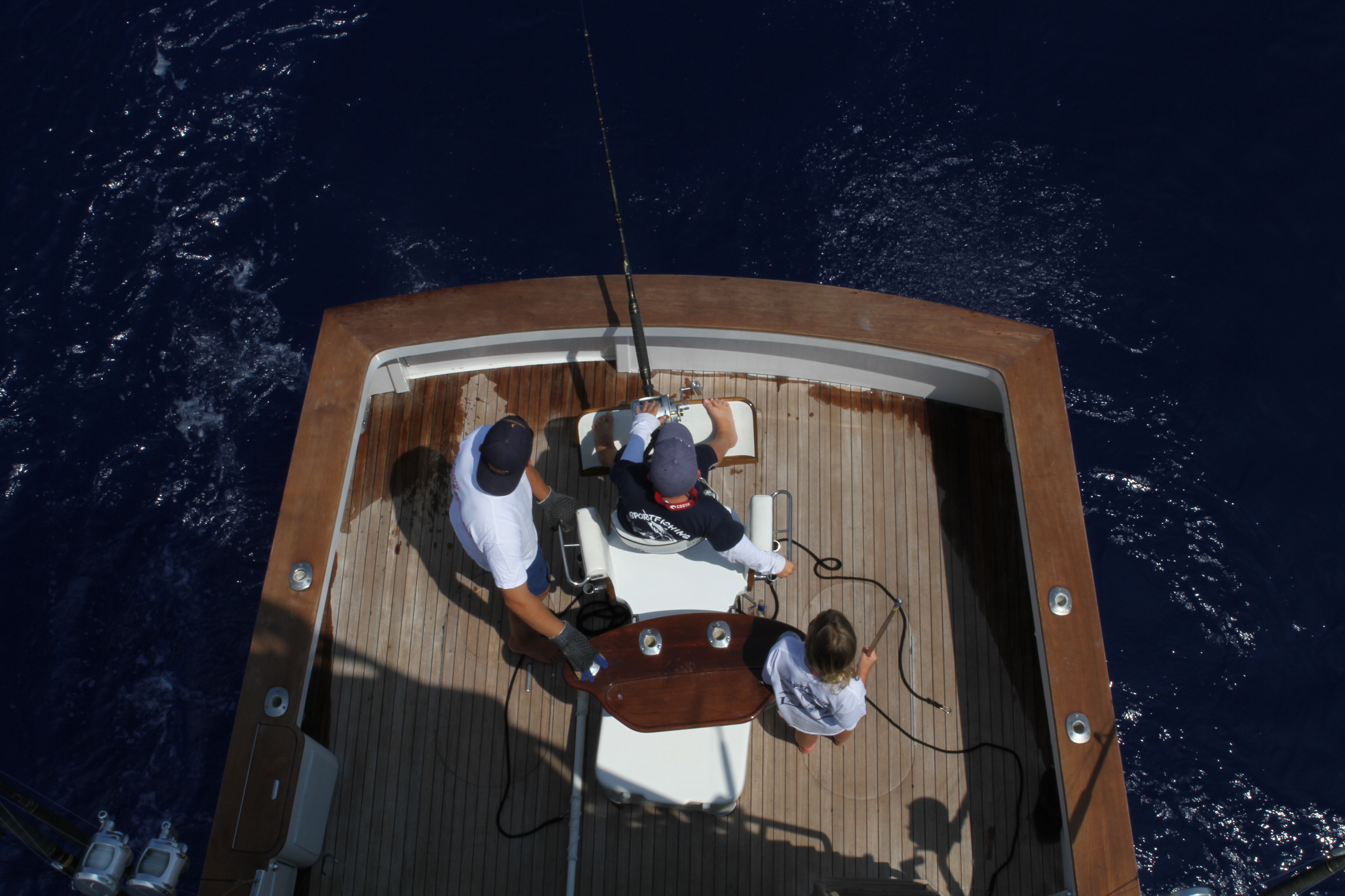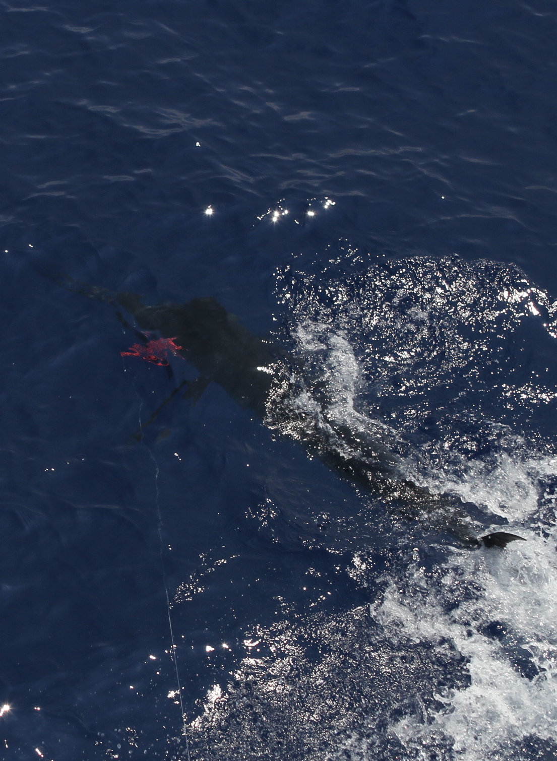 Today we caught this nice blue bait a switched this nice blue on the first wave today. james did a great job on the fish. I drove from the tower on this one to get a different look with the camera. The water was so clear it was easy to see the fish. Here you can really see how clean and blue the water is. One the way back we missed a couple more and saw Russ on the Lepika and his dad catching this blue.