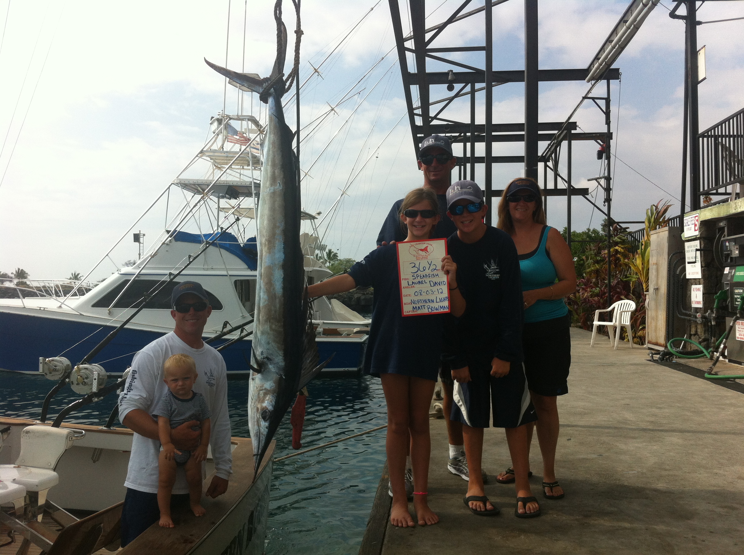 Laurel David caught a 36and a half pound Spearfish with Capt Mat and dad Capt Jimmy. They went out for an afternoon troll while I was out with the Binneys on the 37 and caught Laurel her 5th potential IGFA record for her age. it is her second on the trip on the Northern Lights. Her brother James wired and gaffed the spear when Capt Mat said to take it knowing it would be bigger than the record.The catch shows the great luck we have had on spearfish this summer. It has unusually consistent for us through the year. They are hard to predict when they will be here but we welcome them when they come.