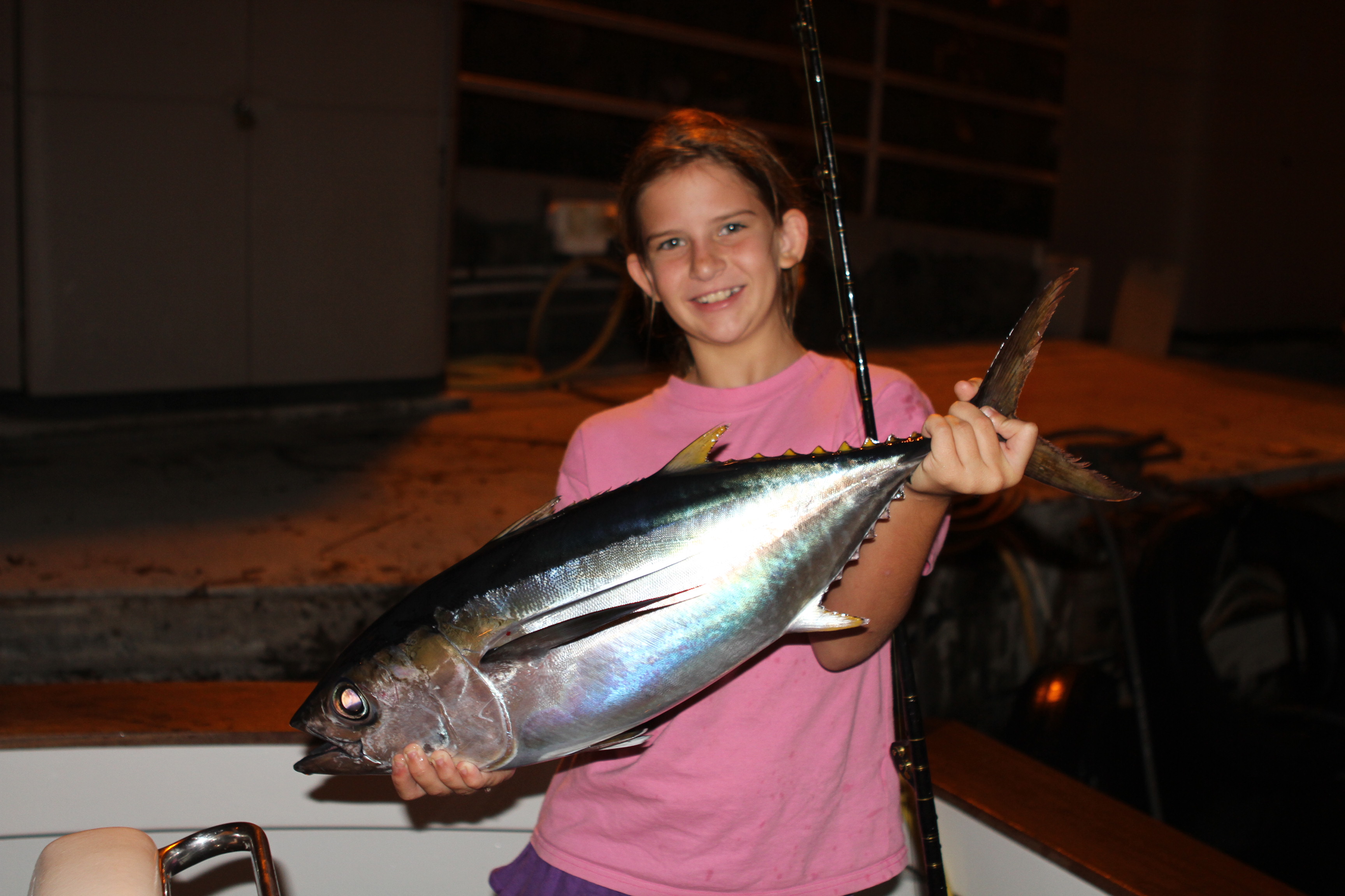 Laurel David caught another Potential World Record for the under 10 year old category. We actually fished the first day of the Skins tournament with Joe and Jim with no big bites The over all fishing for the fleet was really slow and with no “skins” caught it would be the first tag of the day that would take the daily. We had seen the Bigeye tuna at the buoy and the current record caught on the Northern Lights a few years ago by the Freeze family. Getting there late in the day the fish were shy and we had a hard time getting them to bite. After numerous gear changes Laurel caught this nice Bigeye over 10 pounds beating the current record by a couple pounds. Brother James helped with rigging gear and with the net to help her sister with her catch. This makes 4 records for Laurel and another record set on the Northern Lights! Congrats!
