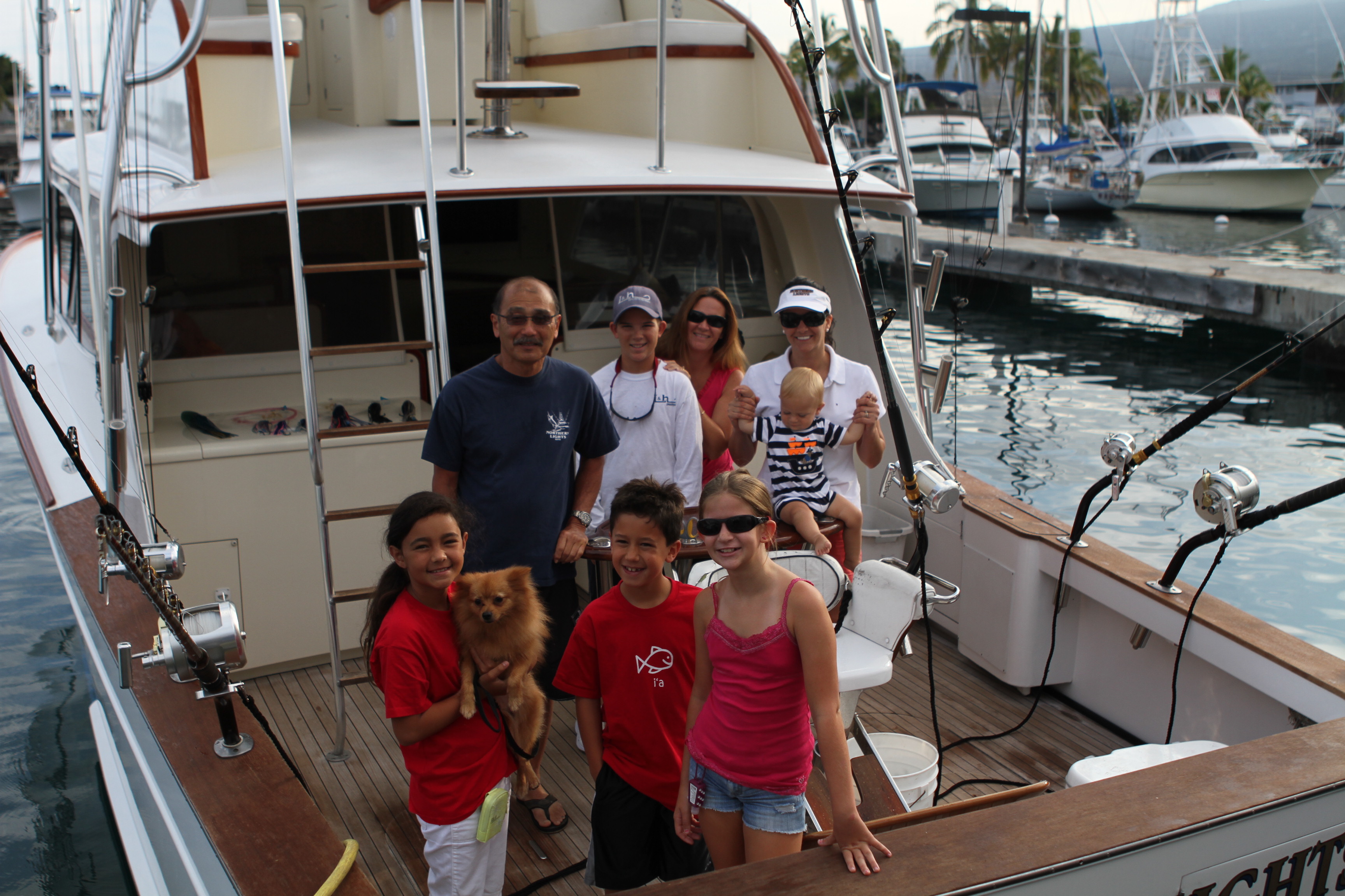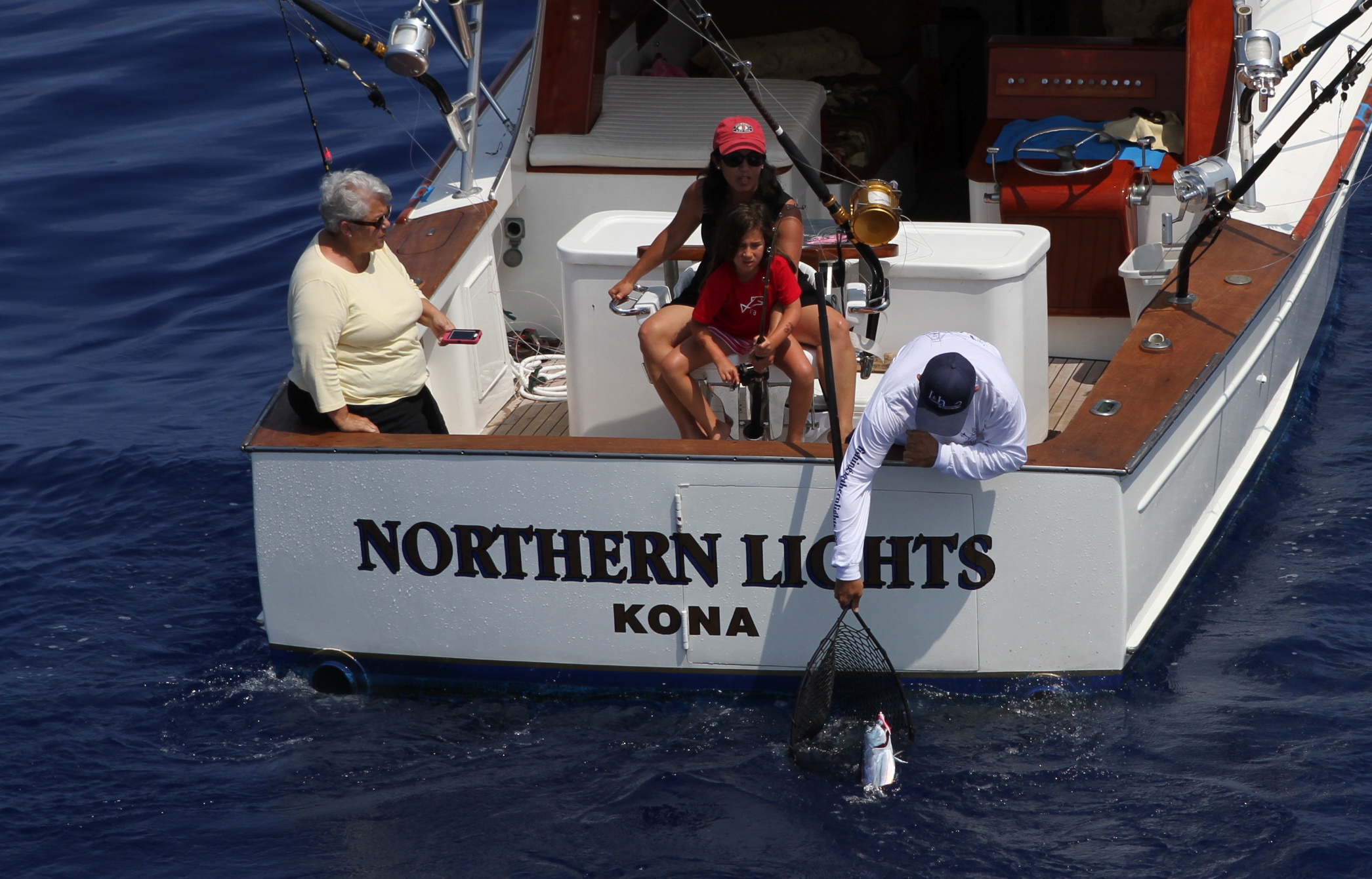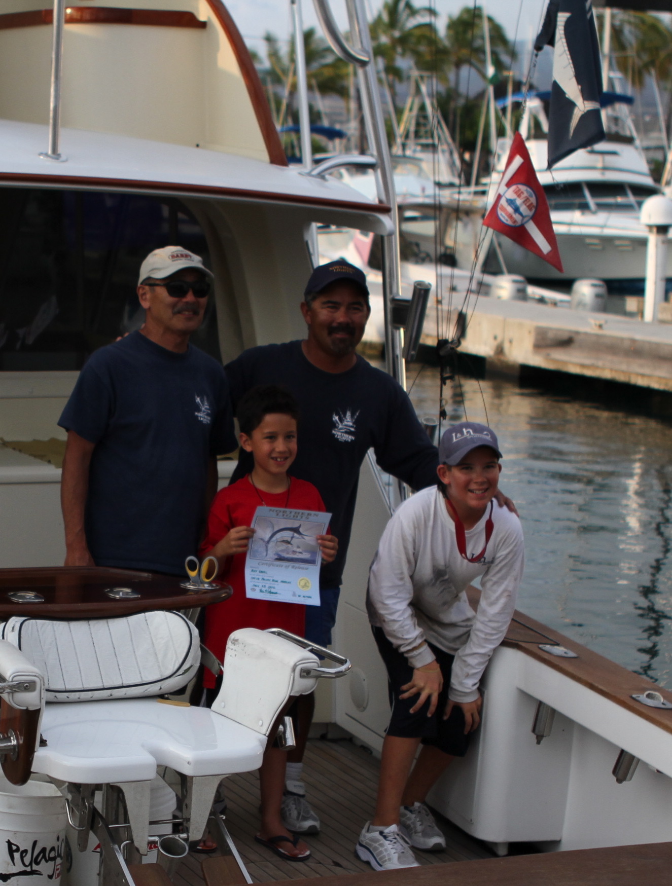The Northern Lights Keiki Tournament was a example of the right day for the right event. My mom picked the day and it proved to be the perfect day for the kids. The Northern Lights 40, Northern Lights 37 and the Lightspeed set out to get small fish for the keiki and what a day for that. Alex (age 9)my nephew caught his first blue wired by 13year old James David. Juliana Nakamaru(age 7) fought a small blue with Capt Mat and uncle Jimmy only to jump off after a bunch of jumps. Andrew(age 7) caught a nice otaro and a nice Ono. The 3 boats caught a total of 38 Mahi Mahi at 2 different floaters along with over a dozen aku caught by Gabriella Nakamaru (age 10), Laurel David (age 10),Obrey Weaver (age 9), Taylor Eberl(age 7)and Christopher David (age 4mo).