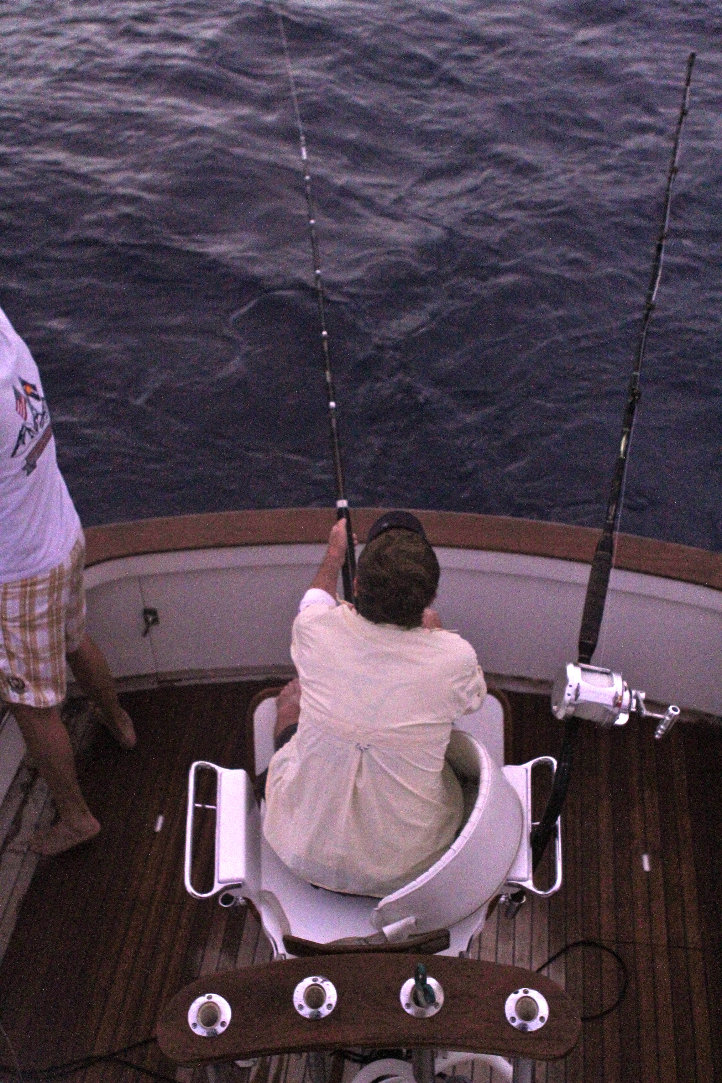 Peter Binney caught this blue before 6 am in the morning. It jumped a bunch at the boat but the light was so bad the shots weren’t great you can see how dark it is in the shots. we caught a magi soon after and missed 2 more blues that appeared to be hooked but jumped off. One trashed the hook rig. Can’t believe it came off. Here you see Mat on the 40 fighting one early filming a hunting show with Rick Westphal and Mike Rodgers. They needed one more fish for a show we started a couple of months ago. They got the fish they needed early getting the pressure off for the rest of the day.
