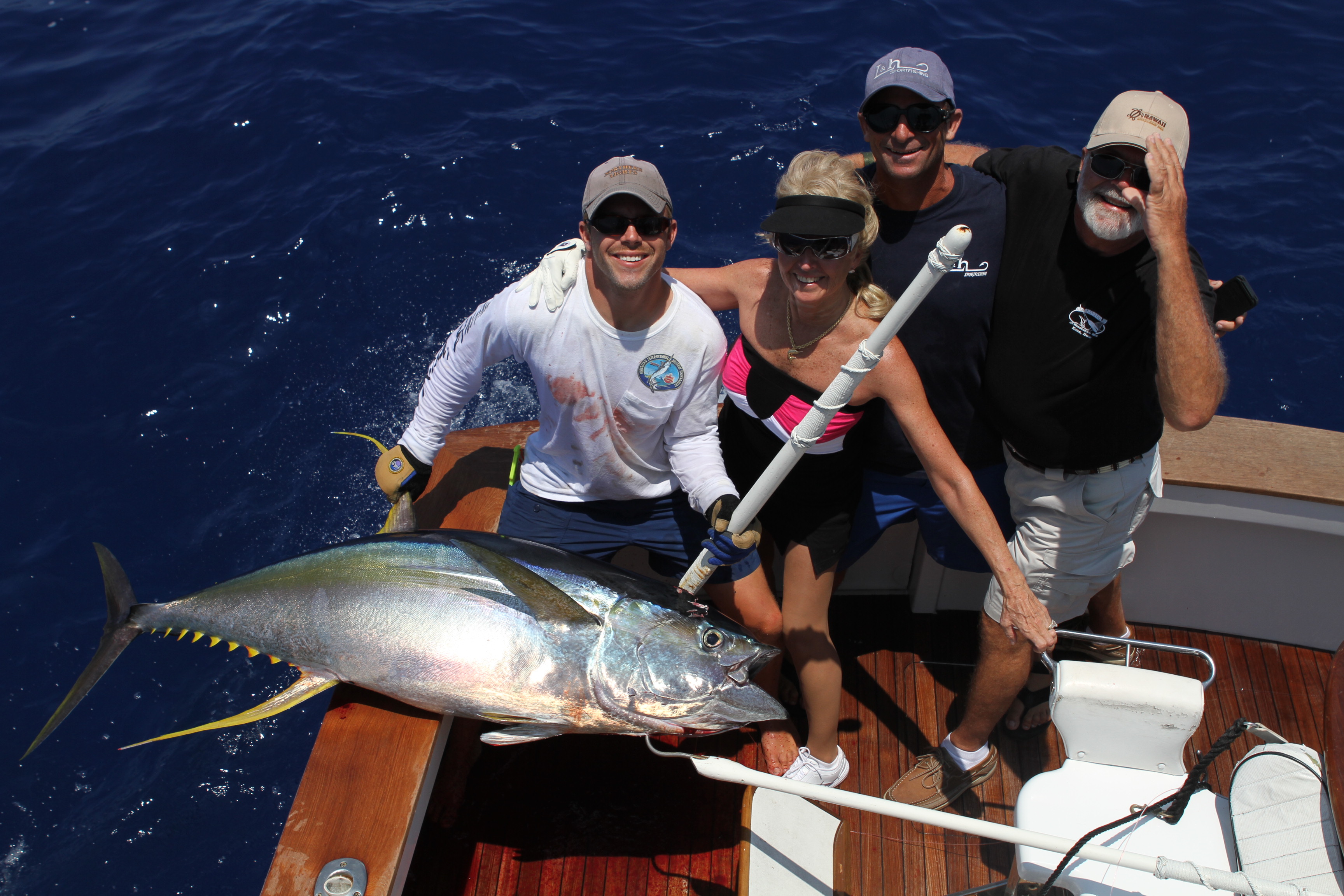 Our good friends Jim and Janet Baldwin fished with us again this year. Frequent anglers here in Kona the Baldwins have caught a ton of fish here on many of the top boats in the harbor. We have fished together many times over the years so it was great to see them again. We caught this nice tuna at Otec Buoy on a live bait. The buoy looked so good all day I thought for sure we would get a marlin or 2 there. We caught a few 30-40 pounders there but out big ahi was our only big bite of the day.